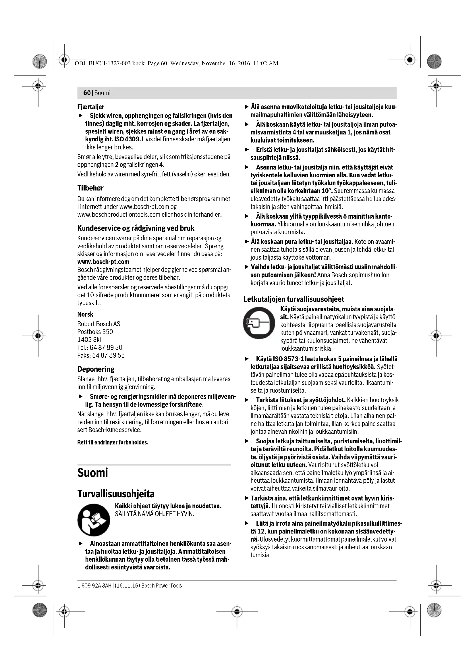 - Käytä suojakäsineitä ja pidä tukevasti kiinni kuusioko- loavaimesta, kun säädät kantokuormaa. Kantokuorman suurimmalla säädöllä kantokuormasäädön jousi on kovas- sa jännityksessä, joka voi purkaantua iskumaisesti, kun kuusiokoloavain painetaan sisään. Aseta kuusiokoloavain 9 säätöruuviin 29. Säätöruuvi vaikut- taa kantokuorman säädön 6 jousisalpaan. Palautusvoiman pienentämiseksi: kierrä kuusiokoloavainta 9 vastapäivään. Palautusvoiman suurentamiseksi: kierrä kuusiokoloavainta 9 myötäpäivään. – Mallissa 0 607 950 954 korkeintaan 11½ kierrosta. – Mallissa 0 607 950 955 korkeintaan 10 kierrosta. – Mallissa 0 607 950 956 korkeintaan 4¼ kierrosta. Malli 0 607 950 957 | Käytä suojakäsineitä ja pidä tukevasti kiinni kuusioko- loavaimesta, kun säädät kantokuormaa. Kantokuorman suurimmalla säädöllä kantokuormasäädön jousi on kovas- sa jännityksessä, joka voi purkaantua iskumaisesti, kun kuusiokoloavain painetaan sisään. Aseta kuusiokoloavain 9 kantokuorman säädön 6 jousisal- paan. Palautusvoiman pienentämiseksi: pain a jousisalpa sisään- päin ja kierrä kuusiokoloavainta 9 vastapäivään. Palautusvoiman suurentamiseksi: paina jousisalpa sisään- päin ja kierrä kuusiokoloavainta 9 myötäpäivään. – Mallissa 0 607 950 957 korkeintaan 11 kierrosta. – Mallissa 0 607 950 958 korkeintaan 5 kierrosta. Hoito ja huolto Huolto ja puhdistus Letkutaljat Katkaise ilman syöttö, ennen kuin teet huoltotöitä, suoritat kantokuorman säätöjä, liität tai irrotat paineil- matyökalun. Nämä turvatoimenpiteet estävät paineilma- työkalun tahattoman käynnistyksen. Tarkista päivittäin, ettei ripustuksessa tai putoamis- varmistimessa ole hapettumista tai vaurioita. Anna vä- hintään kerran vuodessa asiantuntijan tarkistaa letku- talja ja erityisesti paineilmaletku kulloinkin voimassaolevien kansallisten määräysten mukaisesti. Jos letkutaljassa on vaurio, sitä ei enää saa käyttää. Voitele kaikki ulkoiset liikkuvat osat, kuten ripustuksen 2 kit- kakohdat ja putoamisvarmistin 4. Puhdista säännöllisesti letkutaljan ilman syöttöaukossa oleva sihti. Kierrä irti letkunippa 14 ja poista pöly- ja likahiukkaset sihdistä. Kierrä sitten letkunippa uudelleen kiinni. Jotta letkutaljan sisällä olevat venttiilit eivät vaurioituisi, kiin- nitä ja irrota letkunippa 14 pitämällä vastaan kiintoavaimella (avainväli 17 mm) ilman syöttöaukon liittimen 7 ulkonevasta osasta. Ota huomioon suositeltavat lisäykset paineil- maan, jotka mainitaan letkutaljassa käytetyn pai- neilmatyökalun käyttöohjeessa! Jousitaljat Tarkista päivittäin, ettei ripustuksessa tai putoamis- varmistimessa (jos olemassa) ole hapettumista tai vau- rioita. Anna vähintään kerran vuodessa asiantuntijan tarkistaa jousitalja ja erityisesti köysi ISO 4309 mukai- sesti. Jos jousitaljassa on vaurio, sitä ei enää saa käyttää. Voitele kaikki ulkoiset liikkuvat osat, kuten ripustuksen 2 kit- kakohdat ja putoamisvarmistin 4. Köyden hoito hapottomalla rasvalla (vaseliini) pidentää sen elinikää. Lisätarvikkeet Tarkempia tietoja laadukkaasta lisätarvikeohjelmasta löydät nettiosoitteista www.bosch-pt.com ja www.boschproductiontools.com tai kysy niitä lähimmästä erikoisliikkeestä. Asiakaspalvelu ja käyttöneuvonta Asiakaspalvelu vastaa tuotteesi korjausta ja huoltoa sekä va- raosia koskeviin kysymyksiin. Räjähdyspiirustuksia ja tietoja varaosista löydät myös osoitteesta: www.bosch-pt.com OBJ_BUCH-1327-003.book Page 64 Wednesday, November 16, 2016 11:02 AMΕλληνικά | 65 Bosch Power Tools 1 609 92A 3AH | (16.11.16) Boschin asiakaspalvelu auttaa mielellään sinua tuotteitamme ja niiden lisätarvikkeita koskevissa kysymyksissä. Ilmoita kaikissa kyselyissä ja varaosatilauksissa 10-numeroi- nen tuotenumero, joka on ilmoitettu tuotteen mallikilvessä. Suomi Robert Bosch Oy Bosch-keskushuolto Pakkalantie 21 A 01510 Vantaa Voitte tilata varaosat suoraan osoitteesta www.bosch-pt.fi. Puh.: 0800 98044 Faksi: 010 296 1838 www.bosch.fi Hävitys Toimita letku- ja jousitalja, lisätarvikkeet ja pakkaus ympäris- töystävälliseen uusiokäyttöön. Voitelu- ja puhdistusaineet on hävitettävä ympäris- töystävällisesti. Muista lakisääteiset määräykset. Kun letku- tai jousitaljasi ei enää ole toimintakelpoinen vie se kierrätyskeskukseen tai palauta se myyjäliikkeeseen esim. valtuutettuun Bosch-huoltopisteeseen. Oikeus teknisiin muutoksiin pidätetään. p. 958