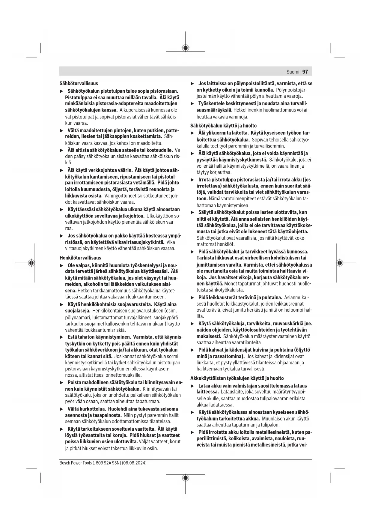For å markere de forskjellige dreiemomentene som er stilt inn kan du bytte ut markeringsringen (17) med en markeringsring med en annen farge. – Trykk av markeringsringen (17) med en tynn skrutrekker, en spatel eller lignende. Inn-/utkobling Skrumaskinene har en dreiemomentavhengig utkoblingsclutch som kan stilles inn i det angitte området. Den aktiveres når det innstilte dreiemomentet er nådd. – For å slå på elektroverktøyet trykker du på-/av- bryteren(10) inn til stoppunktet. – Elektroverktøyet slås automatisk av når det innstilte dreiemomentet er nådd. u Hvis på-/av-bryteren(10) slippes for tidlig, blir ikke det forhåndsinnstilte dreiemomentet nådd. u Kontroller dreiemomentet jevnlig på skruforbindelsen, og still eventuelt inn utkoblingsclutchen på nytt. Slå på arbeidslyset Arbeidslyset (13) gir mulighet til belysning av arbeidsstedet ved ugunstige lysforhold. Du slår på arbeidslyset (13) ved å trykke lett på på-/av-bryteren (10). Hvis du trykker hardere på på-/av-bryteren, slås elektroverktøyet på og arbeidslyset fortsetter å lyse. u Ikke se rett inn i arbeidslyset, ettersom du kan bli blendet. Informasjon om bruk u Sett elektroverktøyet bare mot mutteren/skruen når det er slått av. Innsatsverktøy som dreier seg kan skli. Visning av skruforbindelser (grønn/rød LED) Utkoblingsclutchen utløses når det forhåndsinnstilte dreiemomentet er nådd. LED-indikatoren (7) lyser grønt. Hvis det forhåndsinnstilte dreiemomentet ikke er nådd, lyser LED-indikatoren (7) rødt, og det utløses en varsellyd. Skruingen må gjentas. Beskyttelse mot repetisjon Hvis utkoblingsclutchen utløses under skruing, slås motoren av. Det er ikke mulig å slå på igjen før det har gått 0,7 sekunder. Dermed unngår du at skrueforbindelser som allerede er skrudd fast, strammes igjen ved en feiltagelse. Service og vedlikehold Vedlikehold og rengjøring u Ta alltid batteriet ut av elektroverktøyet før arbeid på elektroverktøyet (foreksempel vedlikehold, bytte av verktøy, osv.). Det er fare for personskader hvis du trykker på av/på-bryteren ved en feiltagelse. u Hold selve elektroverktøyet og ventilasjonsspaltene alltid rene, for å kunne arbeide bra og sikkert. Smøring av elektroverktøyet Smøremiddel: Spesialsmøring for girkasser (225 ml) Artikkelnummer 3 605 430 009 Molykote smørefett Motorolje SAE 10/SAE 20 Bosch Power Tools 1 609 92A 9SN | (06.08.2024)96 | Suomi – Rengjør giret med et mildt løsemiddel etter de 150 første driftstimene. Følg løsemiddelprodusentens anvisninger for bruk og avfallsbehandling. Smør deretter giret med Bosch spesialsmøring for girkasser. Gjenta rengjøringen 300 driftstimer etter den første rengjøringen. – Olje de bevegelige delene i utkoblingsclutchen etter 100000 skruinger med noen dråper motorolje SAE 10/ SAE 20. Smør de glidende og rullende delene med Molykote-smørefett. Kontroller samtidig clutchen for slitasje, slik at du er sikker på at repeterbarheten og nøyaktigheten ikke er redusert. Deretter må dreiemomentet til clutchen stilles inn på nytt. u Overlat alt vedlikehold og alle reparasjoner til kvalifiserte fagpersoner. På den måten opprettholdes elektroverktøyets sikkerhet. Et autorisert Bosch-serviceverksted utfører disse arbeidene raskt og pålitelig. u Kast smøre- og rengjøringsmidler miljøvennlig. Følg gjeldende forskrifter. u Inspiser hele elektroverktøyet for skader og slitasje og kontroller alle funksjonene senest hver 100000 skruing. Still deretter inn dreiemomentet til clutchen på nytt. Kundeservice og kundeveiledning Kundeservice hjelper deg ved spørsmål om reparasjon og vedlikehold av produktet ditt og reservedelene. Sprengskisser og informasjoner om reservedeler finner du også på: www.bosch‑pt.com Bosch rådgivningsteam står til tjeneste ved spørsmål om våre produkter og tilbehør til disse. Ved alle forespørsler og reservedelsbestillinger må du oppgi det 10‑sifrede produktnummeret som er angitt på produktets typeskilt. Norsk Robert Bosch AS Postboks 350 1402 Ski Tel.: 64 87 89 50 Faks: 64 87 89 55 Flere serviceadresser finner du på: www.bosch-pt.com/serviceaddresses Transport De anbefalte Li-ion-batteriene underligger kravene for farlig gods. Batteriene kan transporteres på veier av brukeren uten ytterligere krav. Ved forsendelse som utføres av tredjepersoner (f.eks.: lufttransport eller spedisjon) må det oppfylles spesielle krav til emballasje og merking. Du må da konsultere en ekspert for farlig gods ved forberedelse av forsendelsen. Send batterier kun hvis huset ikke er skadet. Lim igjen de åpne kontaktene og pakk batteriet slik at det ikke beveger seg i emballasjen. Følg også eventuelle ytterligere nasjonale forskrifter. Deponering Elektroverktøy, batterier, tilbehør og emballasje må leveres inn til miljøvennlig gjenvinning. Elektroverktøy og batterier må ikke kastes i vanlig søppel! Bare for land i EU: Elektroverktøy som ikke lenger er i brukbar stand, og defekte eller forbrukte oppladbare batterier/engangsbatterier, skal leveres til kildesortering. Bruk innsamlingssystemene som er beregnet for dette formålet. Ved usakkyndig kassering kan brukte elektriske og elektroniske apparater, hvis de inneholder farlige stoffer, ha skadelige utvirkninger på miljøet og den menneskelige helsen. (Oppladbare) batterier: Li-ion: Se informasjonen i avsnittet Transport (se „Transport“, Side96). Suomi Turvallisuusohjeet Yleiset sähkötyökalujen turvaohjeet VAROITUS Lue kaikki tämän sähkötyökalun mukana toimitetut varoitukset, oh- jeet, kuvat ja tekniset tiedot. Alla mainittujen ohjeiden noudattamisen laiminlyönti saattaa aiheuttaa sähköiskun, tu- lipalon ja/tai vakavan loukkaantumisen. Säilytä kaikki turvallisuusohjeet ja muut ohjeet tulevai- suutta varten. Turvallisuusohjeissa käytetty käsite "sähkötyökalu" käsittää verkkokäyttöisiä sähkötyökaluja (verkkojohdolla) ja akku- käyttöisiä sähkötyökaluja (ilman verkkojohtoa). T