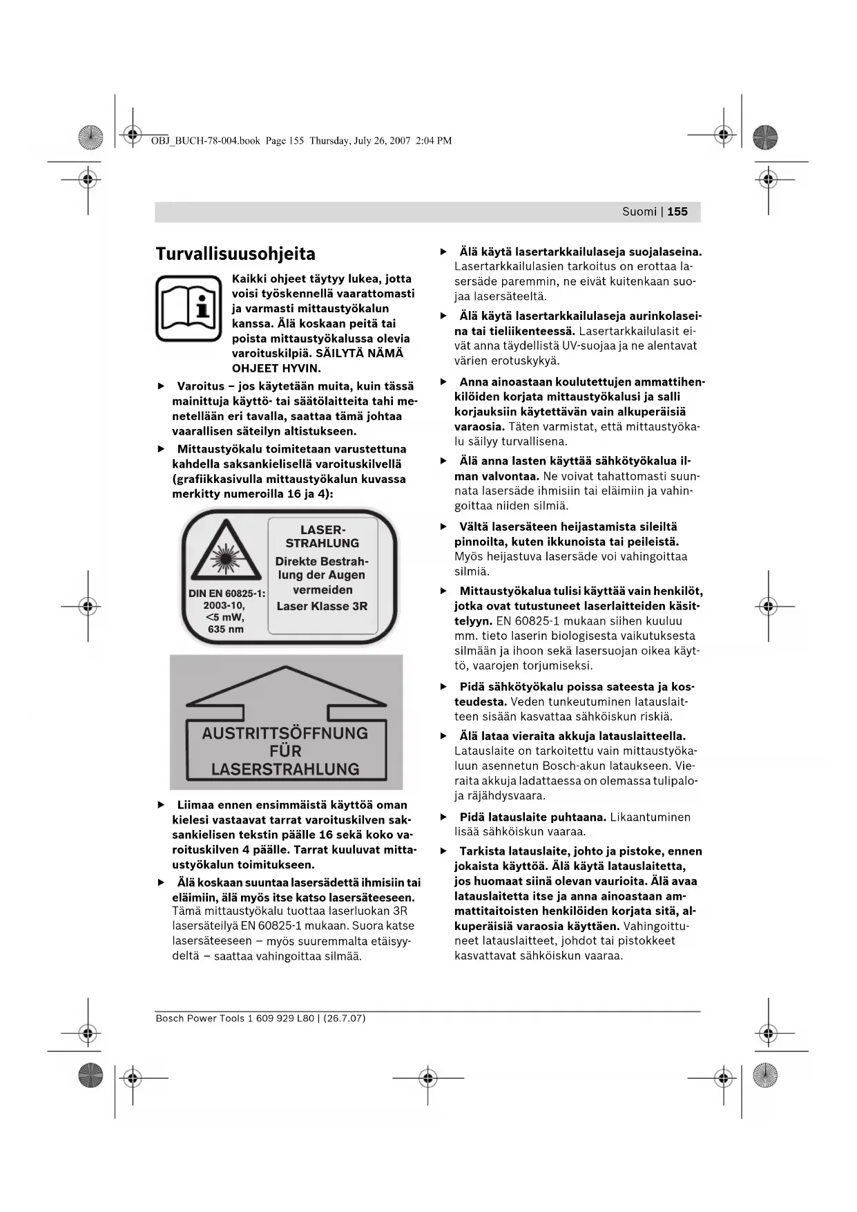 Turvallisuusohjeita Kaikki ohjeet täytyy lukea, jotta voisi työskennellä vaarattomasti ja varmasti mittaustyökalun kanssa. Älä koskaan peitä tai poista mittaustyökalussa olevia varoituskilpiä. SÄILYTÄ NÄMÄ OHJEET HYVIN. f Varoitus – jos käytetään muita, kuin tässä mainittuja käyttö- tai säätölaitteita tahi me- netellään eri tavalla, saattaa tämä johtaa vaarallisen säteilyn altistukseen. f Mittaustyökalu toimitetaan varustettuna kahdella saksankielisellä varoituskilvellä (grafiikkasivulla mittaustyökalun kuvassa merkitty numeroilla 16 ja 4): f Liimaa ennen ensimmäistä käyttöä oman kielesi vastaavat tarrat varoituskilven sak- sankielisen tekstin päälle 16 sekä koko va- roituskilven 4 päälle. Tarrat kuuluvat mitta- ustyökalun toimitukseen. f Älä koskaan suuntaa lasersädettä ihmisiin tai eläimiin, älä myös itse katso lasersäteeseen. Tämä mittaustyökalu tuottaa laserluokan 3R lasersäteilyä EN 60825-1 mukaan. Suora katse lasersäteeseen – myös suuremmalta etäisyy- deltä – saattaa vahingoittaa silmää. f Älä käytä lasertarkkailulaseja suojalaseina. Lasertarkkailulasien tarkoitus on erottaa la- sersäde paremmin, ne eivät kuitenkaan suo- jaa lasersäteeltä. f Älä käytä lasertarkkailulaseja aurinkolasei- na tai tieliikenteessä. Lasertarkkailulasit ei- vät anna täydellistä UV-suojaa ja ne alentavat värien erotuskykyä. f Anna ainoastaan koulutettujen ammattihen- kilöiden korjata mittaustyökalusi ja salli korjauksiin käytettävän vain alkuperäisiä varaosia. Täten varmistat, että mittaustyöka- lu säilyy turvallisena. f Älä anna lasten käyttää sähkötyökalua il- man valvontaa. Ne voivat tahattomasti suun- nata lasersäde ihmisiin tai eläimiin ja vahin- goittaa niiden silmiä. f Vältä lasersäteen heijastamista sileiltä pinnoilta, kuten ikkunoista tai peileistä. Myös heijastuva lasersäde voi vahingoittaa silmiä. f Mittaustyökalua tulisi käyttää vain henkilöt, jotka ovat tutustuneet laserlaitteiden käsit- telyyn. EN 60825-1 mukaan siihen kuuluu mm. tieto laserin biologisesta vaikutuksesta silmään ja ihoon sekä lasersuojan oikea käyt- tö, vaarojen torjumiseksi. f Pidä sähkötyökalu poissa sateesta ja kos- teudesta. Veden tunkeutuminen latauslait- teen sisään kasvattaa sähköiskun riskiä. f Älä lataa vieraita akkuja latauslaitteella. Latauslaite on tarkoitettu vain mittaustyöka- luun asennetun Bosch-akun lataukseen. Vie- raita akkuja ladattaessa on olemassa tulipalo- ja räjähdysvaara. f Pidä latauslaite puhtaana. Likaantuminen lisää sähköiskun vaaraa. f Tarkista latauslaite, johto ja pistoke, ennen jokaista käyttöä. Älä käytä latauslaitetta, jos huomaat siinä olevan vaurioita. Älä avaa latauslaitetta itse ja anna ainoastaan am- mattitaitoisten henkilöiden korjata sitä, al- kuperäisiä varaosia käyttäen. Vahingoittu- neet latauslaitteet, johdot tai pistokkeet kasvattavat sähköiskun vaaraa. DIN EN 60825-1:2003-10, <5 mW, 635 nm LASER- STRAHLUNG Direkte Bestrah- lung der Augen vermeiden Laser Klasse 3R AUSTRITTSÖFFNUNG FÜR LASERSTRAHLUNG OBJ_BUCH-78-004.book Page 155 Thursday, July 26, 2007 2:04 PM156 | Suomi 1 609 929 L80 | (26.7.07) Bosch Power Tools f Älä käytä latauslaitetta helposti palavalla alustalla (esim. paperi, kangas jne.) tai pala- vassa ympäristössä. Latauslaitteen kuume- neminen latauksen aikana synnyttää tulipalo- vaaran. f Väärästä käytöstä johtuen, akusta saattaa vuotaa nestettä. Vältä koskettamasta nes- tettä. Jos nestettä vahingossa joutuu iholle, huuhtele kosketuskohta vedellä. Jos nes- tettä pääsee silmiin, tarvitaan tämän lisäksi lääkärin apua. Akusta vuotava neste saattaa aiheuttaa ärsytystä ja palovammoja. Toimintaselostus Käännä auki taittosivu, jossa on mittauslaitteen kuva ja pidä se uloskäännettynä lukiessasi käyt- töohjetta. Määräyksenmukainen käyttö Mittaustyökalu on tarkoitettu täsmälleen vaaka- tasoisten korkeusjuoksujen, pystysuorien linjo- jen, rajaviivojen ja kantapisteiden määrittämi- seen ja tarkistamiseen, sisä- ja ulkotilassa. Kuvassa olevat osat Kuvassa olevien osien numerointi viittaa grafiik- kasivussa olevaan mittaustyökalun kuvaan. 1 Vesivaaka 2 Kaukosäätimen vastaanottolinssi 3 Latauspistokkeen liitin 4 Lasersäteen ulostuloaukon varoituskilpi 5 Lasersäteen ulostuloaukko 6 Y-akselin merkki 7 X-akselin merkki 8 Luotisäde 9 Säädettävä lasersäde 10 X-akselin luotiurat 11 Y-akselin luotiurat 12 Paristokotelon kannen lukitus 13 Paristokotelon kansi 14 Kumijalka 15 Akku 16 Laser-varoituskilpi 17 Jalustan kiinnitys 5/8" (vaakasuora ja pysty- suora) 18 Sarjanumero 19 Vakioviivan ja viivan pituuden valintanäppäin 20 Suuntausnäppäin ylös 21 Suuntausnäppäin vasemmalle 22 Pyörintäkäytön ja pyörintänopeuden valin- tanäppäin 23 Suuntausnäppäin alas 24 Suuntausnäppäin oikealle 25 Manuaalisen vaaituksen osoitus ”man” 26 Automaattisen vaaituksen osoitus ”auto” 27 Akun lataustilanäyttö 28 ”man/auto”-näppäin vaaitusautomatiikan poiskytkemiseksi 29 Käynnistyspainike 30 Rakennuslaserin mittatanko* 31 Lasertarkkailulasit 32 Seinäpidike/suuntausyksikkö* 33 5/8"-ruuvi seinäpidikkeessä* 34 Suuntausyksikön ruuvit* 35 Mittauslaatta ja jalka 36 Kattomittauslaatta* 37 Kallistuskiila* 38 Suurtehovastaanotin ja pidike 39 Kaukosäädin 40 Jalusta* 41 Latauspistoke 42 Latauslaite 43 Laukku *Kuvassa tai selostuksessa esiintyvä lisätarvike ei kuulu vakiotoimitukseen. OBJ_BUCH-78-004.book Page 156 Thursday, July 26, 2007 2:04 PMSuomi | 157 Bosch Power Tools 1 609 929 L80 | (26.7.07) Tekniset tiedot Rakennuslaser BL 200 GC Professional Tuotenumero 3 601 K15 000 Työskentelyalue (säde)