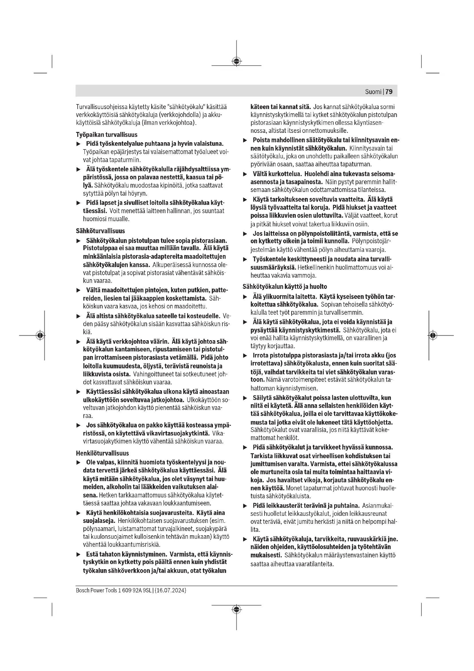 Käytä sähkötyökalua aina merkintärenkaan kanssa, jotta runko on suojattu varmasti pölyltä ja lialta. Omien vääntömomenttivalintojen merkitsemiksi voit vaihtaa merkintärenkaan (16) tilalle erivärisen merkintärenkaan. – Irrota merkintärengas (16) ohuella ruuvitaltalla, lastalla, tms. työkalulla. Käynnistys ja pysäytys Ruuvinvääntimissä on vääntömomentista riip- puva katkaisukytkin, jonka voi säätää ilmoite- tun alueen rajoissa. Se reagoi, kun valittu vään- tömomentti on saavutettu. – Käynnistä sähkötyökalu painamalla käynnistyskytkin(5)pohjaan. – Sähkötyökalu sammuu automaattisesti, kun valittu vääntömomentti on saavutettu. u Jos vapautat käynnistyskytkimen(5) liian aikaisin, valittua vääntömomenttia ei saavuteta. u Tarkista vääntömomentti säännöllisin väliajoin ruuvi- liitoksesta ja säädä tarvittaessa katkaisukytkintä. Työvalon sytyttäminen Työvalo (3) valaisee ruuvauskohdan tehokkaasti. Työvalo (3) syttyy, kun painat kevyesti käynnistyskytkintä (5). Kun painat käynnistyskytkintä voimakkaammin, sähkötyökalu käynnistyy ja työvalo palaa edelleen. u Älä katso suoraan työvaloon, koska se voi aiheuttaa häikäistymisen. Työskentelyohjeita u Aseta sähkötyökalun ruuvauskärki mutteriin/ruuviin vain kun moottori on sammutettu. Pyörivät käyttötar- vikkeet saattavat luiskahtaa irti ruuvista/mutterista. Ruuviliitoksen merkkivalo (vihreä/punainen LED-valo) Katkaisukytkin katkaisee voimansiirron, kun valittu vääntö- momentti saavutetaan. LED-merkkivalo (8) palaa vihreänä. Jos valittua vääntömomenttia ei ole saavutettu, LED-merkki- valo (8) palaa punaisena ja kuulet merkkiäänen. Ruuvaus täytyy tehdä uudelleen. Toistosuoja Jos katkaisukytkin on katkaissut ruuvattaessa voimansiirron, moottori sammuu. Moottorin voi käynnistää vasta 0,7 sekun- nin kuluttua uudelleen. Tällä tavalla estetään kiinnitetyn ruu- viliitoksen tahaton lisäkiristys. Hoito ja huolto Huolto ja puhdistus u Ota akku pois sähkötyökalusta, ennen kuin teet säh- kötyökaluun liittyviä töitä (esim. huolto, käyttötarvik- keen vaihto jne.). Käynnistyskytkimen tahaton painallus aiheuttaa loukkaantumisvaaran. u Pidä aina sähkötyökalua ja sen tuuletusaukot puh- taina, jotta voit työskennellä hyvin ja turvallisesti. Sähkötyökalun voitelu Voiteluaine: Vaihteiston erikoisrasva (225 ml) Tuotenumero 3 605 430 009 Molykoterasva Moottoriöljy SAE 10/SAE 20 – Vaihteisto on puhdistettava miedolla liuottimella ensim- mäisten 150 käyttötunnin jälkeen. Noudata liuottimen valmistajan antamia käyttö- ja hävitysohjeita. Voitele vaih- teisto tämän jälkeen Boschin erikoisrasvalla. Ensipuhdis- tuksen jälkeen puhdistus on tehtävä uudelleen 300 käyt- tötunnin välein. – Voitele katkaisukytkimen liikkuvat osat 100 000 ruuvauk- sen välein muutamalla öljypisaralla (käytä tähän mootto- riöljyä SAE 10/SAE 20). Voitele liukuvat ja pyörivät osat molykoterasvalla. Tarkasta samalla kytkimen kunto (mah- dolliset kulumat) ja kokeile, toimiiko kytkin asianmukai- sesti ja tarkasti. Lopuksi kytkimen vääntömomentti on säädettävä uudelleen. u Anna huolto- ja korjaustyöt vain valtuutetun ammatti- henkilökunnan tehtäväksi. Näin varmistat, että sähkö- työkalu pysyy turvallisena. Valtuutettu Bosch-huoltopiste suorittaa huolto- ja korjaus- työt nopeasti ja luotettavasti. u Voitelu- ja puhdistusaineet on hävitettävä ympäris- töystävällisesti. Huomioi lakimääräykset. u Tarkista vähintään 100 000 ruuvauskerran välein koko sähkötyökalu vaurioiden ja kulumisen varalta ja testaa kaikki toiminnot. Säädä sitten kytkimen vään- tömomentti uudelleen. Asiakaspalvelu ja käyttöneuvonta Asiakaspalvelu vastaa tuotteesi korjausta ja huoltoa sekä va- raosia koskeviin kysymyksiin. Räjähdyspiirustuksia ja tietoja varaosista löydät myös osoitteesta: www.bosch-pt.com Bosch-käyttöneuvontatiimi vastaa mielellään tuotteita ja tar- vikkeita koskeviin kysymyksiin. Ilmoita ehdottomasti kaikissa kyselyissä ja varaosatilauk- sissa 10‑numeroinen tuotenumero, joka on ilmoitettu tuot- teen mallikilvessä. 1 609 92A 9SL | (16.07.2024) Bosch Power ToolsΕλληνικά | 85 Suomi Robert Bosch Oy Bosch-keskushuolto Pakkalantie 21 A 01510 Vantaa Voitte tilata varaosat suoraan osoitteesta www.bosch-pt.fi. Puh.: 0800 98044 Faksi: 010 296 1838 www.bosch-pt.fi Lisää huoltoosoitteita löydät kohdasta: www.bosch-pt.com/serviceaddresses Kuljetus Toimitukseen kuuluvat litiumioniakut ovat vaara-ainelain määräysten alaisia. Käyttäjä saa kuljettaa akkuja kadulla il- man erikoistoimenpiteitä. Toimitettaessa sivullisen kautta (esim.: lentorahti tai huo- linta) on noudatettava pakkausta ja merkintää koskevia eri- koisvaatimuksia. Tällöin on lähetyksen valmistelussa käytet- tävä vaara-aineasiantuntijaa. Lähetä akkuja ainoastaan, jos kotelo on vaurioitumaton. Teippaa avoimet liittimet ja pakkaa akku niin, että se ei pääse liikkumaan pakkauksessa. Noudata myös mahdollisia pidem- mälle meneviä kansallisia määräyksiä. Hävitys Sähkötyökalut, akut, lisätarvikkeet ja pakkauk- set tulee toimittaa ympäristöystävälliseen uu- siokäyttöön. Älä heitä sähkötyökaluja tai akkuja/paristoja ta- lousjätteisiin! Koskee vain EU‑maita: Käytöstä poistetut sähkötyökalut sekä vialliset tai loppuun käytetyt akut/paristot on hävitettävä erikseen. Toimita ne asianmukaisiin keräyspisteisiin. Asiattomassa hävityksessä vanhoilla sähkö- ja elektroniikka- laitteilla voi olla vahingollisia vaikutuksia ympäristöön ja ih- misten terveyteen, johtuen niissä mahdollisesti esiintyvistä vaarallisista aineista. Akut/paristot: Li-Ion: Noudata luvussa "Kuljetus" annettuja ohjeita (katso "Kulje- tus", Sivu85).