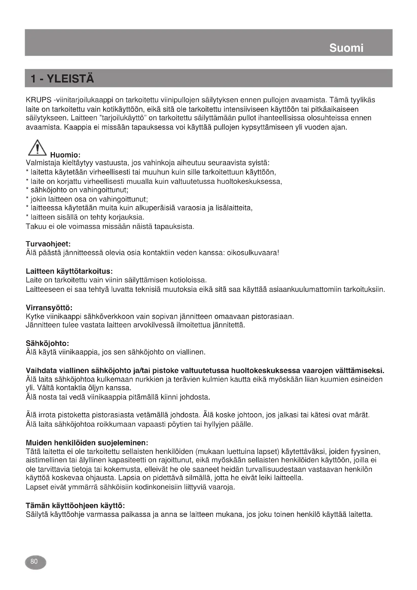- Se till att de finns minst 10 - 15 cm ventilation savstånd runt apparatens sidor. Cavea?vins.qxd:KM8005franc$ais-copie.qxd20/02/0915:44Page79Suomi KRUPS -viinitarjoilukaappi on tarkoitettu viinipullojen säilytyksen ennen pullojen avaamista. Tämä tyylikäs laite on tarkoitettu vain kotikäyttöön, eikä sitä ole tarkoitettu intensiiviseen käyttöön tai pitkäaikaiseen säilytykseen. Laitteen ”tarjoilukäyttö” on tarkoitettu säilyttämään pullot ihanteellisissa olosuhteissa ennen avaamista. Kaappia ei missään tapauksessa voi käyttää pullojen kypsyttämiseen yli vuoden ajan. Huomio: Valmistaja kieltäytyy vastuusta, jos vahinkoja aiheutuu seuraavista syistä: