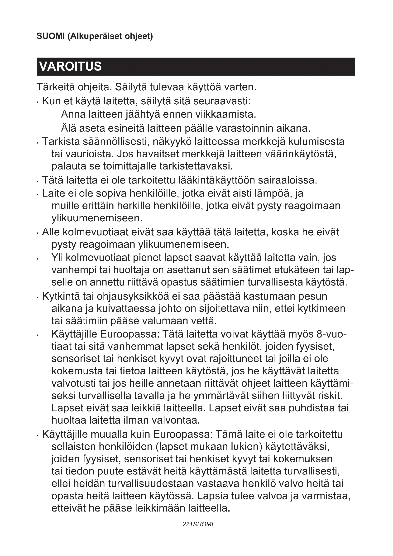 - Tätä laitetta ei suositella käytettäväksi lasten, vajaakykyisten tai lämmön tunnetta aistimat- tomien, kuten verenkiertohäiriöistä kärsivien henkilöiden toimesta.224 SUOMI