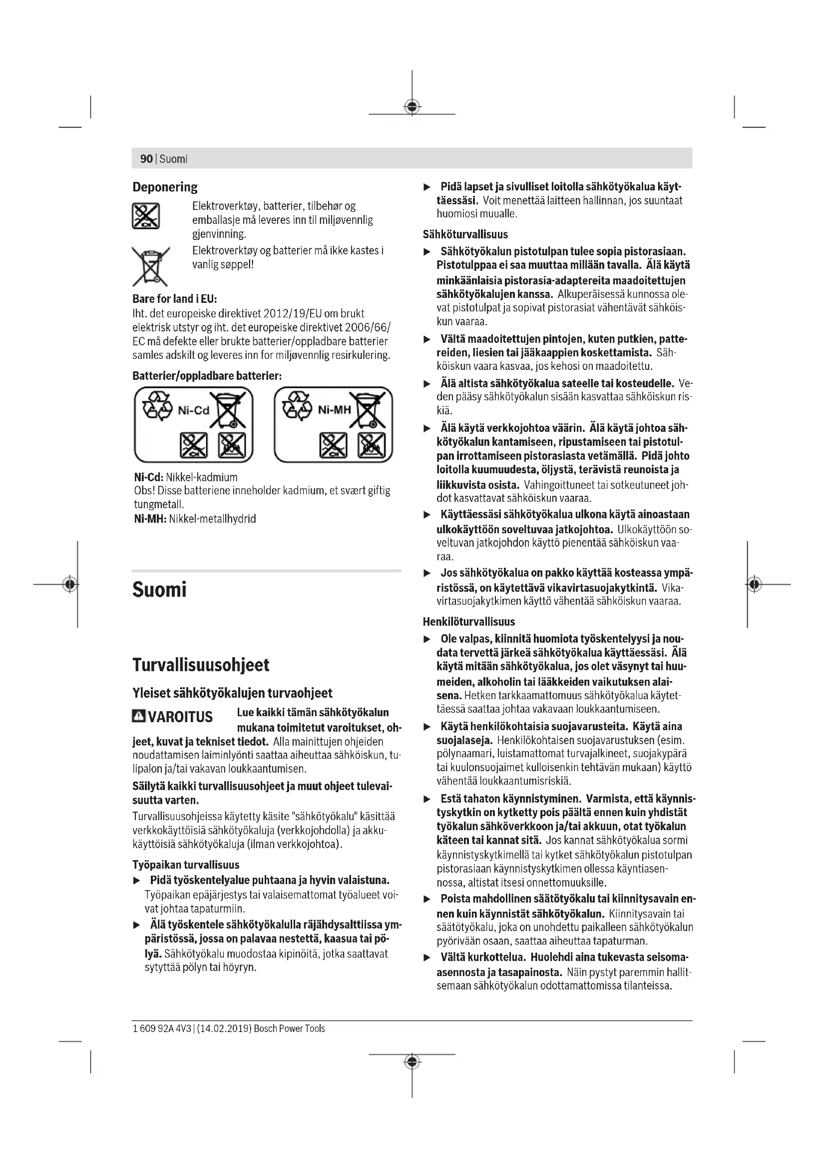 smørefett. Kontroller samtidig clutchen for slitasje, slik at du er sikker på at repeterbarheten og nøyaktigheten ikke er redusert. Deretter må dreiemomentet til clutchen stilles inn på nytt. u Overlat alt vedlikehold og alle reparasjoner til kvalifiserte fagpersoner. På den måten opprettholdes elektroverktøyets sikkerhet. Et autorisert Bosch-serviceverksted utfører disse arbeidene raskt og pålitelig. u Kast smøre- og rengjøringsmidler miljøvennlig. Følg gjeldende forskrifter. Kundeservice og kundeveiledning Kundeservice hjelper deg ved spørsmål om reparasjon og vedlikehold av produktet ditt og reservedelene. Du finner også sprengskisser og informasjon om reservedeler på www.bosch-pt.com Boschs kundeveilederteam hjelper deg gjerne hvis du har spørsmål om våre produkter og tilbehør. Ved alle forespørsler og reservedelsbestillinger må du oppgi det 10‑sifrede produktnummeret som er angitt på produktets typeskilt. Norsk Robert Bosch AS Postboks 350 1402 Ski Tel.: 64 87 89 50 Faks: 64 87 89 55 Bosch Power Tools 1 609 92A 4V3 | (14.02.2019)90 | Suomi Deponering Elektroverktøy, batterier, tilbehør og emballasje må leveres inn til miljøvennlig gjenvinning. Elektroverktøy og batterier må ikke kastes i vanlig søppel! Bare for land i EU: Iht. det europeiske direktivet 2012/19/EU om brukt elektrisk utstyr og iht. det europeiske direktivet 2006/66/ EC må defekte eller brukte batterier/oppladbare batterier samles adskilt og leveres inn for miljøvennlig resirkulering. Batterier/oppladbare batterier: Ni-Cd: Nikkel-kadmium Obs! Disse batteriene inneholder kadmium, et svært giftig tungmetall. Ni-MH: Nikkel-metallhydrid Suomi Turvallisuusohjeet Yleiset sähkötyökalujen turvaohjeet VAROITUS Lue kaikki tämän sähkötyökalun mukana toimitetut varoitukset, oh- jeet, kuvat ja tekniset tiedot. Alla mainittujen ohjeiden noudattamisen laiminlyönti saattaa aiheuttaa sähköiskun, tu- lipalon ja/tai vakavan loukkaantumisen. Säilytä kaikki turvallisuusohjeet ja muut ohjeet tulevai- suutta varten. Turvallisuusohjeissa käytetty käsite "sähkötyökalu" käsittää verkkokäyttöisiä sähkötyökaluja (verkkojohdolla) ja akku- käyttöisiä sähkötyökaluja (ilman verkkojohtoa). Työpaikan turvallisuus u Pidä työskentelyalue puhtaana ja hyvin valaistuna. Työpaikan epäjärjestys tai valaisemattomat työalueet voi- vat johtaa tapaturmiin. u Älä työskentele sähkötyökalulla räjähdysalttiissa ym- päristössä, jossa on palavaa nestettä, kaasua tai pö- lyä. Sähkötyökalu muodostaa kipinöitä, jotka saattavat sytyttää pölyn tai höyryn. u Pidä lapset ja sivulliset loitolla sähkötyökalua käyt- täessäsi. Voit menettää laitteen hallinnan, jos suuntaat huomiosi muualle. Sähköturvallisuus u Sähkötyökalun pistotulpan tulee sopia pistorasiaan. Pistotulppaa ei saa muuttaa millään tavalla. Älä käytä minkäänlaisia pistorasia-adaptereita maadoitettujen sähkötyökalujen kanssa. Alkuperäisessä kunnossa ole- vat pistotulpat ja sopivat pistorasiat vähentävät sähköis- kun vaaraa. u Vältä maadoitettujen pintojen, kuten putkien, patte- reiden, liesien tai jääkaappien koskettamista. Säh- köiskun vaara kasvaa, jos kehosi on maadoitettu. u Älä altista sähkötyökalua sateelle tai kosteudelle. Ve- den pääsy sähkötyökalun sisään kasvattaa sähköiskun ris- kiä. u Älä käytä verkkojohtoa väärin. Älä käytä johtoa säh- kötyökalun kantamiseen, ripustamiseen tai pistotul- pan irrottamiseen pistorasiasta vetämällä. Pidä johto loitolla kuumuudesta, öljystä, terävistä reunoista ja liikkuvista osista. Vahingoittuneet tai sotkeutuneet joh- dot kasvattavat sähköiskun vaaraa. u Käyttäessäsi sähkötyökalua ulkona käytä ainoastaan ulkokäyttöön soveltuvaa jatkojohtoa. Ulkokäyttöön so- veltuvan jatkojohdon käyttö pienentää sähköiskun vaa- raa. u Jos sähkötyökalua on pakko käyttää kosteassa ympä- ristössä, on käytettävä vikavirtasuojakytkintä. Vika- virtasuojakytkimen käyttö vähentää sähköiskun vaaraa. Henkilöturvallisuus u Ole valpas, kiinnitä huomiota työskentelyysi ja nou- data tervettä järkeä sähkötyökalua käyttäessäsi. Älä käytä mitään sähkötyökalua, jos olet väsynyt tai huu- meiden, alkoholin tai lääkkeiden vaikutuksen alai- sena. Hetken tarkkaamattomuus sähkötyökalua käytet- täessä saattaa johtaa vakavaan loukkaantumiseen. u Käytä henkilökohtaisia suojavarusteita. Käytä aina suojalaseja. Henkilökohtaisen suojavarustuksen (esim. pölynaamari, luistamattomat turvajalkineet, suojakypärä tai kuulonsuojaimet kulloisenkin tehtävän mukaan) käyttö vähentää loukkaantumisriskiä. u Estä tahaton käynnistyminen. Varmista, että käynnis- tyskytkin on kytketty pois päältä ennen kuin yhdistät työkalun sähköverkkoon ja/tai akkuun, otat työkalun käteen tai kannat sitä. Jos kannat sähkötyökalua sormi käynnistyskytkimellä tai kytket sähkötyökalun pistotulpan pistorasiaan käynnistyskytkimen ollessa käyntiasen- nossa, altistat itsesi onnettomuuksille. u Poista mahdollinen säätötyökalu tai kiinnitysavain en- nen kuin käynnistät sähkötyökalun. Kiinnitysavain tai säätötyökalu, joka on unohdettu paikalleen sähkötyökalun pyörivään osaan, saattaa aiheuttaa tapaturman. u Vältä kurkottelua. Huolehdi aina tukevasta seisoma- asennosta ja tasapainosta. Näin pystyt paremmin hallit- semaan sähkötyökalun odottamattomissa tilanteissa. 1 609 92A 4V3 | (14.02.2019) Bosch Power ToolsSuomi | 91 u Käytä tarkoitukseen soveltuvia vaatteita. Älä käytä löysiä työvaatteita tai koruja. Pidä hiukset ja vaatteet poissa liikkuvien osien ulottuvilta. Väljät vaatteet, korut ja pitkät hiukset voivat takertua liikkuviin osiin. u Jos laitteissa on pölynpoistoliitäntä, varmista, että se on kytketty oikein ja toimii kunnolla. Pölynpoistojär- jestelmän käyttö vähentää pölyn aiheuttamia vaaroja. u Työskentele keskittyneest