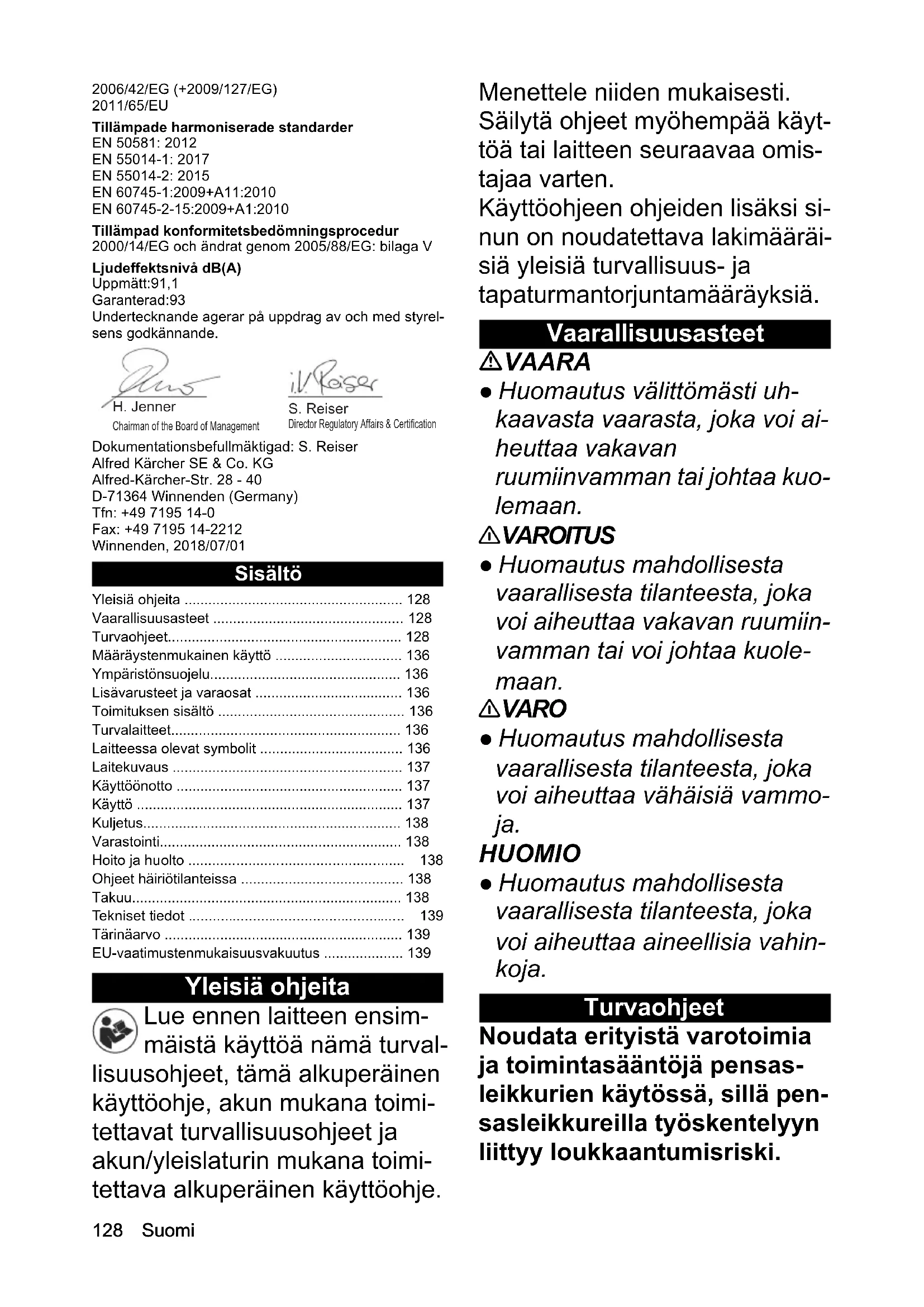 - Skärknivslängd mm 450 Vikt (utan batteripaket) kg 2,55128 Suomi 2006/42/EG (+2009/127/EG) 2011/65/EU Tillämpade harmoniserade standarder EN 50581: 2012 EN 55014-1: 2017 EN 55014-2: 2015 EN 60745-1:2009+A11:2010 EN 60745-2-15:2009+A1:2010 Tillämpad konformitetsbedömningsprocedur 2000/14/EG och ändrat genom 2005/88/EG: bilaga V Ljudeffektsnivå dB(A) Uppmätt:91,1 Garanterad:93 Undertecknande agerar på uppdrag av och med styrel- sens godkännande. Dokumentationsbefullmäktigad: S. Reiser Alfred Kärcher SE & Co. KG Alfred-Kärcher-Str. 28 - 40 D-71364 Winnenden (Germany) Tfn: +49 7195 14-0 Fax: +49 7195 14-2212 Winnenden, 2018/07/01 Sisältö Yleisiä ohjeita Lue ennen laitteen ensim- mäistä käyttöä nämä turval- lisuusohjeet, tämä alkuperäinen käyttöohje, akun mukana toimi- tettavat turvallisuusohjeet ja akun/yleislaturin mukana toimi- tettava alkuperäinen käyttöohje. Menettele niiden mukaisesti. Säilytä ohjeet myöhempää käyt- töä tai laitteen seuraavaa omis- tajaa varten. Käyttöohjeen ohjeiden lisäksi si- nun on noudatettava lakimääräi- siä yleisiä turvallisuus- ja tapaturmantorjuntamääräyksiä. Vaarallisuusasteet VAARA ● Huomautus välittömästi uh- kaavasta vaarasta, joka voi ai- heuttaa vakavan ruumiinvamman tai johtaa kuo- lemaan. 몇 VAROITUS ● Huomautus mahdollisesta vaarallisesta tilanteesta, joka voi aiheuttaa vakavan ruumiin- vamman tai voi johtaa kuole- maan. 몇 VARO ● Huomautus mahdollisesta vaarallisesta tilanteesta, joka voi aiheuttaa vähäisiä vammo- ja. HUOMIO ● Huomautus mahdollisesta vaarallisesta tilanteesta, joka voi aiheuttaa aineellisia vahin- koja. Turvaohjeet Noudata erityistä varotoimia ja toimintasääntöjä pensas- leikkurien käytössä, sillä pen- sasleikkureilla työskentelyyn liittyy loukkaantumisriski. Yleisiä ohjeita p. 128
