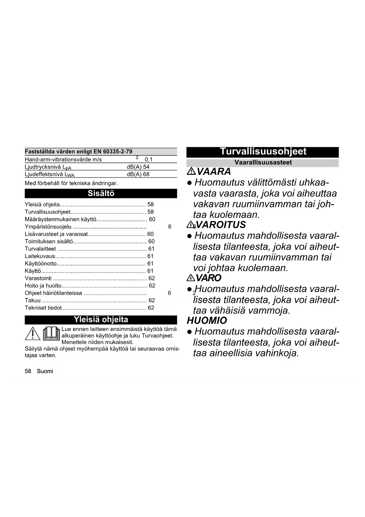 - Turvallisuusohjeet p. 58