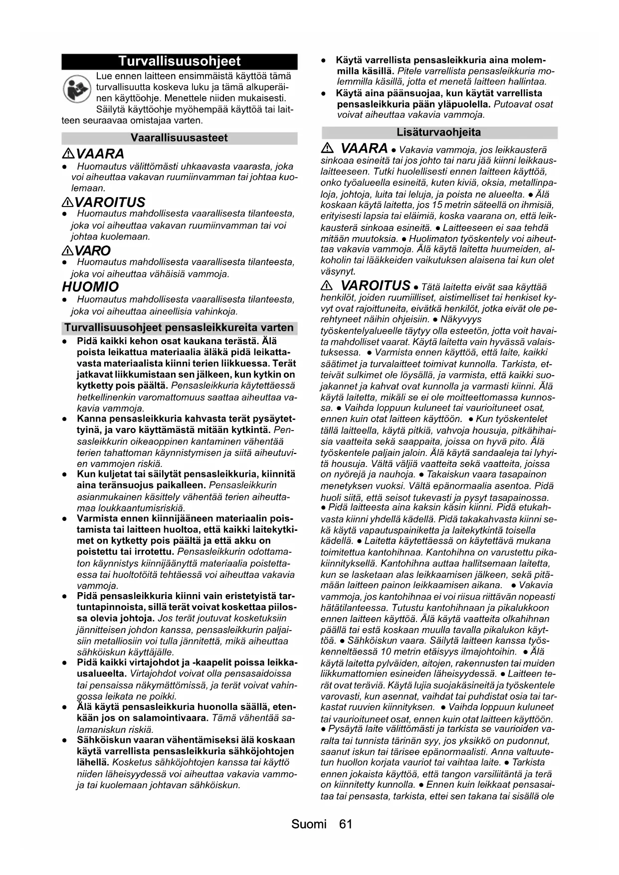 - EU-vaatimustenmukaisuusvakuutus Suomi 61 Turvallisuusohjeet Lue ennen laitteen ensimmäistä käyttöä tämä turvallisuutta koskeva luku ja tämä alkuperäi- nen käyttöohje. Menettele niiden mukaisesti. Säilytä käyttöohje myöhempää käyttöä tai lait- teen seuraavaa omistajaa varten. Vaarallisuusasteet VAARA ● Huomautus välittömästi uhkaavasta vaarasta, joka voi aiheuttaa vakavan ruumiinvamman tai johtaa kuo- lemaan. 몇 VAROITUS ● Huomautus mahdollisesta vaarallisesta tilanteesta, joka voi aiheuttaa vakavan ruumiinvamman tai voi johtaa kuolemaan. 몇 VARO ● Huomautus mahdollisesta vaarallisesta tilanteesta, joka voi aiheuttaa vähäisiä vammoja. HUOMIO ● Huomautus mahdollisesta vaarallisesta tilanteesta, joka voi aiheuttaa aineellisia vahinkoja. Turvallisuusohjeet pensasleikkureita varten ● Pidä kaikki kehon osat kaukana terästä. Älä poista leikattua materiaalia äläkä pidä leikatta- vasta materiaalista kiinni terien liikkuessa. Terät jatkavat liikkumistaan sen jälkeen, kun kytkin on kytketty pois päältä. Pensasleikkuria käytettäessä hetkellinenkin varomattomuus saattaa aiheuttaa va- kavia vammoja. ● Kanna pensasleikkuria kahvasta terät pysäytet- tyinä, ja varo käyttämästä mitään kytkintä. Pen- sasleikkurin oikeaoppinen kantaminen vähentää terien tahattoman käynnistymisen ja siitä aiheutuvi- en vammojen riskiä. ● Kun kuljetat tai säilytät pensasleikkuria, kiinnitä aina teränsuojus paikalleen. Pensasleikkurin asianmukainen käsittely vähentää terien aiheutta- maa loukkaantumisriskiä. ● Varmista ennen kiinnijääneen materiaalin pois- tamista tai laitteen huoltoa, että kaikki laitekytki- met on kytketty pois päältä ja että akku on poistettu tai irrotettu. Pensasleikkurin odottama- ton käynnistys kiinnijäänyttä materiaalia poistetta- essa tai huoltotöitä tehtäessä voi aiheuttaa vakavia vammoja. ● Pidä pensasleikkuria kiinni vain eristetyistä tar- tuntapinnoista, sillä terät voivat koskettaa piilos- sa olevia johtoja. Jos terät joutuvat kosketuksiin jännitteisen johdon kanssa, pensasleikkurin paljai- siin metalliosiin voi tulla jännitettä, mikä aiheuttaa sähköiskun käyttäjälle. ● Pidä kaikki virtajohdot ja -kaapelit poissa leikka- usalueelta. Virtajohdot voivat olla pensasaidoissa tai pensaissa näkymättömissä, ja terät voivat vahin- gossa leikata ne poikki. ● Älä käytä pensasleikkuria huonolla säällä, eten- kään jos on salamointivaara. Tämä vähentää sa- lamaniskun riskiä. ● Sähköiskun vaaran vähentämiseksi älä koskaan käytä varrellista pensasleikkuria sähköjohtojen lähellä. Kosketus sähköjohtojen kanssa tai käyttö niiden läheisyydessä voi aiheuttaa vakavia vammo- ja tai kuolemaan johtavan sähköiskun. ● Käytä varrellista pensasleikkuria aina molem- milla käsillä. Pitele varrellista pensasleikkuria mo- lemmilla käsillä, jotta et menetä laitteen hallintaa. ● Käytä aina päänsuojaa, kun käytät varrellista pensasleikkuria pään yläpuolella. Putoavat osat voivat aiheuttaa vakavia vammoja. Lisäturvaohjeita VAARA ● Vakavia vammoja, jos leikkausterä sinkoaa esineitä tai jos johto tai naru jää kiinni leikkaus- laitteeseen. Tutki huolellisesti ennen laitteen käyttöä, onko työalueella esineitä, kuten kiviä, oksia, metallinpa- loja, johtoja, luita tai leluja, ja poista ne alueelta. ● Älä koskaan käytä laitetta, jos 15 metrin säteellä on ihmisiä, erityisesti lapsia tai eläimiä, koska vaarana on, että leik- kausterä sinkoaa esineitä. ● Laitteeseen ei saa tehdä mitään muutoksia. ● Huolimaton työskentely voi aiheut- taa vakavia vammoja. Älä käytä laitetta huumeiden, al- koholin tai lääkkeiden vaikutuksen alaisena tai kun olet väsynyt. 몇 VAROITUS ● Tätä laitetta eivät saa käyttää henkilöt, joiden ruumiilliset, aistimelliset tai henkiset ky- vyt ovat rajoittuneita, eivätkä henkilöt, jotka eivät ole pe- rehtyneet näihin ohjeisiin. ● Näkyvyys työskentelyalueelle täytyy olla esteetön, jotta voit havai- ta mahdolliset vaarat. Käytä laitetta vain hyvässä valais- tuksessa. ● Varmista ennen käyttöä, että laite, kaikki säätimet ja turvalaitteet toimivat kunnolla. Tarkista, et- teivät sulkimet ole löysällä, ja varmista, että kaikki suo- jakannet ja kahvat ovat kunnolla ja varmasti kiinni. Älä käytä laitetta, mikäli se ei ole moitteettomassa kunnos- sa. ● Vaihda loppuun kuluneet tai vaurioituneet osat, ennen kuin otat laitteen käyttöön. ● Kun työskentelet tällä laitteella, käytä pitkiä, vahvoja housuja, pitkähihai- sia vaatteita sekä saappaita, joissa on hyvä pito. Älä työskentele paljain jaloin. Älä käytä sandaaleja tai lyhyi- tä housuja. Vältä väljiä vaatteita sekä vaatteita, joissa on nyörejä ja nauhoja. ● Takaiskun vaara tasapainon menetyksen vuoksi. Vältä epänormaalia asentoa. Pidä huoli siitä, että seisot tukevasti ja pysyt tasapainossa. ● Pidä laitteesta aina kaksin käsin kiinni. Pidä etukah- vasta kiinni yhdellä kädellä. Pidä takakahvasta kiinni se- kä käytä vapautuspainiketta ja laitekytkintä toisella kädellä. ● Laitetta käytettäessä on käytettävä mukana toimitettua kantohihnaa. Kantohihna on varustettu pika- kiinnityksellä. Kantohihna auttaa hallitsemaan laitetta, kun se lasketaan alas leikkaamisen jälkeen, sekä pitä- mään laitteen painon leikkaamisen aikana. ● Vakavia vammoja, jos kantohihnaa ei voi riisua riittävän nopeasti hätätilanteessa. Tutustu kantohihnaan ja pikalukkoon ennen laitteen käyttöä. Älä käytä vaatteita olkahihnan päällä tai estä koskaan muulla tavalla pikalukon käyt- töä. ● Sähköiskun vaara. Säilytä laitteen kanssa työs- kenneltäessä 10 metrin etäisyys ilmajohtoihin. ● Älä käytä laitetta pylväiden, aitojen, rakennusten tai muiden liikkumattomien esineiden läheisyydessä. ● Laitteen te- rät ovat teräviä. Käytä lujia suojakäsineit