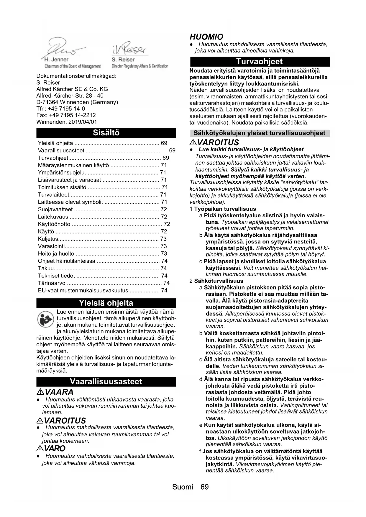 Skärlängd mm 638 Vikt (utan batteripaket) kg 4,5Suomi 69 Dokumentationsbefullmäktigad: S. Reiser Alfred Kärcher SE & Co. KG Alfred-Kärc her-Str. 28 - 40 D-71364 Winnenden (Germany) Tfn: +49 7195 14-0 Fax: +49 7195 14-2212 Winnenden, 2019/04/01 Sisältö Yleisiä ohjeita Lue ennen laitteen ensimmäistä käyttöä nämä turvallisuusohjeet, tämä alkuperäinen käyttöoh- je, akun mukana toimitettavat turvallisuusohjeet ja akun/yleislaturin mukana toimitettava alkupe- räinen käyttöohje. Menettele niiden mukaisesti. Säilytä ohjeet myöhempää käyttöä tai laitteen seuraavaa omis- tajaa varten. Käyttöohjeen ohjeiden lisäksi sinun on noudatettava la- kimääräisiä yleisiä turvallisuus- ja tapaturmantorjunta- määräyksiä. Vaarallisuusasteet VAARA ● Huomautus välittömästi uhkaavasta vaarasta, joka voi aiheuttaa vakavan ruumiinvamman tai johtaa kuo- lemaan. 몇 VAROITUS ● Huomautus mahdollisesta vaarallisesta tilanteesta, joka voi aiheuttaa vakavan ruumiinvamman ta i voi