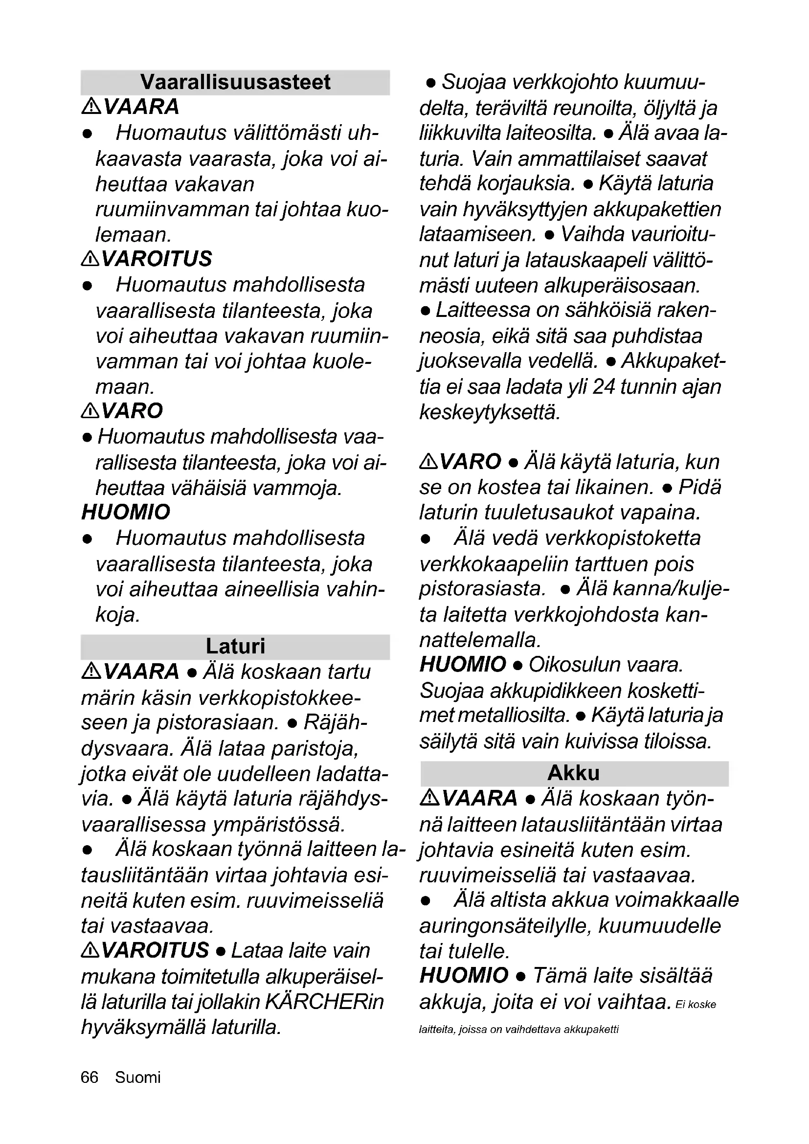 - EU-vaatimustenmukaisuusvakuutus Chairman of the Board of ManagementDirector Regulatory Affairs & Certification H. Jenner S. Reiser 6XRPL Vaarallisuusasteet VAARA ● Huomautus välittömästi uh- kaavasta vaarasta, joka voi ai- heuttaa vakavan ruumiinvamman tai johtaa kuo- lemaan. 몇 VAROITUS ● Huomautus mahdollisesta vaarallisesta tilanteesta, joka voi aiheuttaa vakavan ruumiin- vamman tai voi johtaa kuole- maan. 몇 VARO ● Huomautus mahdollisesta vaa- rallisesta tilanteesta, joka voi ai- heuttaa vähäisiä vammoja. HUOMIO ● Huomautus mahdollisesta vaarallisesta tilanteesta, joka voi aiheuttaa aineellisia vahin- koja. Laturi VAARA ● Älä koskaan tartu märin käsin verkkopistokkee- seen ja pistorasiaan. ● Räjäh- dysvaara. Älä lataa paristoja, jotka eivät ole uudelleen ladatta- via. ● Älä käytä laturia räjähdys- vaarallisessa ympäristössä. ● Älä koskaan työnnä laitteen la- tausliitäntään virtaa johtavia esi- neitä kuten esim. ruuvimeisseliä tai vastaavaa. 몇 VAROITUS ● Lataa laite vain mukana toimitetulla alkuperäisel- lä laturilla tai jollakin KÄRCHERin hyväksymällä laturilla. ● Suojaa verkkojohto kuumuu- delta, teräviltä reunoilta, öljyltä ja liikkuvilta laiteosilta. ● Älä avaa la- turia. Vain ammattilaiset saavat tehdä korjauksia. ● Käytä laturia vain hyväksyttyjen akkupakettien lataamiseen. ● Vaihda vaurioitu- nut laturi ja latauskaapeli välittö- mästi uuteen alkuperäisosaan. ● Laitteessa on sähköisiä raken- neosia, eikä sitä saa puhdistaa juoksevalla vedellä. ● Akkupaket- tia ei saa ladata yli 24 tunnin ajan keskeytyksettä. 몇 VARO ● Älä käytä laturia, kun se on kostea tai likainen. ● Pidä laturin tuuletusaukot vapaina. ● Älä vedä verkkopistoketta verkkokaapeliin tarttuen pois pistorasiasta. ● Älä kanna/kulje- ta laitetta verkkojohdosta kan- nattelemalla. HUOMIO ● Oikosulun vaara. Suojaa akkupidikkeen kosketti- met metalliosilta. ● Käytä laturia ja säilytä sitä vain kuivissa tiloissa. Akku VAARA ● Älä koskaan työn- nä laitteen latausliitäntään virtaa johtavia esineitä kuten esim. ruuvimeisseliä tai vastaavaa. ● Älä altista akkua voimakkaalle auringonsäteilylle, kuumuudelle tai tulelle. HUOMIO ● Tämä laite sisältää akkuja, joita ei voi vaihtaa. Ei koske laitteita, joissa on vaihdettava akkupaketti6XRPL Turvallinen käsittely 몇 VAROITUS ● Tätä laitetta ei- vät saa käyttää henkilöt, joiden ruumiilliset, aistimelliset tai hen- kiset kyvyt ovat rajoittuneita, ei- vätkä henkilöt, jotka eivät ole perehtyneet näihin ohjeisiin. ● Henkilöt, joilla on vajavaiset ruumiilliset, aistilliset tai henkiset ominaisuudet tai puutteita koke- muksessa ja tietämyksessä, saavat käyttää tätä laitetta vain siinä tapauksessa, että he ovat oikein valvonnan alaisia tai ovat saaneet opastuksen heidän tur- vallisuudestaan vastaavan hen- kilön toimesta laitteen turvalliseen käyttämiseen ja ovat ymmärtäneet sen käyttöön liittyvät vaarat. ● Lapset eivät saa leikkiä laitteella. ● Valvo lap- sia sen varmistamiseksi, että he eivät leiki laitteella. ● Käytä lai- tetta vain määräysten mukaises- ti. Ota huomioon paikalliset olosuhteet ja varo laitteella työs- kennellessäsi muita ihmisiä, eri- tyisesti lapsia. ● Ota vaara- alueilla (esim. bensiiniasemat) huomioon asiaankuuluvat tur- vallisuusmääräykset. Älä kos- kaan käytä laitetta räjähdysalttiissa tiloissa. ● Älä ruiskuta mitään esineitä, jotka sisältävät terveydelle vaarallisia aineita (esim. asbestia). ● Louk- kaantumisvaara. Älä suuntaa sumusuihkua silmiä kohti. 몇 VARO ● Älä käytä laitetta, jos se on aikaisemmin pudonnut, näkyvästi vaurioitunut tai epätii- vis. ● Käytä tai säilytä laitetta vain kuvauksen tai kuvan mukai- sesti. ● Älä jätä laitetta koskaan käytön aikana ilman valvontaa. ● Turvallisen seisontavakavuu- den varmistamiseksi on laite asetettava kiinteälle, tasaisella alustalle. ● Laitteen kaatuminen aiheuttaa onnettomuuksia tai vaurioita. Seisontavakavuus on varmistettava ennen kaikkia töi- tä laitteessa ja sen ympärillä. HUOMIO ● Älä täytä puhdistus- aineita tai muita lisäaineita. ● Laitevaurioita. Älä koskaan täytä liuotinaineita, liuottimia si- sältäviä nesteitä tai laimenta- mattomia happoja (esim. puhdistusaineet, bensiini, maali- ohenteet tai asetoni) vesisäi- liöön. ● Laitevaurioita kuivakäynnin johdosta. Kytke laite päälle vain silloin, kun vesi- säiliössä on vettä. ● Älä käytä laitetta alle 0 °C lämpötiloissa. Määräystenmukainen käyttö Käytä matalapainepesuria vain yksityisissä kotitalouk- sissa. Matalapainepesuri on tarkoitettu koneiden, ajoneuvo- jen, työkalujen, julkisivujen, terassien, puutarhalaittei- den, kotieläinten jne. puhdistamiseen matalapaineisella vesisuihkulla ilman puhdistusaineiden lisäämistä. 6XRPL Ympäristönsuojelu Pakkausmateriaalit ovat kierrätettäviä. Hävitä pakkaukset ympäristöä säästäen. Sähkö- ja elektroniikkalaitteet sisältävät arvokkai- ta kierrätettäviä materiaaleja tai rakenneosia ku- ten paristoja, akkuja tai öljyjä, jotka väärin käsiteltyinä tai väärin hävitettyinä voivat aiheuttaa mahdollisia vaaroja ihmisten terveydelle ja ympäristölle. Nämä rakenneosat ovat kuitenkin välttämättömiä lait- teen asianmukaisen toiminnan vuoksi. Tällä symbolilla merkittyjä laitteita ei saa hävittää kotitalousjätteenä. Puhdistustöitä, joiden yhteydessä syntyy öljypitois- ta jätevettä, esim. moottorin pesu, alustapesu, saa tehdä vain pesupaikoilla, joilla on öljynerotin. Puhdistusaineita sisältäviä töitä saa tehdä vain nestetiivistetyillä työpinnoilla, joilla on liitäntä lika- vesiviemäriin. Älä päästä puhdistusaineita vesistöihin tai maaperään. Veden ottaminen julkisista vesistöistä ei ole joissain maissa sallittua. Sisältöaineita koskevia ohjeita (REACH) Päivit