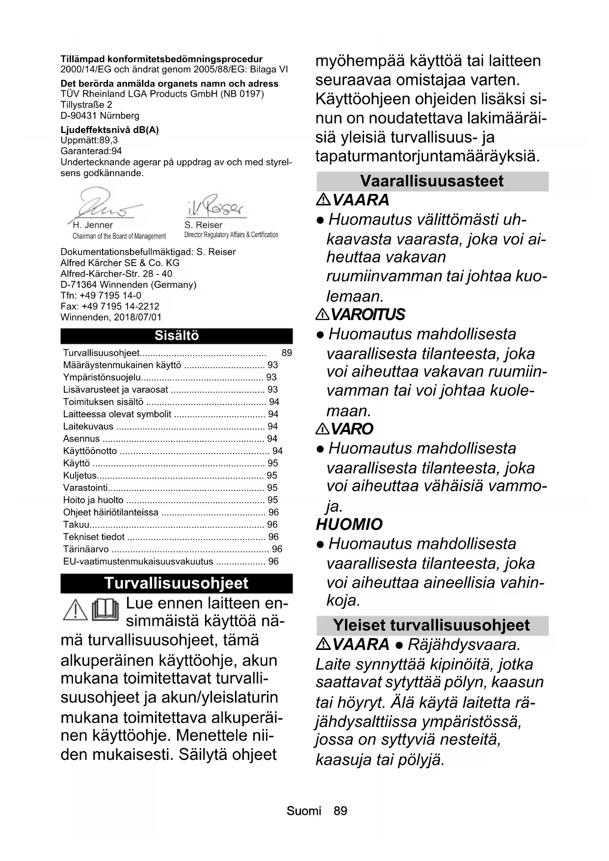 - 2,1 Osäkerhet K dB(A) 1,5 Mått och vikter Längd x bredd x höjd mm 1773 x 366 x 277 Vikt (utan batteripaket) kg 4,0Suomi 89 Tillämpad konformitetsbedömningsprocedur 2000/14/EG och ändrat genom 2005/88/EG: Bilaga VI Det berörda anmälda organets namn och adress TÜV Rheinland LGA Products GmbH (NB 0197) Tillystraße 2 D-90431 Nürnberg Ljudeffektsnivå dB(A) Uppmätt:89,3 Garanterad:94 Undertecknande agerar på uppdrag av och med styrel- sens godkännande. Dokumentationsbefullmäktigad: S. Reiser Alfred Kärcher SE & Co. KG Alfred-Kärcher-Str. 28 - 40 D-71364 Winnenden (Germany) Tfn: +49 7195 14-0 Fax: +49 7195 14-2212 Winnenden, 2018/07/01 Sisältö Turvallisuusohjeet Lue ennen laitteen en- simmäistä käyttöä nä- mä turvallisuusohjeet, tämä alkuperäinen käyttöohje, akun mukana toimitettavat turvalli- suusohjeet ja akun/yleislaturin mukana toimitettava alkuperäi- nen käyttöohje. Menettele nii- den mukaisesti. Säilytä ohjeet myöhempää käyttöä tai laitteen seuraavaa omistajaa varten. Käyttöohjeen ohjeiden lisäksi si- nun on noudatettava lakimääräi- siä yleisiä turvallisuus- ja tapaturmantorjuntamääräyksiä. Vaarallisuusasteet VAARA ● Huomautus välittömästi uh- kaavasta vaarasta, joka voi ai- heuttaa vakavan ruumiinvamman tai johtaa kuo- lemaan. 몇 VAROITUS ● Huomautus mahdollisesta vaarallisesta tilanteesta, joka voi aiheuttaa vakavan ruumiin- vamman tai voi johtaa kuole- maan. 몇 VARO ● Huomautus mahdollisesta vaarallisesta tilanteesta, joka voi aiheuttaa vähäisiä vammo- ja. HUOMIO ● Huomautus mahdollisesta vaarallisesta tilanteesta, joka voi aiheuttaa aineellisia vahin- koja. Yleiset turvallisuusohjeet VAARA ● Räjähdysvaara. Laite synnyttää kipinöitä, jotka saattavat sytyttää pölyn, kaasun tai höyryt. Älä käytä laitetta rä- jähdysalttiissa ympäristössä, jossa on syttyviä nesteitä, kaasuja tai pölyjä. Turvallisuusohjeet p. 89