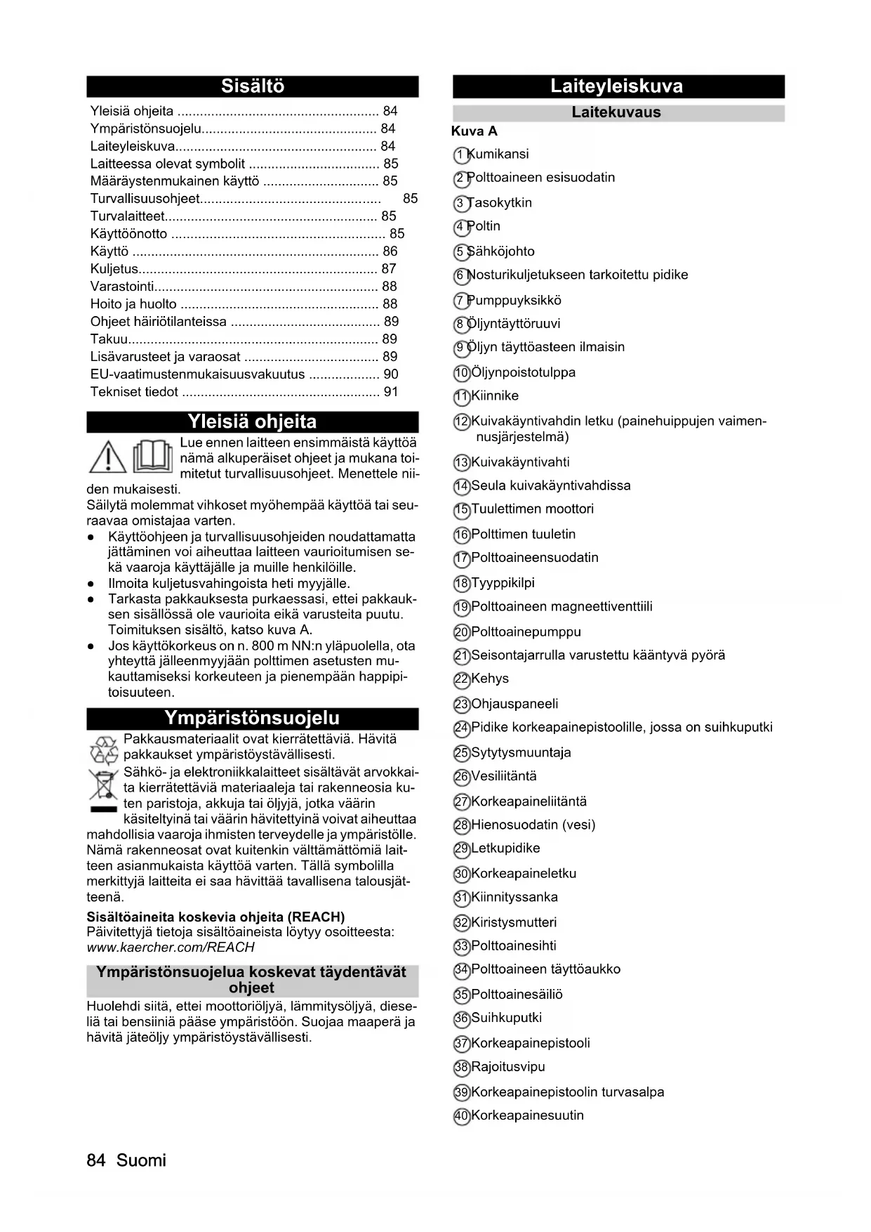 - 1,584 Suomi Sisältö Yleisiä ohjeita Lue ennen laitteen ensimmäistä käyttöä nämä alkuperäiset ohjeet ja mukana toi- mitetut turvallisuusohjeet. Menettele nii- den mukaisesti. Säilytä molemmat vihkoset myöhempää käyttöä tai seu- raavaa omistajaa varten. ● Käyttöohjeen ja turvallisuusohjeiden noudattamatta jättäminen voi aiheuttaa laitteen vaurioitumisen se- kä vaaroja käyttäjälle ja muille henkilöille. ● Ilmoita kuljetusvahingoista heti myyjälle. ● Tarkasta pakkauksesta purkaessasi, ettei pakkauk- sen sisällössä ole vaurioita eikä varusteita puutu. Toimituksen sisältö, katso kuva A. ● Jos käyttökorkeus on n. 800 m NN:n yläpuolella, ota yhteyttä jälleenmyyjään polttimen asetusten mu- kauttamiseksi korkeuteen ja pienempään happipi- toisuuteen. Ympäristönsuojelu Pakkausmateriaalit ovat kierrätettäviä. Hävitä pakkaukset ympäristöystävällisesti. Sähkö- ja elektroniikkalaitteet sisältävät arvokkai- ta kierrätettäviä materiaaleja tai rakenneosia ku- ten paristoja, akkuja tai öljyjä, jotka väärin käsiteltyinä tai väärin hävitettyinä voivat aiheuttaa mahdollisia vaaroja ihmisten terveydelle ja ympäristölle. Nämä rakenneosat ovat kuitenkin välttämättömiä lait- teen asianmukaista käyttöä varten. Tällä symbolilla merkittyjä laitteita ei saa hävittää tavallisena talousjät- teenä. Sisältöaineita koskevia ohjeita (REACH) Päivitettyjä tietoja sisältöaineista löytyy osoitteesta: www.kaercher.com/REACH Ympäristönsuojelua koskevat täydentävät ohjeet Huolehdi siitä, ettei moottoriöljyä, lämmitysöljyä, diese- liä tai bensiiniä pääse ympäristöön. Suojaa maaperä ja hävitä jäteöljy ympäristöystävällisesti. Laiteyleiskuva Laitekuvaus Kuva A 1 Kumikansi 2 Polttoaineen esisuodatin 3 Tasokytkin 4 Poltin 5 Sähköjohto 6 Nosturikuljetukseen tarkoitettu pidike 7 Pumppuyksikkö 8 Öljyntäyttöruuvi 9 Öljyn täyttöasteen ilmaisin 10 Öljynpoistotulppa 11 Kiinnike 12 Kuivakäyntivahdin letku (painehuippujen vaimen- nusjärjestelmä) 13 Kuivakäyntivahti 14 Seula kuivakäyntivahdissa 15 Tuulettimen moottori 16 Polttimen tuuletin 17 Polttoaineensuodatin 18 Tyyppikilpi 19 Polttoaineen magneettiventtiili 20 Polttoainepumppu 21 Seisontajarrulla varustettu kääntyvä pyörä 22 Kehys 23 Ohjauspaneeli 24 Pidike korkeapainepistoolille, jossa on suihkuputki 25 Sytytysmuuntaja 26 Vesiliitäntä 27 Korkeapaineliitäntä 28 Hienosuodatin (vesi) 29 Letkupidike 30 Korkeapaineletku 31 Kiinnityssanka 32 Kiristysmutteri 33 Polttoainesihti 34 Polttoaineen täyttöaukko 35 Polttoainesäiliö 36 Suihkuputki 37 Korkeapainepistooli 38 Rajoitusvipu 39 Korkeapainepistoolin turvasalpa 40 Korkeapainesuutin Yleisiä ohjeita p. 84