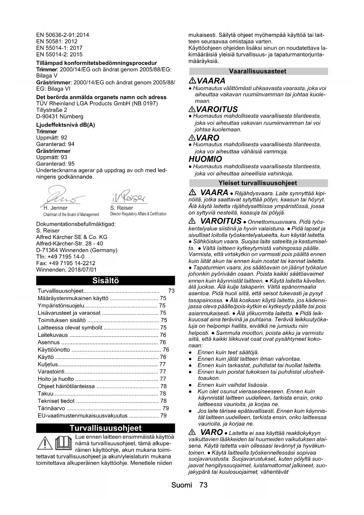 - 1,5 Mått och vikter trimmer Längd x bredd x höjd mm 1804 x 6 44 x 364 Vikt (utan batteripaket) kg 4,2 Mått och vikter gräsmattstrimmare Längd x bredd x höjd mm 1767 x 6 44 x 428 Vikt (utan batteripaket) kg 4,3 BCU 260/36 BpSuomi 73 EN 50636-2-91:2014 EN 50581: 2012 EN 55014-1: 2017 EN 55014-2: 2015 Tillämpad konformitetsbedömningsprocedur Trimmer: 2000/14/EG och ändrat genom 2005/88/EG: Bilaga V Grästrimmer: 2000/14/EG och ändrat genom 2005/88/ EG: Bilaga VI Det berörda anmälda organets namn och adress TÜV Rheinland LGA Products GmbH (NB 0197) Tillystraße 2 D-90431 Nürnberg Ljudeffektsnivå dB(A) Trimmer Uppmätt: 92 Garanterad: 94 Grästrimmer Uppmätt: 93 Garanterad: 95 Undertecknarna agerar på uppdrag av och med led- ningens godkännande. Dokumentationsbefullmäktigad: S. Reiser Alfred Kärcher SE & Co. KG Alfred-Kärcher-Str. 28 - 40 D-71364 Winnenden (Germany) Tfn: +49 7195 14-0 Fax: +49 7195 14-2212 Winnenden, 2018/07/01 Sisältö Turvallisuusohjeet Lue ennen laitteen ensimmäistä käyttöä nämä turvallisuusohjeet, tämä alkupe- räinen käyttöohje, akun mukana toimi- tettavat turvallisuusohjeet ja akun/yleislaturin mukana toimitettava alkuperäinen käyttöohje. Menettele niiden mukaisesti. Säilytä ohjeet myöhempää käyttöä tai lait- teen seuraavaa omistajaa varten. Käyttöohjeen ohjeiden lisäksi sinun on noudatettava la- kimääräisiä yleisiä turvallisuus- ja tapaturmantorjunta- määräyksiä. Vaarallisuusasteet VAARA ● Huomautus välittömästi uhkaavasta vaarasta, joka voi aiheuttaa vakavan ruumiinvamman tai johtaa kuole- maan. 몇 VAROITUS ● Huomautus mahdollisesta vaarallisesta tilanteesta, joka voi aiheuttaa vakavan ruumiinvamman tai voi johtaa kuolemaan. 몇 VARO ● Huomautus mahdollisesta vaarallisesta tilanteesta, joka voi aiheuttaa vähäisiä vammoja. HUOMIO ● Huomautus mahdollisesta vaarallisesta tilanteesta, joka voi aiheuttaa aineellisia vahinkoja. Yleiset turvallisuusohjeet VAARA ● Räjähdysvaara. Laite synnyttää kipi- nöitä, jotka saattavat sytyttää pölyn, kaasun tai höyryt. Älä käytä laitetta räjähdysalttiissa ympäristössä, jossa on syttyviä nesteitä, kaasuja tai pölyjä. 몇 VAROITUS ● Onnettomuusvaara. Pidä työs- kentelyalue siistinä ja hyvin valaistuna. ● Pidä lapset ja sivulliset loitolla työskentelyalueelta, kun käytät laitetta. ● Sähköiskun vaara. Suojaa laite sateelta ja kastumisel- ta. ● Vältä laitteen kytkeytymistä vahingossa päälle. Varmista, että virtakytkin on varmasti pois päältä ennen kuin liität akun tai ennen kuin nostat tai kannat laitetta. ● Tapaturmien vaara, jos säätöavain on jäänyt työkalun johonkin pyörivään osaan. Poista kaikki säätöavaimet ennen kuin käynnistät laitteen. ● Käytä laitetta kävellen, älä juokse. Älä kulje takaperin. Vältä epänormaalia asentoa. Pidä huoli siitä, että seisot tukevasti ja pysyt tasapainossa. ● Älä koskaan käytä laitetta, jos kädensi- jassa oleva päälle/pois-kytkin ei kytkeydy päälle tai pois asianmukaisesti. ● Älä ylikuormita laitetta. ● Pidä leik- kuuosat aina terävinä ja puhtaina. Teräviä leikkuutyöka- luja on helpompi hallita, eivätkä ne jumiudu niin helposti. ● Sammuta moottori, poista akku ja varmistu siitä, että kaikki liikkuvat osat ovat pysähtyneet koko- naan: ● Ennen kuin teet säätöjä. ● Ennen kuin jätät laitteen ilman valvontaa. ● Ennen kuin tarkastat, puhdistat tai huollat laitetta. ● Ennen kuin poistat tukoksen tai puhdistat ulosheit- toaukon. ● Ennen kuin vaihdat lisäosia. ● Kun olet osunut vierasesineeseen. Ennen kuin käynnistät laitteen uudelleen, tarkista ensin, onko laitteessa vaurioita, ja korjaa ne. ● Jos laite tärisee epätavallisesti. Ennen kuin käynnis- tät laitteen uudelleen, tarkista ensin, onko laitteessa vaurioita, ja korjaa ne. 몇 VARO ● Laitetta ei saa käyttää reaktiokykyyn vaikuttavien lääkkeiden tai huumeiden vaikutuksen alai- sena. Käytä laitetta vain ollessasi levännyt ja hyväkun- toinen. ● Käytä laitteella työskennellessäsi sopivaa suojavarustusta. Suojavarustukset, kuten pölyltä suo- jaavat hengityssuojaimet, luistamattomat jalkineet, suo- jakypärä tai kuulosuojaimet, vähentävät Turvallisuusohjeet p. 73