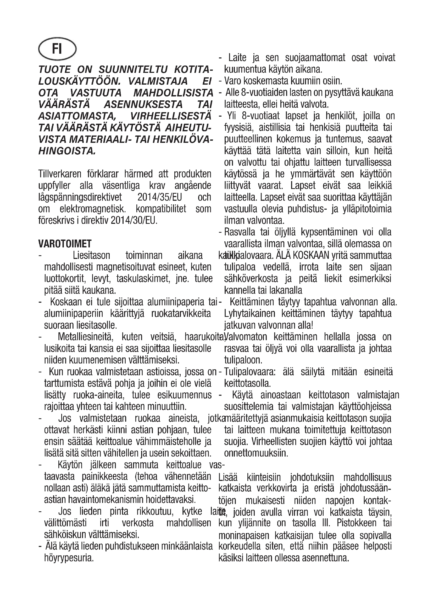 HINGOISTA. Tillverkaren förklarar härmed att produkten uppfyller alla väsentliga krav angående lågspänningsdirektivet 2014/35/EU och om elektromagnetisk. kompatibilitet som föreskrivs i direktiv 2014/30/EU. VAROTOIMET - Liesitason toiminnan aikana kaikki mahdollisesti magnetisoituvat esineet, kuten luottokortit, levyt, taskulaskimet, jne. tulee pitää siitä kaukana. - Koskaan ei tule sijoittaa alumiinipaperia tai alumiinipaperiin käärittyjä ruokatarvikkeita suoraan liesitasolle. - Metalliesineitä, kuten veitsiä, haarukoita, lusikoita tai kansia ei saa sijoittaa liesitasolle niiden kuumenemisen välttämiseksi. - Kun ruokaa valmistetaan astioissa, jossa on tarttumista estävä pohja ja joihin ei ole vielä lisätty ruoka-aineita, tulee esikuumennus rajoittaa yhteen tai kahteen minuuttiin. - Jos valmistetaan ruokaa aineista, jotka ottavat herkästi kiinni astian pohjaan, tulee ensin säätää keittoalue vähimmäisteholle ja lisätä sitä sitten vähitellen ja usein sekoittaen.