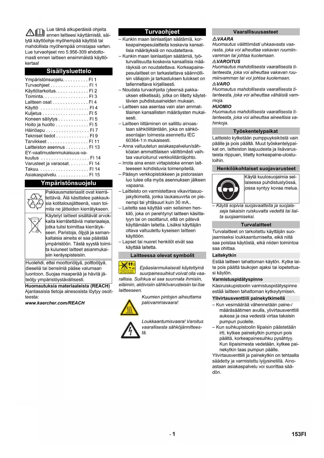 150 SV- 14 Inställningar görs på styrkretskortet. Styrkretskortet sitter i högtryckspumpens elskåp. 1 Potentiometer vattenhårdhet 2 Potentiometer stand by-tid Ställ in stand by-perioden med potenti- ometern på styrelektroniken. Fabriksinställning: 10 Minuter Tiden kan ställas in mellan 5 och 120 minu- ter. På styrkretskortet finns en enkel skala med riktvärden. Som skydd mot förkalkning vid varmvatten- drift med hårt vatten. Tillsätter avhärdare till vattnet. Doseringsmängden kan anpassas till vattnets hårdhetsgrad. Fyll behållare med Kärcher-avhärd- ningsvätska RM 110 (best.nr. 2.780- 001). Ta reda på aktuell vattenhårdhet: – hos lokalt vattenverk, – med testutrustning (best.nr. 6.768- 004). FARA Farlig elektrisk spänning! Inställningen får bara utföras av en elinstallatör. Ställ in vridpotentiometern på kretskor- tet för avhärdare efter vattenhårdhet. Skalan visar hårdhetsområdena 1 till 4. Skruva bort munstycke. Låt aggregatet arbeta tills vattnet är fritt från blåsor när det kommer ut. Låt eventuellt aggregatet arbeta under 10 sekunder – stäng av. Upprepa detta flera gånger. Stäng av aggregatet och skruva på munstycket igen. Härmed försäkrar vi att nedanstående be- tecknade maskin i ändamål och konstruk- tion samt i den av oss levererade versionen motsvarar EU-direktivens tillämpliga grundläggande säkerhets- och hälsokrav. Vid ändringar på maskinen som inte har godkänts av oss blir denna överensstäm- melseförklaring ogiltig. Undertecknade agerar på order av och med fullmakt från företagsledningen. Dokumentationsbefullmäktigad: S. Reiser Alfred Kärcher GmbH & Co. KG Alfred-Kärcher-Str. 28 - 40 71364 Winnenden (Germany) Tel.: +49 7195 14-0 Fax: +49 7195 14-2212 Winnenden, 2016/11/01 Använd endast originaltillbehör och origi- nalreservdelar, så att en säker och stör- ningsfri drift av maskinen är garanterad. Information om tillbehör och reservdelar finns på www.kaercher.com. I respektive land gäller de garantivillkor som publicerats av våra auktoriserade dist- ributörer. Eventuella fel på aggregatet re- pareras utan kostnad under förutsättning att det orsakats av ett material- eller tillverk- ningsfel. Garantin träder endast i kraft om din försäl- jare fyller i bifogat svarskort fullständigt vid köpet, stämplar och undertecknar det och att du därefter skickar svarskortet till ditt lands distributör. I frågor som gäller garantin ska du vända dig med tillbehör och kvitto till inköpsstället eller närmaste auktoriserade kundtjänst. Inställningar Vänteläge Påbyggnadssats avhärdare (tillval) Lufta aggregat EU-försäkran om överensstämmelse Produkt: Högtryckstvätt Typ: 1.524-xxx Tillämpliga EU-direktiv 2006/42/EG (+2009/127/EG) 2014/30/EU Tillämpade harmoniserade normer EN 55014–1: 2006+A1: 2009+A2: 2011 EN 55014–2: 2015 EN 60335–1 EN 60335–2–79 EN 61000–3–2: 2006+A1: 2009+A2: 2009 EN 61000–3–3: 2013 EN 62233: 2008 CEO Head of Approbation Tillbehör och reservdelar Garanti 151SV- 15 Kontroll genomförd den: Resultat: Kontroll genomförd den: Resultat: Kontroll genomförd den: Resultat: Kontroll genomförd den: Resultat: Kundservice Anläggningstyp: Tillverkningsnr. Ibruktagning den: Underskrift Underskrift Underskrift Underskrift 152 SV- 1 Lue tämä alkuperäisiä ohjeita ennen laitteesi käyttämistä, säi- lytä käyttöohje myöhempää käyttöä tai mahdollista myöhempää omistajaa varten. Lue turvaohjeet nro 5.956-309 ehdotto- masti ennen laitteen ensimmäistä käyttö- kertaa! Huomautuksia materiaaleista (REACH) Ajantasaisia tietoja ainesosista löytyy osoit- teesta: www.kaercher.com/REACH – Kunkin maan lainlaatijan säätämiä, kor- keapainepesulaitteita koskevia kansal- lisia määräyksiä on noudatettava. – Kunkin maan lainlaatijan säätämiä, työ- turvallisuutta koskevia kansallisia mää- räyksiä on noudatettava. Korkeapaine- pesulaitteet on tarkastettava säännölli- sin väliajoin ja tarkastuksen tulokset on tallennettava kirjallisesti. – Noudata turvaohjeita (yleensä pakka- uksen etiketissä), jotka on liitetty käytet- tävien puhdistusaineiden mukaan. – Laitteen saa asentaa vain alan ammat- tilainen kansallisten määräysten mukai- sesti. – Laitteen liittäminen on sallittu ainoas- taan sähköliitäntään, joka on sähkö- asentajan toimesta asennettu IEC 60364-1:n mukaisesti. – Anna valtuutetun asiakaspalvelun/säh- köalan ammattilaisen välittömästi vaih- taa vaurioitunut verkkoliitäntäjohto. – Irrota aina ensin virtapistoke ennen lait- teeseen kohdistuvia toimenpiteitä. – Pääsyn verkkopistokkeen ja pistorasian luo tulee olla myös asennuksen jälkeen vapaana. – Laitteisto on varmistettava vikavirtasuo- jakytkimellä, jonka laukaisuvirta on pie- nempi tai yhtäsuuri kuin 30 mA.. – Laitetta saa käyttää vain sellainen hen- kilö, joka on perehtynyt laitteen käsitte- lyyn tai on osoittanut, että on pätevä käyttämään laitetta. Lisäksi käyttäjän oltava valtuutettu kyseisen laitteen käyttöön. – Lapset tai nuoret henkilöt eivät saa käyttää laitetta. Epäasianmukaisesti käytettyinä suurpainesuihkut voivat olla vaa- rallisia. Suihkua ei saa suunnata ihmisiin, eläimiin, aktiivisiin sähkövarusteisiin tai itse laitteeseen. VAARA Huomautus välittömästi uhkaavasta vaa- rasta, joka voi aiheuttaa vakavan ruumiin- vamman tai johtaa kuolemaan. 몇 VAROITUS Huomautus mahdollisesta vaarallisesta ti- lanteesta, joka voi aiheuttaa vakavan ruu- miinvamman tai voi johtaa kuolemaan. 몇 VARO Huomautus mahdollisesta vaarallisesta ti- lanteesta, joka voi aiheuttaa vähäisiä vam- moja. HUOMIO Huomautus mahdollisesta vaarallisesta ti- lanteesta, joka voi aiheuttaa aineellisia va- hinkoja. Laitteisto kytketään pumppuyksiköstä vain päälle ja pois päältä. Muut työskentelypai- kat on, laitteiston laajuudesta ja lisävarus- teista riippuen, liitetty korkeapaine-ulostu- loihin. – Käytä
