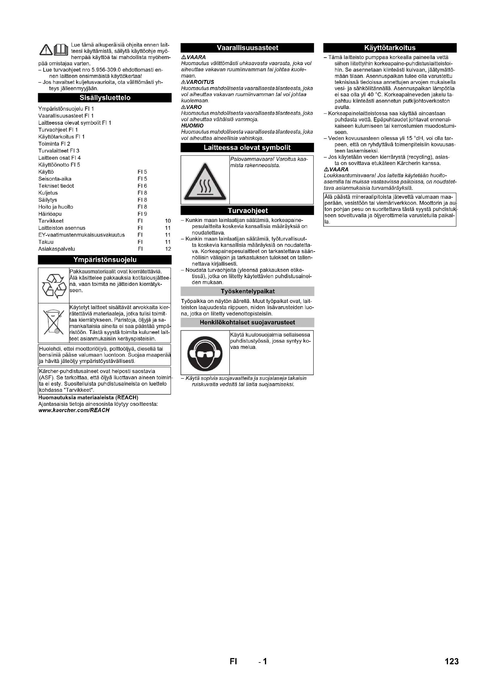 Vattenförsörjning pH-värde 6,5...9,5elektrisk ledningsförmåga < 2000 µS/cmbearbetningsbara substanser < 0,5 mg/l *filtreringsbara substanser (korn-storlek under 0,025 mm)< 20 mg/lKolväten < 20 mg/lKlor < 300 mg/lKalcium < 85 mg/l **Totalhårdhet < 15 °dH **Järn < 0,5 mg/lMangan < 0,05 mg/lKoppar < 0,02 mg/lfritt från illaluktande dofter Elanslutning EU-försäkran om överensstämmelse Produkt: HögtryckstvättTyp: 2.509-xxxTillämpliga EU-direktiv2006/42/EG (+2009/127/EG)2009/125/EG2011/65/EU2014/30/EUTillämpade harmoniserade normerEN IEC 63000: 2018EN 55014–1: 2017 + A11: 2020EN 55014–2: 2015EN 60335–1EN 60335–2–79EN 61000–3–2: 2014EN 61000–3–3: 2013EN 61000–3–12: 2011EN 61000–6–2: 2005EN 61000–6–4: 2007EN 62233: 2008Tillämpade förordningar(EU) 2019/1781 Garanti Chairman of the Board of ManagementDirector Regulatory Affairs & Certification 121SV- 12 Kundservice Anläggningstyp: Tillverkningsnr. Ibruktagning den: Kontroll genomförd den: Resultat: Underskrift Kontroll genomförd den: Resultat: Underskrift Kontroll genomförd den: Resultat: Underskrift Kontroll genomförd den: Resultat: Underskrift 122 SV- 1 Lue tämä alkuperäisiä ohjeita ennen lait- teesi käyttämistä, säilytä käyttöohje myö- hempää käyttöä tai mahdollista myöhem- pää omistajaa varten. – Lue turvaohjeet nro 5.956-309.0 ehdottomasti en- nen laitteen ensimmäistä käyttökertaa! – Jos havaitset kuljetusvaurioita, ota välittömästi yh- teys jälleenmyyjään. Huomautuksia materiaaleista (REACH) Ajantasaisia tietoja ainesosista löytyy osoitteesta: www.kaercher.com/REACH VAARA Huomautus välittömästi uhkaavasta vaarasta, joka voi aiheuttaa vakavan ruumiinvamman tai johtaa kuole- maan. 몇 VAROITUS Huomautus mahdollisesta vaarallisesta tilanteesta, joka voi aiheuttaa vakavan ruumiinvamman tai voi johtaa kuolemaan. 몇 VARO Huomautus mahdollisesta vaarallisesta tilanteesta, joka voi aiheuttaa vähäisiä vammoja. HUOMIO Huomautus mahdollisesta vaarallisesta tilanteesta, joka voi aiheuttaa aineellisia vahinkoja. – Kunkin maan lainlaatijan säätämiä, korkeapaine- pesulaitteita koskevia kansallisia määräyksiä on noudatettava. – Kunkin maan lainlaatijan säätämiä, työturvallisuut- ta koskevia kansallisia määräyksiä on noudatetta- va. Korkeapainepesulaitteet on tarkastettava sään- nöllisin väliajoin ja tarkastuksen tulokset on tallen- nettava kirjallisesti. – Noudata turvaohjeita (yleensä pakkauksen etike- tissä), jotka on liitetty käytettävien puhdistusainei- den mukaan. Työpaikka on näytön äärellä. Muut työpaikat ovat, lait- teiston laajuudesta riippuen, niiden lisävarusteiden luo- na, jotka on liitetty vedenottopisteisiin. – Käytä sopivia suojavaatteita ja suojalaseja takaisin ruiskuvalta vedeltä tai lialta suojaamiseksi. – Tämä laitteisto pumppaa korkealla paineella vettä siihen liitettyihin korkeapaine-puhdistuslaitteistoi- hin. Se asennetaan kiinteästi kuivaan, jäätymättö- mään tilaan. Asennuspaikan tulee olla varustettu teknisissä tiedoissa annettujen arvojen mukaisella vesi- ja sähköliitännällä. Asennuspaikan lämpötila ei saa olla yli 40 °C. Korkeapaineveden jakelu ta- pahtuu kiinteästi asennetun putkijohtoverkoston avulla. – Korkeapainelaitteistossa saa käyttää ainoastaan puhdasta vettä. Epäpuhtaudet johtavat ennenai- kaiseen kulumiseen tai kerrostumien muodostumi- seen. – Veden kovuusasteen ollessa yli 15 °dH, voi olla tar- peen, että on ryhdyttävä toimenpiteisiin kovuusas- teen laskemiseksi. – Jos käytetään veden kierrärystä (recycling), asias- ta on sovittava etukäteen Kärcherin kanssa. VAARA Loukkaantumisvaara! Jos laitetta käytetään huolto- asemilla tai muissa vastaavissa paikoissa, on noudatet- tava asianmukaisia turvamääräyksiä. Sisällysluettelo Ympäristönsuojelu FI 1 Vaarallisuusasteet FI 1 Laitteessa olevat symbolit FI 1 Turvaohjeet FI 1 Käyttötarkoitus FI 1 Toiminta FI 2 Turvalaitteet FI 3 Laitteen osat FI 4 Käyttöönotto FI 5 Käyttö FI 5 Seisonta-aika FI 5 Tekniset tiedot FI 6 Kuljetus FI 8 Säilytys FI 8 Hoito ja huolto FI 8 Häiriöapu FI 9 Tarvikkeet FI 10 Laitteiston asennus FI 11 EY-vaatimustenmukaisuusvakuutus FI 11 Takuu FI 11 Asiakaspalvelu FI 12 Ympäristönsuojelu Pakkausmateriaalit ovat kierrätettäviä. Älä käsittelee pakkauksia kotitalousjättee- nä, vaan toimita ne jätteiden kierrätyk- seen. Käytetyt laitteet sisältävät arvokkaita kier- rätettäviä materiaaleja, jotka tulisi toimit- taa kierrätykseen. Paristoja, öljyjä ja sa- mankaltaisia aineita ei saa päästää ympä- ristöön. Tästä syystä toimita kuluneet lait- teet asianmukaisiin keräyspisteisiin. Huolehdi, ettei moottoriöljyä, polttoöljyä, dieseliä tai bensiiniä pääse valumaan luontoon. Suojaa maaperää ja hävitä jäteöljy ympäristöystävällisesti. Kärcher-puhdistusaineet ovat helposti saostavia (ASF). Se tarkoittaa, että öljyä liuottavan aineen toimin- ta ei esty. Suositelluista puhdistusaineista on luettelo kohdassa "Tarvikkeet". Vaarallisuusasteet Laitteessa olevat symbolit Palovammavaara! Varoitus kaa- mista rakenneosista. Turvaohjeet Työskentelypaikat Henkilökohtaiset suojavarusteet Käytä kuulosuojaimia sellaisessa puhdistustyössä, jossa syntyy ko- vaa melua. Käyttötarkoitus Älä päästä mineraalipitoista jätevettä valumaan maa- perään, vesistöön tai viemäriverkkoon. Moottorin ja au- ton pohjan pesu on suoritettava tästä syystä puhdistuk- seen soveltuvalla ja öljyerottimella varustetulla paikal- la. 123FI- 2 1 Liankerääjä (rakennuksessa)2 Lämpötila-anturi3 Vedenpuutesuoja4 Uimurisäiliö5 Esipainepumppu(Optio)6 Kampiakselipumppu7 Turvaventtiili8 Sähkömoottori9 Takaiskuventtiili10 Korkeapaineletku11 Korkeapaineen paineanturi12 Ylivirtausventtiili13 Läpivirtausmittari14 Uimuriventtiili15 Sulkuventtiili (rakennuksessa)16 Sulkuventtiili (rakennuksessa)A Putkitus/korkeapainelähtöB Veden syöttöputki