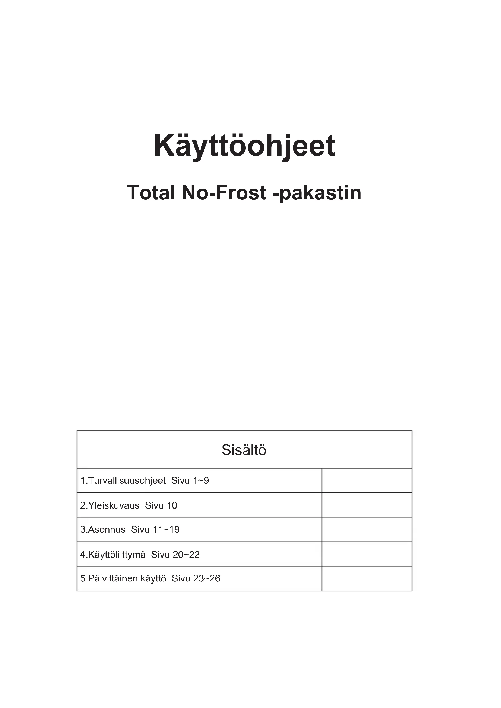 realizadas por un electricista o técnico cualificado. ¡Importante! Se producen algunos ruidos durante el uso normal (compresor, circulación del refrigerante). 25Si no lo usa durante largos periodos de tiempo ¾ Si el electrodoméstico no se utiliza durante un período prolongado de tiempo: ¾ Saque la comida y desenchufe el cable de alimentación. ¾ Limpie el electrodoméstico tal como se describe en la sección «Cuidado y limpieza: General». ¾ Mantenga las puertas y los cajones abiertos para evitar que se generen malos olores en el interior. Interrupción del suministro En caso de un corte de luz, los alimentos deben permanecer en frío durante ver la placa de clasificación. Siga estos consejos durante una interrupción prolongada del suministro, especialmente en verano: ¾ abra la puerta/cajón lo menos posible. ¾ No introduzca más alimentos en el electrodoméstico durante un corte de luz. ¾ Si se da un aviso previo de corte de luz y la duración del mismo es mayor que la cantidad de horas indicada en la placa de clasificación, haga un poco de hielo y póngalo en la parte superior del compartimento frigorífico. ¾ El período de almacenamiento y la calidad de los alimentos se reducirán. Cualquier alimento que se descongele debe consumirse, o bien cocinarse y volver a congelarse (cuando proceda) para evitar riesgos para la salud. Disponibilidad de piezas de repuesto ¾ Los termostatos, los sensores de temperatura, las placas de circuito impresas y las fuentes de luz están disponibles durante un período mínimo de 7 años después de la comercialización de la última unidad del modelo. ¾ Las asas, bisagras, bandejas y cestas lo están durante un período mínimo de 7 años, y las juntas durante un período mínimo de 10 año después de la comercialización de la última unidad del modelo. Para ponerse en contacto con el servicio de asistencia técnica, visite nuestro sitio web: https://corporate.haier- europe.com/en/ En la sección «website», elija la marca de su producto y su país. Se le redirigirá a la página web específica donde podrá encontrar el número de teléfono y el formulario para ponerse en contacto con el servicio de asistencia técnica. Para más información sobre el producto, consulte https:// eprel.ec.europa.eu/ o escanee el código QR en la etiqueta energética suministrada con el electrodoméstico. 26Käyttöohjeet Total No-Frost -pakastin Sisältö 1.Turvallisuusohjeet Sivu 1~9 2.Yleiskuvaus Sivu 10 3.Asennus Sivu 11~19 4.Käyttöliittymä Sivu 20~22 5.Päivittäinen käyttö Sivu 23~26Kiitos, että ostit tämän tuotteen. Lue tämä käyttöopas huolellisesti ennen jääkaapin käyttöä sen suorituskyvyn maksimoimiseksi. Säilytä kaikki asiakirjat myöhempää käyttöä tai muita omistajia varten. Tämä tuote on tarkoitettu vain kotikäyttöön tai vastaavan tyyppiseen käyttöön, kuten: - henkilökunnan keittiöalueella myymälöissä, toimistoissa ja muilla työpaikoilla - maatiloilla, hotellien, motellien ja muiden asuinympäristöjen asiakkaille - aamiaismajoituksissa (B & B) - pitopalveluissa ja vastaaviin käyttötarkoituksiin, jotka eivät ole vähittäismyyntiä. Tätä laitetta saa käyttää vain elintarvikkeiden säilyttämiseen. Muu käyttö katsotaan vaaralliseksi, eikä valmistaja ole vastuussa laiminlyönneistä. Lisäksi on suositeltavaa huomioida takuuehdot. TURVALLISUUSOHJEET Lue käyttö- ja asennusohjeet huolellisesti! Ne sisältävät tärkeää tietoa laitteen asennuksesta, käytöstä ja huollosta. Laitteen valmistaja ei ole vastuussa sellaista seurauksista, jotka johtuvat laitteen ohjeiden ja varoitusten noudattamatta jättämisestä. Säilytä kaikki asiakirjat, jotta voit luovuttaa ne seuraavalle mahdolliselle omistajalle. x Älä liitä laitetta verkkovirtaan, ennen kuin kaikki pakkaus- ja suojamateriaalit on poistettu. Pidä kaikki pakkausmateriaali poissa lasten ulottuvilta. Laatikkopahvi ja muovipussit voivat aiheuttaa tukehtumisvaaran! x Anna laitteen olla käyttämättömänä vähintään 4 tuntia ennen sen käynnistämistä, jotta kompressorin öljy pääsee asettumaan, jos tuotetta on kuljetettu vaakatasossa. x Varmista, ettei ole kuljetusvaurioita. x Älä vaurioita jäähdytyspiiriä. 1x Pidä laitteen kotelon tai rakenteelliset tuuletusaukot vapaina esteistä. x Älä koskaan pese kompressorin paikkaa vedellä. Pyyhi se kuivalla liinalla huolellisesti puhdistuksen jälkeen ruostumisen estämiseksi. x Laite on painava ja sen vuoksi sen käsittelemiseen tarvitaan aina vähintään kaksi henkilöä. x Asenna ja säädä laitteen jalkoja tarpeen mukaan niin että laite on tasapainossa ja tasaisesti. Asennuspaikan on oltava sopivan kokoinen ja sovelluttava laitteen käyttötarkoitukseen. x Varmista, että laitteen arvokilvessä ilmoitetut sähkötiedot vastaavat käytettävissä olevaa virransyöttöä. Jos näin ei ole, ota yhteyttä sähköasentajaan. x Verkkoliitäntä: 220–240 V, 50 Hz Epänormaali jännitevaihtelu voi estää laitteen käynnistymisen tai vaurioittaa lämpötilan säätöä tai kompressoria tai aiheuttaa epänormaalia käyntiääntä. Tässä tapauksessa laitteeseen on asennettava automaattinen jännitteensäädin. x Vain Iso-Britannia: Laitteen virtajohtoon on liitetty 3-haarainen (maadoitettu) pistoke, joka sopii 3-haaraiseen (maadoitettuun) pistorasiaan. Kolmatta tappia (maadoitus) ei koskaan saa leikata pois tai poistaa jollakin muulla tavalla. Pistoke tulisi olla käytettävissä laitteen asennuksen jälkeen. x Varmista, että virtajohto ei ole jäänyt laitteen alle kuljetuksen tai siirron aikana tai sen jälkeen, 2koska tämä voisi aiheuttaa virtajohdon katkeamisen tai vahingoittumisen. Jos virtajohto on vaurioitunut, valmistajan, sen huoltoedustajan tai vastaavan ammattitaitoisen henkilön on vaihdettava se vaaran välttämiseksi. x Älä asenna laitetta kosteaan, öljyiseen tai pölyiseen paikkaan äläkä altista laitetta suoralle auringonvalolle ja vedelle. x Älä asen