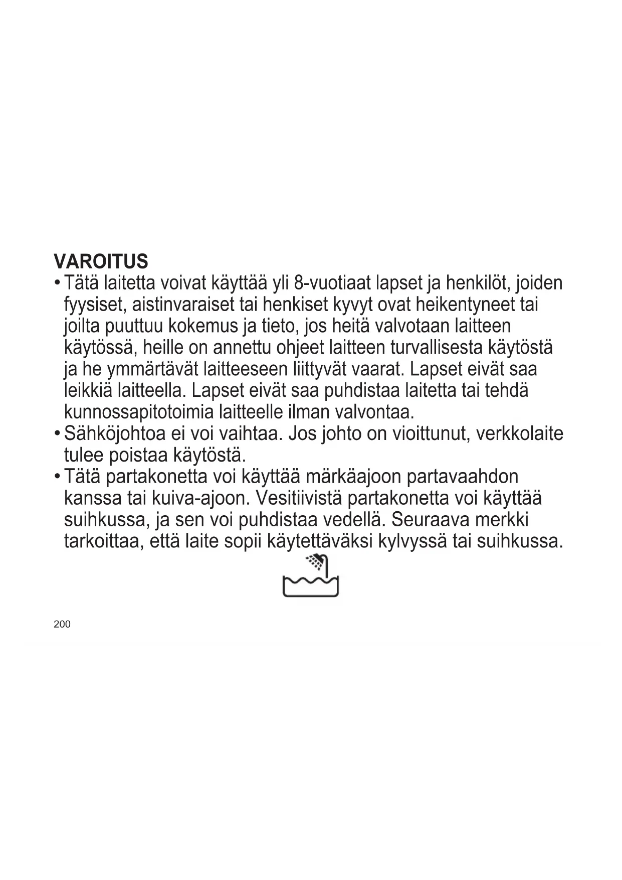 Tätä laitetta voivat käyttää yli 8‑vuotiaat lapset ja henkilöt, joiden fyysiset, aistinvaraiset tai henkiset kyvyt ovat heikentyneet tai joilta puuttuu kokemus ja tieto, jos heitä valvotaan laitteen käytössä, heille on annettu ohjeet laitteen turvallisesta käytöstä ja he ymmärtävät laitteeseen liittyvät vaarat. Lapset eivät saa leikkiä laitteella. Lapset eivät saa puhdistaa laitetta tai tehdä kunnossapitotoimia laitteelle ilman valvontaa.