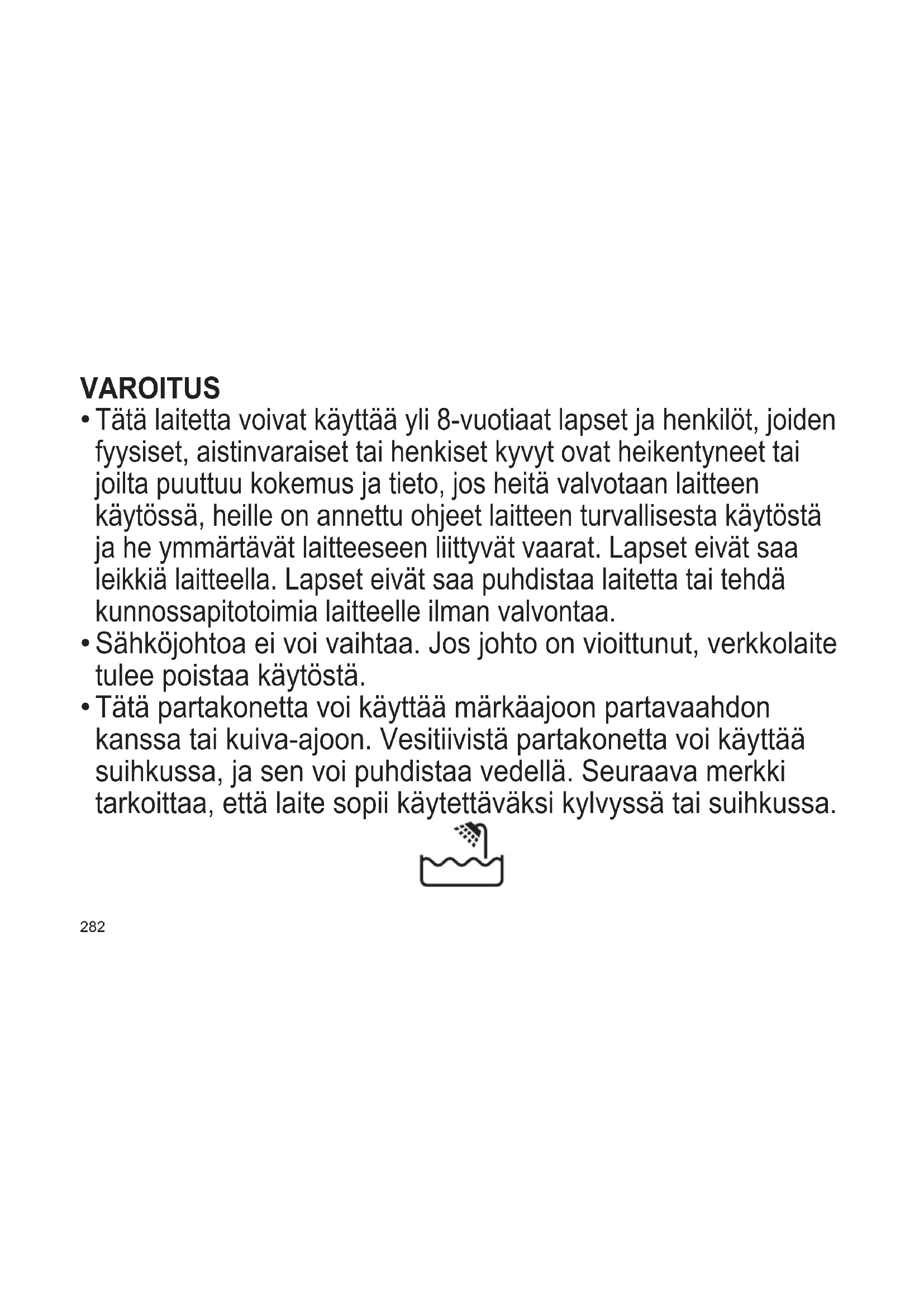Tätä partakonetta voi käyttää märkäajoon partavaahdon kanssa tai kuiva‑ajoon. Vesitiivistä partakonetta voi käyttää suihkussa, ja sen voi puhdistaa vedellä. Seuraava merkki tarkoittaa, että laite sopii käytettäväksi kylvyssä tai suihkussa.283 TR RO H SK CZ PL FIN S N P DK E NL I F D GB