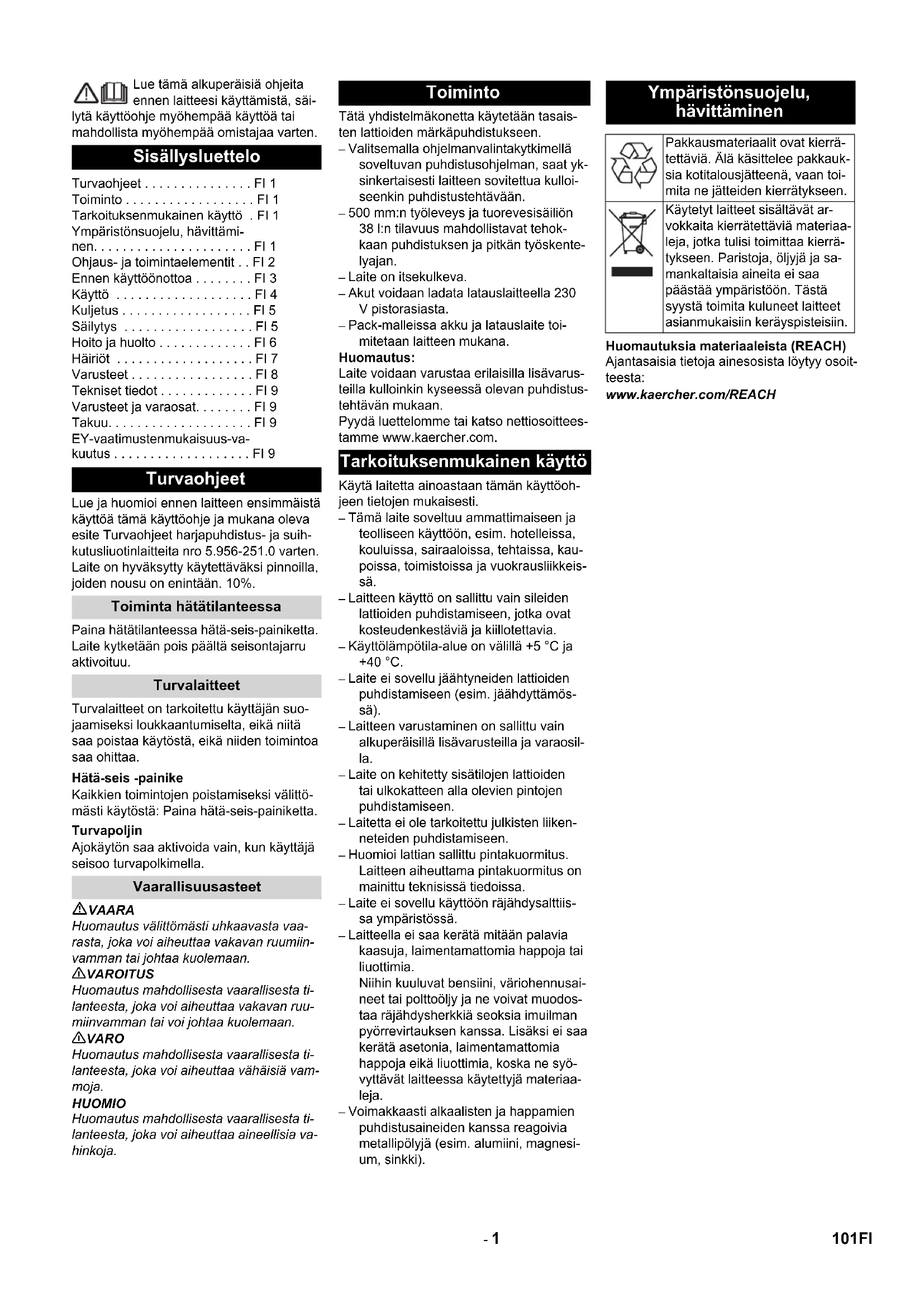 Chairman of the Board of Management Director Regulatory Affairs & Certification 100 SV- 1 Lue tämä alkuperäisiä ohjeita ennen laitteesi käyttämistä, säi- lytä käyttöohje myöhempää käyttöä tai mahdollista myöhempää omistajaa varten. Lue ja huomioi ennen laitteen ensimmäistä käyttöä tämä käyttöohje ja mukana oleva esite Turvaohjeet harjapuhdistus- ja suih- kutusliuotinlaitteita nro 5.956-251.0 varten. Laite on hyväksytty käytettäväksi pinnoilla, joiden nousu on enintään. 10%. Paina hätätilanteessa hätä-seis-painiketta. Laite kytketään pois päältä seisontajarru aktivoituu. Turvalaitteet on tarkoitettu käyttäjän suo- jaamiseksi loukkaantumiselta, eikä niitä saa poistaa käytöstä, eikä niiden toimintoa saa ohittaa. Kaikkien toimintojen poistamiseksi välittö- mästi käytöstä: Paina hätä-seis-painiketta. Ajokäytön saa aktivoida vain, kun käyttäjä seisoo turvapolkimella. VAARA Huomautus välittömästi uhkaavasta vaa- rasta, joka voi aiheuttaa vakavan ruumiin- vamman tai johtaa kuolemaan. 몇 VAROITUS Huomautus mahdollisesta vaarallisesta ti- lanteesta, joka voi aiheuttaa vakavan ruu- miinvamman tai voi johtaa kuolemaan. 몇 VARO Huomautus mahdollisesta vaarallisesta ti- lanteesta, joka voi aiheuttaa vähäisiä vam- moja. HUOMIO Huomautus mahdollisesta vaarallisesta ti- lanteesta, joka voi aiheuttaa aineellisia va- hinkoja. Tätä yhdistelmäkonetta käytetään tasais- ten lattioiden märkäpuhdistukseen. – Valitsemalla ohjelmanvalintakytkimellä soveltuvan puhdistusohjelman, saat yk- sinkertaisesti laitteen sovitettua kulloi- seenkin puhdistustehtävään. – 500 mm:n työleveys ja tuorevesisäiliön 38 l:n tilavuus mahdollistavat tehok- kaan puhdistuksen ja pitkän työskente- lyajan. – Laite on itsekulkeva. – Akut voidaan ladata latauslaitteella 230 V pistorasiasta. – Pack-malleissa akku ja latauslaite toi- mitetaan laitteen mukana. Huomautus: Laite voidaan varustaa erilaisilla lisävarus- teilla kulloinkin kyseessä olevan puhdistus- tehtävän mukaan. Pyydä luettelomme tai katso nettiosoittees- tamme www.kaercher.com. Käytä laitetta ainoastaan tämän käyttöoh- jeen tietojen mukaisesti. – Tämä laite soveltuu ammattimaiseen ja teolliseen käyttöön, esim. hotelleissa, kouluissa, sairaaloissa, tehtaissa, kau- poissa, toimistoissa ja vuokrausliikkeis- sä. – Laitteen käyttö on sallittu vain sileiden lattioiden puhdistamiseen, jotka ovat kosteudenkestäviä ja kiillotettavia. – Käyttölämpötila-alue on välillä +5 °C ja +40 °C. – Laite ei sovellu jäähtyneiden lattioiden puhdistamiseen (esim. jäähdyttämös- sä). – Laitteen varustaminen on sallittu vain alkuperäisillä lisävarusteilla ja varaosil- la. – Laite on kehitetty sisätilojen lattioiden tai ulkokatteen alla olevien pintojen puhdistamiseen. – Laitetta ei ole tarkoitettu julkisten liiken- neteiden puhdistamiseen. – Huomioi lattian sallittu pintakuormitus. Laitteen aiheuttama pintakuormitus on mainittu teknisissä tiedoissa. – Laite ei sovellu käyttöön räjähdysalttiis- sa ympäristössä. – Laitteella ei saa kerätä mitään palavia kaasuja, laimentamattomia happoja tai liuottimia. Niihin kuuluvat bensiini, väriohennusai- neet tai polttoöljy ja ne voivat muodos- taa räjähdysherkkiä seoksia imuilman pyörrevirtauksen kanssa. Lisäksi ei saa kerätä asetonia, laimentamattomia happoja eikä liuottimia, koska ne syö- vyttävät laitteessa käytettyjä materiaa- leja. – Voimakkaasti alkaalisten ja happamien puhdistusaineiden kanssa reagoivia metallipölyjä (esim. alumiini, magnesi- um, sinkki). Huomautuksia materiaaleista (REACH) Ajantasaisia tietoja ainesosista löytyy osoit- teesta: www.kaercher.com/REACH Sisällysluettelo Turvaohjeet . . . . . . . . . . . . . . . FI 1 Toiminto . . . . . . . . . . . . . . . . . . FI 1 Tarkoituksenmukainen käyttö . FI 1 Ympäristönsuojelu, hävittämi- nen. . . . . . . . . . . . . . . . . . . . . . FI 1 Ohjaus- ja toimintaelementit . . FI 2 Ennen käyttöönottoa . . . . . . . . FI 3 Käyttö . . . . . . . . . . . . . . . . . . . FI 4 Kuljetus . . . . . . . . . . . . . . . . . . FI 5 Säilytys . . . . . . . . . . . . . . . . . . FI 5 Hoito ja huolto . . . . . . . . . . . . . FI 6 Häiriöt . . . . . . . . . . . . . . . . . . . FI 7 Varusteet . . . . . . . . . . . . . . . . . FI 8 Tekniset tiedot . . . . . . . . . . . . . FI 9 Varusteet ja varaosat. . . . . . . . FI 9 Takuu. . . . . . . . . . . . . . . . . . . . FI 9 EY-vaatimustenmukaisuus-va- kuutus . . . . . . . . . . . . . . . . . . . FI 9 Turvaohjeet Toiminta hätätilanteessa Turvalaitteet Hätä-seis -painike Turvapoljin Vaarallisuusasteet Toiminto Tarkoituksenmukainen käyttö Ympäristönsuojelu, hävittäminen Pakkausmateriaalit ovat kierrä- tettäviä. Älä käsittelee pakkauk- sia kotitalousjätteenä, vaan toi- mita ne jätteiden kierrätykseen. Käytetyt laitteet sisältävät ar- vokkaita kierrätettäviä materiaa- leja, jotka tulisi toimittaa kierrä- tykseen. Paristoja, öljyjä ja sa- mankaltaisia aineita ei saa päästää ympäristöön. Tästä syystä toimita kuluneet laitteet asianmukaisiin keräyspisteisiin. 101FI- 2 1 Letkuliitäntä, täyttöautomatiikka 2 Raikasvesisäiliö 3 Lataustilannäyttö (vain versio Bp Pack) 4 Likavesisäiliö 5 Uimuri 6 Likaveden laskuletku 7 Laitepistoke 8 Akkupistoke 9 Akku 10 Latauslaitteen verkkopistoke (vain mal- lissa Bp Pack) 11 Imupalkki 12 Venttiili tuorevesi 13 Tuorevesisiivilä 14 Raikasvesisäiliön kansi 15 Puhdistuspää 16 Imupalkin kiinnitys pahoin likaantuneita kohteita varten (kaksivaihemenetelmä) 17 Raikasveden täyttötasonäyttö Raikasveden laskuletku 18 Ajopoljin 19 Käyttäjän seisontataso 20 Turvapoljin 21 Lukitus 22 Ohjauspulpetti 23 Ohjauspyörä 24 Vapautusvipu, ajo 25 Vapautusvipu, työntö A Suurten roskien lakaisulaatikko (vain BR-malli) B Roiskesuoja, sivulla (vain BR-malli) – Puhdistusprosessin käyttöelimet ovat keltaisia. – Huoll