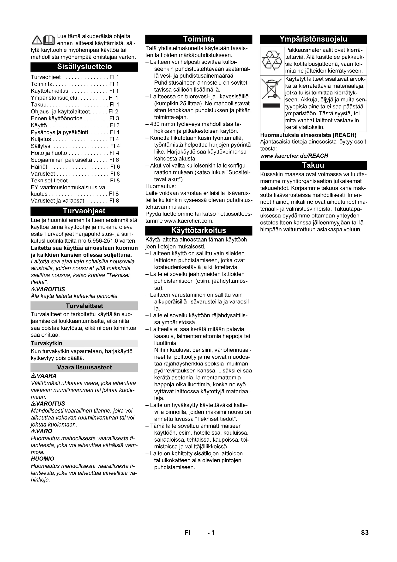 Tillbehör och reservdelar Chairman of the Board of Management Director Regulatory Affairs & Certification 82 SV- 1 Lue tämä alkuperäisiä ohjeita ennen laitteesi käyttämistä, säi- lytä käyttöohje myöhempää käyttöä tai mahdollista myöhempää omistajaa varten. Lue ja huomioi ennen laitteen ensimmäistä käyttöä tämä käyttöohje ja mukana oleva esite Turvaohjeet harjapuhdistus- ja suih- kutusliuotinlaitteita nro 5.956-251.0 varten. Laitetta saa käyttää ainoastaan kuomun ja kaikkien kansien ollessa suljettuna. Laitetta saa ajaa vain sellaisilla nousevilla alustoilla, joiden nousu ei ylitä maksimia sallittua nousua, katso kohtaa "Tekniset tiedot". 몇 VAROITUS Älä käytä laitetta kaltevilla pinnoilla. Turvalaitteet on tarkoitettu käyttäjän suo- jaamiseksi loukkaantumiselta, eikä niitä saa poistaa käytöstä, eikä niiden toimintoa saa ohittaa. Kun turvakytkin vapautetaan, harjakäyttö kytkeytyy pois päältä. VAARA Välittömästi uhkaava vaara, joka aiheuttaa vakavan ruumiinvamman tai johtaa kuole- maan. 몇 VAROITUS Mahdollisesti vaarallinen tilanne, joka voi aiheuttaa vakavan ruumiinvamman tai voi johtaa kuolemaan. 몇 VARO Huomautus mahdollisesta vaarallisesta ti- lanteesta, joka voi aiheuttaa vähäisiä vam- moja. HUOMIO Huomautus mahdollisesta vaarallisesta ti- lanteesta, joka voi aiheuttaa aineellisia va- hinkoja. Tätä yhdistelmäkonetta käytetään tasais- ten lattioiden märkäpuhdistukseen. – Laitteen voi helposti sovittaa kulloi- seenkin puhdistustehtävään säätämäl- lä vesi- ja puhdistusainemäärää. Puhdistusaineen annostelu on sovitet- tavissa säiliöön lisäämällä. – Laitteessa on tuorevesi- ja likavesisäiliö (kumpikin 25 litraa). Ne mahdollistavat siten tehokkaan puhdistuksen ja pitkän toiminta-ajan. – 430 mm:n työleveys mahdollistaa te- hokkaan ja pitkäkestoisen käytön. – Konetta liikutetaan käsin työntämällä, työntämistä helpottaa harjojen pyörintä- liike. Harjakäyttö saa käyttövoimansa kahdesta akusta. – Akut voi valita kulloisenkin laitekonfigu- raation mukaan (katso lukua "Suositel- tavat akut") Huomautus: Laite voidaan varustaa erilaisilla lisävarus- teilla kulloinkin kyseessä olevan puhdistus- tehtävän mukaan. Pyydä luettelomme tai katso nettiosoittees- tamme www.kaercher.com. Käytä laitetta ainoastaan tämän käyttöoh- jeen tietojen mukaisesti. – Laitteen käyttö on sallittu vain sileiden lattioiden puhdistamiseen, jotka ovat kosteudenkestäviä ja kiillotettavia. – Laite ei sovellu jäähtyneiden lattioiden puhdistamiseen (esim. jäähdyttämös- sä). – Laitteen varustaminen on sallittu vain alkuperäisillä lisävarusteilla ja varaosil- la. – Laite ei sovellu käyttöön räjähdysalttiis- sa ympäristössä. – Laitteella ei saa kerätä mitään palavia kaasuja, laimentamattomia happoja tai liuottimia. Niihin kuuluvat bensiini, väriohennusai- neet tai polttoöljy ja ne voivat muodos- taa räjähdysherkkiä seoksia imuilman pyörrevirtauksen kanssa. Lisäksi ei saa kerätä asetonia, laimentamattomia happoja eikä liuottimia, koska ne syö- vyttävät laitteessa käytettyjä materiaa- leja. – Laite on hyväksytty käytettäväksi kalte- villa pinnoilla, joiden maksimi nousu on annettu luvussa "Tekniset tiedot". – Tämä laite soveltuu ammattimaiseen käyttöön, esim. hotelleissa, kouluissa, sairaaloissa, tehtaissa, kaupoissa, toi- mistoissa ja välittäjäliikkeissä. – Laite on kehitetty sisätilojen lattioiden tai ulkokatteen alla olevien pintojen puhdistamiseen. Huomautuksia ainesosista (REACH) Ajantasaisia tietoja ainesosista löytyy osoit- teesta: www.kaercher.de/REACH Kussakin maassa ovat voimassa valtuutta- mamme myyntiorganisaation julkaisemat takuuehdot. Korjaamme takuuaikana mak- sutta lisävarusteissa mahdollisesti ilmen- neet häiriöt, mikäli ne ovat aiheutuneet ma- teriaali- ja valmistusvirheistä. Takuutapa- uksessa pyydämme ottamaan yhteyden ostotositteen kanssa jälleenmyyjään tai lä- himpään valtuutettuun asiakaspalveluun. Sisällysluettelo Turvaohjeet . . . . . . . . . . . . . . . FI 1 Toiminta. . . . . . . . . . . . . . . . . . FI 1 Käyttötarkoitus. . . . . . . . . . . . . FI 1 Ympäristönsuojelu. . . . . . . . . . FI 1 Takuu. . . . . . . . . . . . . . . . . . . . FI 1 Ohjaus- ja käyttölaitteet. . . . . . FI 2 Ennen käyttöönottoa . . . . . . . . FI 3 Käyttö . . . . . . . . . . . . . . . . . . . FI 3 Pysähdys ja pysäköinti . . . . . . FI 4 Kuljetus . . . . . . . . . . . . . . . . . . FI 4 Säilytys . . . . . . . . . . . . . . . . . . FI 4 Hoito ja huolto . . . . . . . . . . . . . FI 4 Suojaaminen pakkaselta . . . . . FI 6 Häiriöt . . . . . . . . . . . . . . . . . . . FI 6 Varusteet . . . . . . . . . . . . . . . . . FI 8 Tekniset tiedot . . . . . . . . . . . . . FI 8 EY-vaatimustenmukaisuus-va- kuutus . . . . . . . . . . . . . . . . . . . FI 8 Varusteet ja varaosat. . . . . . . . FI 8 Turvaohjeet Turvalaitteet Turvakytkin Vaarallisuusasteet Toiminta Käyttötarkoitus Ympäristönsuojelu Pakkausmateriaalit ovat kierrä- tettäviä. Älä käsittelee pakkauk- sia kotitalousjätteenä, vaan toi- mita ne jätteiden kierrätykseen. Käytetyt laitteet sisältävät arvok- kaita kierrätettäviä materiaaleja, jotka tulisi toimittaa kierrätyk- seen. Akkuja, öljyjä ja muita sen- tyyppisiä aineita ei saa päästää ympäristöön. Tästä syystä, toi- mita vanhat laitteet vastaaviin keräilylaitoksiin. Takuu 83FI- 2 1 Nukkasihti 2 Turvakytkin 3 Akku * 4 Likaveden poistoletku annostelulaitteel-