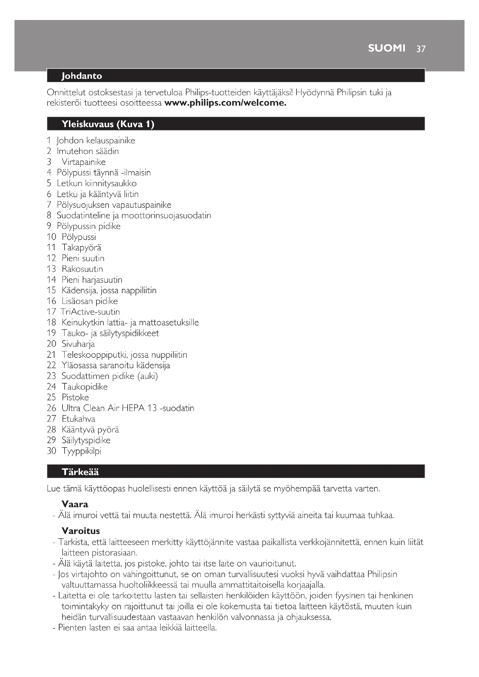- Los ltros HEPA 13 Ultra Clean Air están disponibles con el número de modelo FC8038. Medio ambiente - Al nal de su vida útil, no tire el aparato junto con la basura normal del hogar. Llévelo a un punto de recogida ocial para su reciclado. De esta manera ayudará a conservar el medio ambiente (g. 32). Garantía y servicio Si necesita información o tiene algún problema, visite la página Web de Philips en www.philips.com o póngase en contacto con el Servicio de Atención al Cliente de Philips en su país. Hallará el número de teléfono en el folleto de la garantía mundial. Si no hay Servicio de Atención al Cliente de Philips en su país, diríjase a su distribuidor local Philips. ESPAÑOL 35Guía de resolución de problemas En este capítulo se resumen los problemas más frecuentes que pueden surgir. Si no puede resolver el problema con la siguiente información, póngase en contacto con el Servicio de Atención al Cliente de su país. 1 Lapotenciadesucciónesinsuciente. A Puede que la bolsa del polvo esté llena. - Cambie la bolsa. B Puede que los ltros estén sucios. - Limpie o cambie los ltros. C Puede que la potencia de succión esté establecida en un nivel demasiado bajo. - Aumente la potencia de succión. D Puede que el cepillo, el tubo o la manguera estén obstruidos (g. 33). - Para eliminar la obstrucción, desconecte la pieza obstruida y conéctela al revés (en la medida que sea posible). Ponga en marcha el aspirador para hacer que el aire pase a través de la pieza obstruida en dirección contraria. 2 Cuandoutilizolaaspiradoraavecessientodescargaseléctricas. A El aspirador ha creado electricidad estática. Cuanto más bajo es el nivel de humedad en las habitaciones, más electricidad estática crea el aparato. - Para reducir este problema, le recomendamos descargar el aparato apoyando frecuentemente el tubo sobre otros objetos de metal de la habitación (como por ejemplo, las patas de una mesa o silla, un radiador, etc.). - Para reducir este problema, le recomendamos elevar el nivel de humedad en el aire de la habitación colocando un recipiente con agua en la habitación. Por ejemplo, puede colgar botellas de agua en los radiadores o colocar recipientes llenos de agua en los radiadores o cerca de ellos. ESPAÑOL3637 Johdanto Onnittelut ostoksestasi ja tervetuloa Philips-tuotteiden käyttäjäksi! Hyödynnä Philipsin tuki ja rekisteröi tuotteesi osoitteessa www.philips.com/welcome. Yleiskuvaus (Kuva 1) 1 Johdon kelauspainike 2 Imutehon säädin 3 Virtapainike 4 Pölypussi täynnä -ilmaisin 5 Letkun kiinnitysaukko 6 Letku ja kääntyvä liitin 7 Pölysuojuksen vapautuspainike 8 Suodatinteline ja moottorinsuojasuodatin 9 Pölypussin pidike 10 Pölypussi 11 Takapyörä 12 Pieni suutin 13 Rakosuutin 14 Pieni harjasuutin 15 Kädensija, jossa nappiliitin 16 Lisäosan pidike 17 TriActive-suutin 18 Keinukytkin lattia- ja mattoasetuksille 19 Tauko- ja säilytyspidikkeet 20 Sivuharja 21 Teleskooppiputki, jossa nuppiliitin 22 Yläosassa saranoitu kädensija 23 Suodattimen pidike (auki) 24 Taukopidike 25 Pistoke 26 Ultra Clean Air HEPA 13 -suodatin 27 Etukahva 28 Kääntyvä pyörä 29 Säilytyspidike 30 Tyyppikilpi Tärkeää Lue tämä käyttöopas huolellisesti ennen käyttöä ja säilytä se myöhempää tarvetta varten. Vaara - Älä imuroi vettä tai muuta nestettä. Älä imuroi herkästi syttyviä aineita tai kuumaa tuhkaa. Varoitus - Tarkista, että laitteeseen merkitty käyttöjännite vastaa paikallista verkkojännitettä, ennen kuin liität laitteen pistorasiaan. - Älä käytä laitetta, jos pistoke, johto tai itse laite on vaurioitunut. - Jos virtajohto on vahingoittunut, se on oman turvallisuutesi vuoksi hyvä vaihdattaa Philipsin valtuuttamassa huoltoliikkeessä tai muulla ammattitaitoisella korjaajalla. - Laitetta ei ole tarkoitettu lasten tai sellaisten henkilöiden käyttöön, joiden fyysinen tai henkinen toimintakyky on rajoittunut tai joilla ei ole kokemusta tai tietoa laitteen käytöstä, muuten kuin heidän turvallisuudestaan vastaavan henkilön valvonnassa ja ohjauksessa. - Pienten lasten ei saa antaa leikkiä laitteella. SUOMI- Pistoke on irrotettava pistorasiasta ennen laitteen puhdistusta tai huoltoa. - Älä osoita letkulla, putkella tai muilla osilla ketään silmiin tai korviin. Älä laita suuhusi letkua, joka on kytketty käynnissä olevaan pölynimuriin. Varoitus - Kun imuroit pölynimurilla tuhkaa, hienoa hiekkaa, kalkkia, sementtiä tai muita vastaavia aineita, pölypussin huokoset tukkeutuvat. Tällöin Pölypussi täynnä -ilmaisin ilmoittaa pölypussin olevan täynnä. Vaihda pölypussi, vaikka se ei olisi vielä täynnä (katso kohta Pölypussin vaihtaminen). - Älä käytä laitetta ilman moottorinsuojasuodatinta, sillä silloin moottori saattaa vioittua ja laitteen käyttöikä lyhentyä. - Käytä vain synteettisiä Philips s-bag