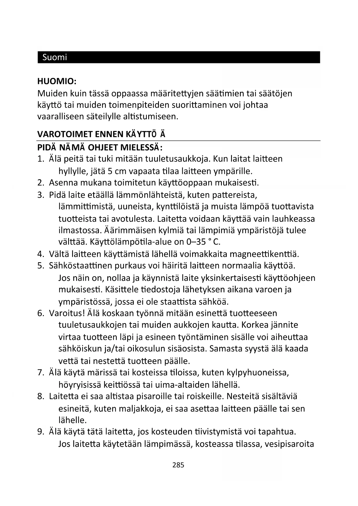 9. Älä käytä tätä laitetta, jos kosteuden tiivistymistä voi tapahtua.