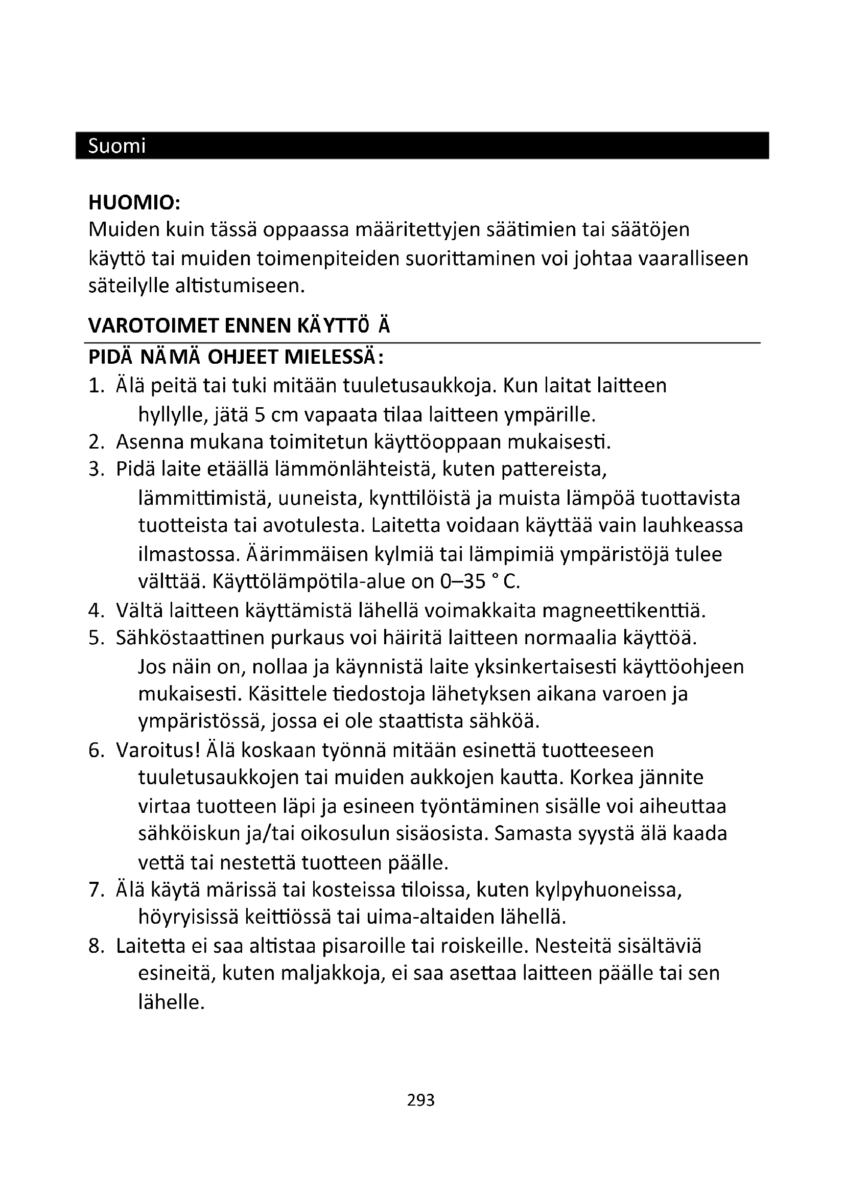 esineitä, kuten maljakkoja, ei saa asettaa laitteen päälle tai sen lähelle.294