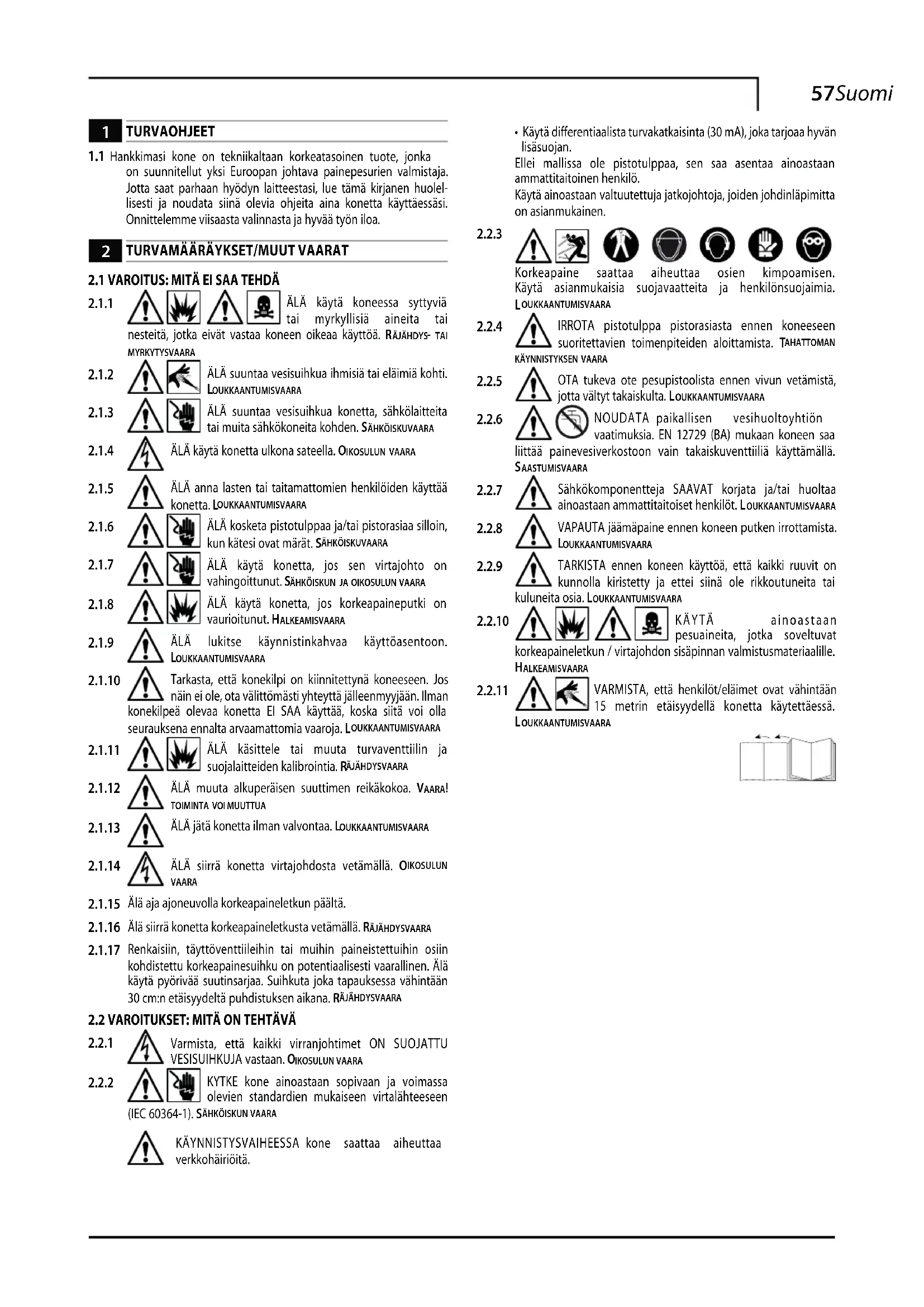Koneen käyttö on kiellettyä henkilöiltä, jotka eivät tunne sen käyt-töä tai eivät ole lukeneet käyttöoppaan ohjeita huolellisesti.Älä käytä koneessa syttyviä, räjähdysvaarallisia tai myrkyllisiä nesteitä.Älä käytä konetta potentiaalisesti syttyvässä tai räjähdysvaaralli-sessa tilassa.Älä käytä ei-alkuperäisiä tai eri mallille tarkoitettuja varusteita.Älä muuta konetta; muutokset mitätöivät standardienmukaisuus-todistuksen ja vapauttavat valmistajan siviili- ja rikosoikeudellisesta vastuusta.
