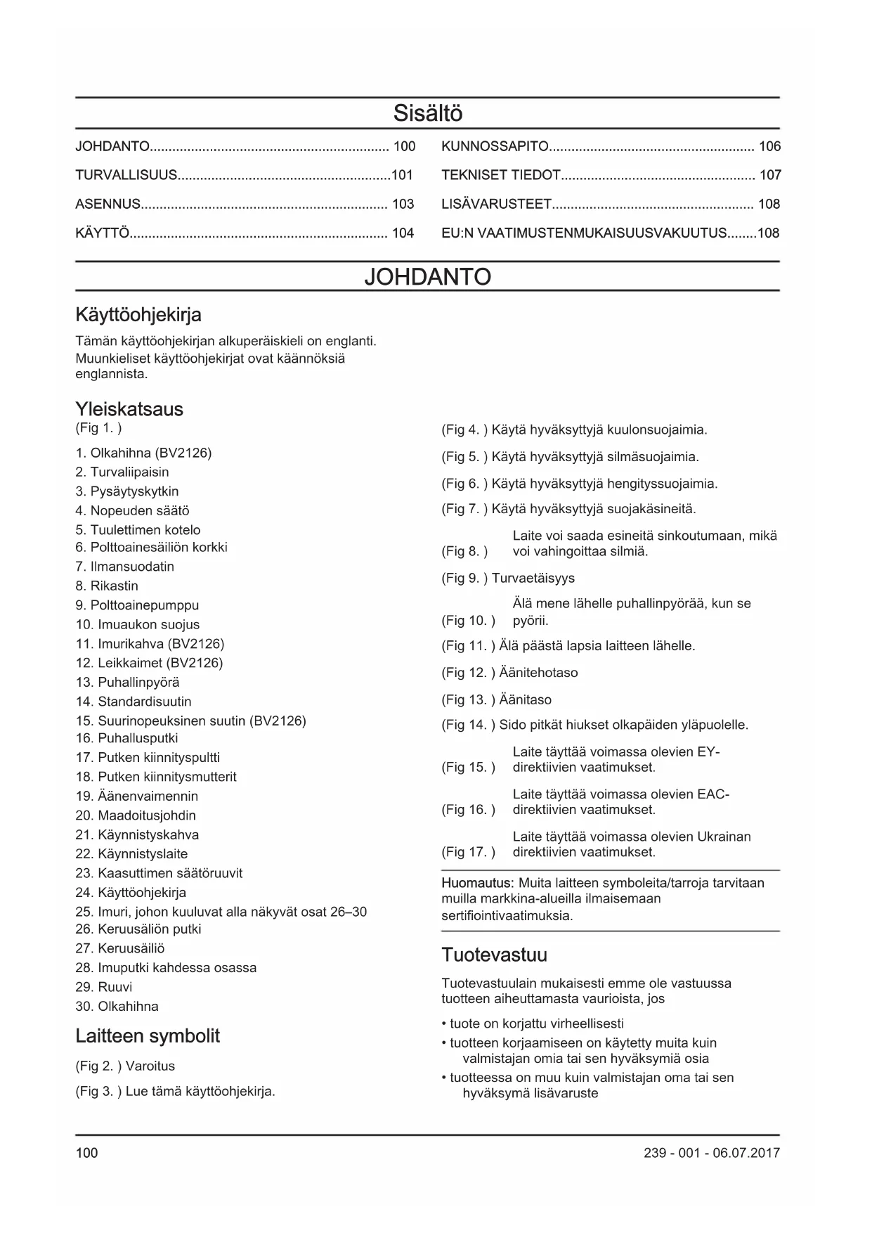 Laitteen symbolit (Fig 2. ) Varoitus (Fig 3. ) Lue tämä käyttöohjekirja. (Fig 4. ) Käytä hyväksyttyjä kuulonsuojaimia. (Fig 5. ) Käytä hyväksyttyjä silmäsuojaimia. (Fig 6. ) Käytä hyväksyttyjä hengityssuojaimia. (Fig 7. ) Käytä hyväksyttyjä suojakäsineitä. (Fig 8. ) Laite voi saada esineitä sinkoutumaan, mikä voi vahingoittaa silmiä. (Fig 9. ) Turvaetäisyys (Fig 10. ) Älä mene lähelle puhallinpyörää, kun se pyörii. (Fig 11. ) Älä päästä lapsia laitteen lähelle. (Fig 12. ) Äänitehotaso (Fig 13. ) Äänitaso (Fig 14. ) Sido pitkät hiukset olkapäiden yläpuolelle. (Fig 15. ) Laite täyttää voimassa olevien EY- direktiivien vaatimukset. (Fig 16. ) Laite täyttää voimassa olevien EAC- direktiivien vaatimukset. (Fig 17. ) Laite täyttää voimassa olevien Ukrainan direktiivien vaatimukset. Huomautus: Muita laitteen symboleita/tarroja tarvitaan muilla markkina-alueilla ilmaisemaan sertifiointivaatimuksia. Tuotevastuu Tuotevastuulain mukaisesti emme ole vastuussa tuotteen aiheuttamasta vaurioista, jos