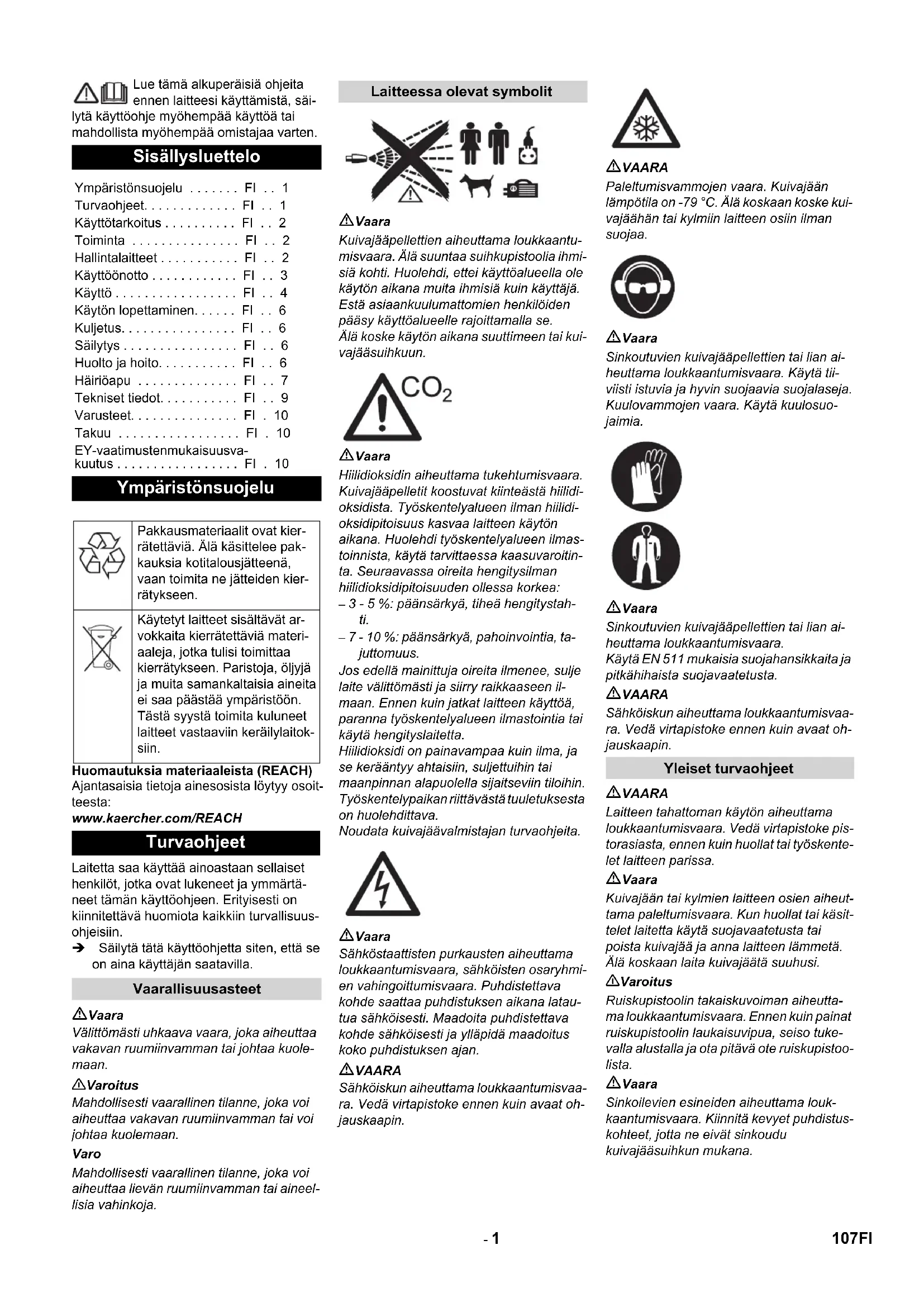 - torr och oljefri, minst en efterkylare och en avskiljare måste vara ansluten bakom kompressorn. Tryckluftsbehov Bullernivå Ljudtrycksnivå 105SV- 10 Fullsiktsglasögon, anti-imma, artikelnr. 6.321-208.0 Handskar som skyddar mot kyla, med halk- hämmande profil, kategori III enligt EN 511, artikelnr. 6.321-210.0 Hörselskydd med huvudbygel, artikelnr. 6.321-207.0 Rundstrålemunstycke, kort Artikelnr. 4.321-236.0 Rundstrålemunstycke, långt Artikelnr. 4.321-234.0 Flatstrålemunstycke, kort Artikelnr. 4.321-237.0 Flatstrålemunstycke, långt, medföljer leve- ransen Artikelnr. 4.321-235.0 Rundstrålemunstycke, vinklat Artikelnr. 4.321-249.0 Flatstrålemunstycke, vinklat Artikelnr. 4.321-250.0 Scrambler Artikelnr. 4.110-015.0 Munstycksförlängning, 300 mm lång Artikelnr. 5.760-001.0 Handtag Artikelnr. 4.321-248.0 Arbetsbelysning Artikelnr. 2.815-421.0 I respektive land gäller de garantivillkor som publicerats av våra auktoriserade dist- ributörer. Eventuella fel på maskinen repa- reras utan kostnad inom garantiperioden, under förutsättning att det orsakats av ett material- eller tillverkningsfel. I frågor som gäller garantin ska du vända dig med kvitto till inköpsstället eller närmaste, auktorise- rad kundtjänst. Härmed försäkrar vi att nedanstående be- tecknade maskin i ändamål och konstruk- tion samt i den av oss levererade versionen motsvarar EU-direktivens tillämpliga grundläggande säkerhets- och hälsokrav. Vid ändringar på maskinen som inte har godkänts av oss blir denna överensstäm- melseförklaring ogiltig. Undertecknande agerar på uppdrag av och med styrelsens godkännande. Dokumentationsbefullmäktigad: S. Reiser Alfred Kärcher SE & Co. KG Alfred-Kärcher-Straße 28-40 71364 Winnenden (Germany) Tel.: +49 7195 14-0 Fax: +49 7195 14-2212 Winnenden, 2021/02/01 Tillbehör Skyddsklädsel Strålanordning Garanti EU-försäkran om överens- stämmelse Produkt: Torrisstrålaggregat Typ: 1.574-xxx Tillämpliga EU-direktiv 2011/65/EU 2006/42/EG (+2009/127/EG) 2014/30/EU 2009/125/EG + 2009/1781 Tillämpade harmoniserade normer EN 55014–1: 2017 + A11: 2020 EN 55014–2: 2015 EN 60204–1 EN 61000–3–2: 2014 EN 61000–3–3: 2013 EN IEC 63000: 2018 EN 62233: 2008 Tillämpade nationella normer GS-STE-13 (i enlighet med) Chairman of the Board of Management Director Regulatory Affairs & Certification 106 SV- 1 Lue tämä alkuperäisiä ohjeita ennen laitteesi käyttämistä, säi- lytä käyttöohje myöhempää käyttöä tai mahdollista myöhempää omistajaa varten. Huomautuksia materiaaleista (REACH) Ajantasaisia tietoja ainesosista löytyy osoit- teesta: www.kaercher.com/REACH Laitetta saa käyttää ainoastaan sellaiset henkilöt, jotka ovat lukeneet ja ymmärtä- neet tämän käyttöohjeen. Erityisesti on kiinnitettävä huomiota kaikkiin turvallisuus- ohjeisiin. Säilytä tätä käyttöohjetta siten, että se on aina käyttäjän saatavilla. Vaara Välittömästi uhkaava vaara, joka aiheuttaa vakavan ruumiinvamman tai johtaa kuole- maan. 몇 Varoitus Mahdollisesti vaarallinen tilanne, joka voi aiheuttaa vakavan ruumiinvamman tai voi johtaa kuolemaan. Varo Mahdollisesti vaarallinen tilanne, joka voi aiheuttaa lievän ruumiinvamman tai aineel- lisia vahinkoja. Vaara Kuivajääpellettien aiheuttama loukkaantu- misvaara. Älä suuntaa suihkupistoolia ihmi- siä kohti. Huolehdi, ettei käyttöalueella ole käytön aikana muita ihmisiä kuin käyttäjä. Estä asiaankuulumattomien henkilöiden pääsy käyttöalueelle rajoittamalla se. Älä koske käytön aikana suuttimeen tai kui- vajääsuihkuun. Vaara Hiilidioksidin aiheuttama tukehtumisvaara. Kuivajääpelletit koostuvat kiinteästä hiilidi- oksidista. Työskentelyalueen ilman hiilidi- oksidipitoisuus kasvaa laitteen käytön aikana. Huolehdi työskentelyalueen ilmas- toinnista, käytä tarvittaessa kaasuvaroitin- ta. Seuraavassa oireita hengitysilman hiilidioksidipitoisuuden ollessa korkea: – 3 - 5 %: päänsärkyä, tiheä hengitystah- ti. – 7 - 10 %: päänsärkyä, pahoinvointia, ta- juttomuus. Jos edellä mainittuja oireita ilmenee, sulje laite välittömästi ja siirry raikkaaseen il- maan. Ennen kuin jatkat laitteen käyttöä, paranna työskentelyalueen ilmastointia tai käytä hengityslaitetta. Hiilidioksidi on painavampaa kuin ilma, ja se kerääntyy ahtaisiin, suljettuihin tai maanpinnan alapuolella sijaitseviin tiloihin. Työskentelypaikan riittävästä tuuletuksesta on huolehdittava. Noudata kuivajäävalmistajan turvaohjeita. Vaara Sähköstaattisten purkausten aiheuttama loukkaantumisvaara, sähköisten osaryhmi- en vahingoittumisvaara. Puhdistettava kohde saattaa puhdistuksen aikana latau- tua sähköisesti. Maadoita puhdistettava kohde sähköisesti ja ylläpidä maadoitus koko puhdistuksen ajan. VAARA Sähköiskun aiheuttama loukkaantumisvaa- ra. Vedä virtapistoke ennen kuin avaat oh- jauskaapin. VAARA Paleltumisvammojen vaara. Kuivajään lämpötila on -79 °C. Älä koskaan koske kui- vajäähän tai kylmiin laitteen osiin ilman suojaa. Vaara Sinkoutuvien kuivajääpellettien tai lian ai- heuttama loukkaantumisvaara. Käytä tii- viisti istuvia ja hyvin suojaavia suojalaseja. Kuulovammojen vaara. Käytä kuulosuo- jaimia. Vaara Sinkoutuvien kuivajääpellettien tai lian ai- heuttama loukkaantumisvaara. Käytä EN 511 mukaisia suojahansikkaita ja pitkähihaista suojavaatetusta. VAARA Sähköiskun aiheuttama loukkaantumisvaa- ra. Vedä virtapistoke ennen kuin avaat oh- jauskaapin. VAARA Laitteen tahattoman käytön aiheuttama loukkaantumisvaara. Vedä virtapistoke pis- torasiasta, ennen kuin huollat tai työskente- let laitteen parissa. Vaara Kuivajään tai kylmien laitteen osien aiheut- tama paleltumisvaara. Kun huollat tai käsit- telet laitetta käytä suojavaatetusta tai poista kuivajää ja anna laitteen lämmetä. Älä koskaan laita kuivajäätä suuhusi. 몇 Varoitus Ruiskupistoolin takaiskuvoiman aiheutta- ma loukkaantumisvaara. Ennen kuin painat ruiskupistoolin