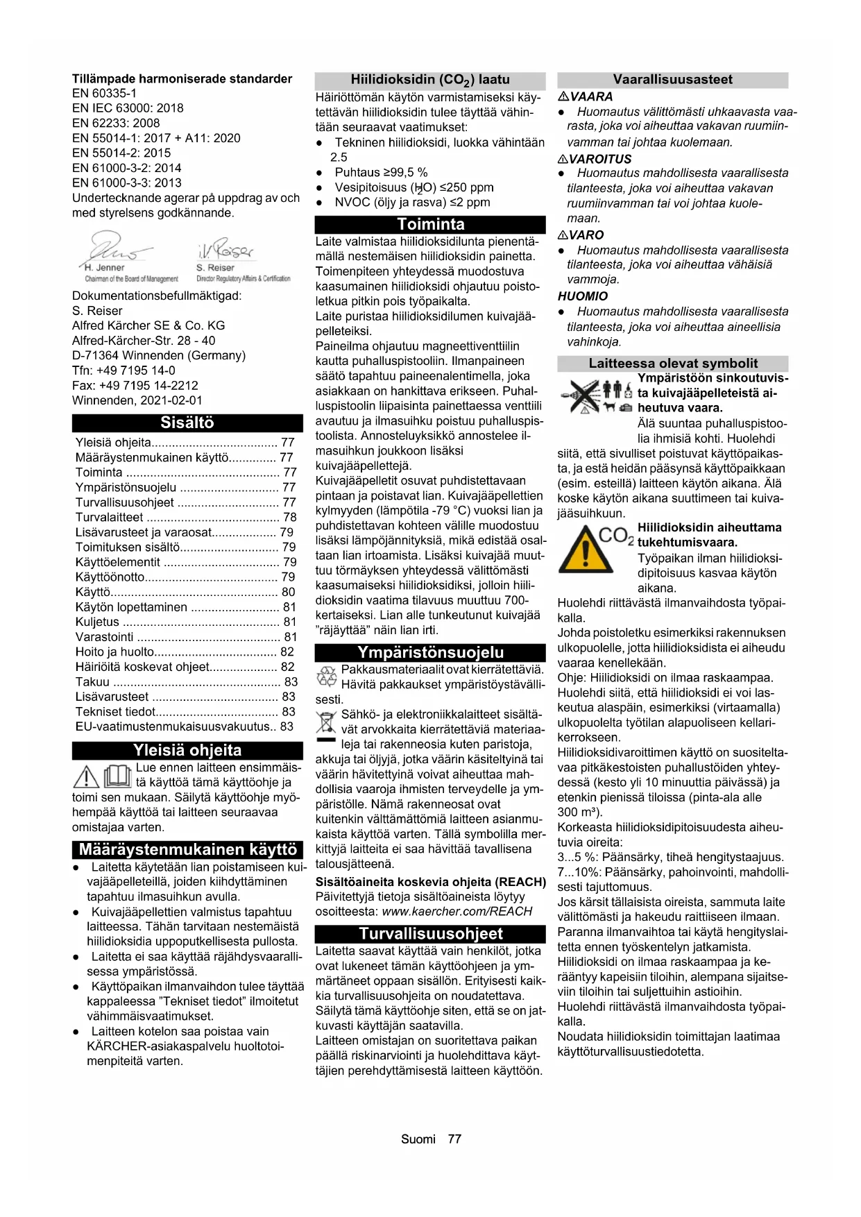 /h 2000 Mått och vikter Typisk arbetsvikt (utan kol- dioxidflaska) kg 95 Längd mm 866 Bredd mm 443 Höjd utan koldioxidflaska mm 970 Fastställda värden enligt EN 60335-2-79 Hand-arm-vibrationsvärde m/s2 0,08 Ljudtrycksnivå dB(A) 95 Ljudeffektsnivå LWA + Osäkerhet KWA dB(A) 115 IB 10/ 8 L2PSuomi 77 Tillämpade harmoniserade standarder EN 60335-1 EN IEC 63000: 2018 EN 62233: 2008 EN 55014-1: 2017 + A11: 2020 EN 55014-2: 2015 EN 61000-3-2: 2014 EN 61000-3-3: 2013 Undertecknande agerar på uppdrag av och med styrelsens godkännande. Dokumentationsbefullmäktigad: S. Reiser Alfred Kärcher SE & Co. KG Alfred-Kärcher-Str. 28 - 40 D-71364 Winnenden (Germany) Tfn: +49 7195 14-0 Fax: +49 7195 14-2212 Winnenden, 2021-02-01 Sisältö Yleisiä ohjeita Lue ennen laitteen ensimmäis- tä käyttöä tämä käyttöohje ja toimi sen mukaan. Säilytä käyttöohje myö- hempää käyttöä tai laitteen seuraavaa omistajaa varten. Määräystenmukainen käyttö ● Laitetta käytetään lian poistamiseen kui- vajääpelleteillä, joiden kiihdyttäminen tapahtuu ilmasuihkun avulla. ● Kuivajääpellettien valmistus tapahtuu laitteessa. Tähän tarvitaan nestemäistä hiilidioksidia uppoputkellisesta pullosta. ● Laitetta ei saa käyttää räjähdysvaaralli- sessa ympäristössä. ● Käyttöpaikan ilmanvaihdon tulee täyttää kappaleessa ”Tekniset tiedot” ilmoitetut vähimmäisvaatimukset. ● Laitteen kotelon saa poistaa vain KÄRCHER-asiakaspalvelu huoltotoi- menpiteitä varten. Hiilidioksidin (CO