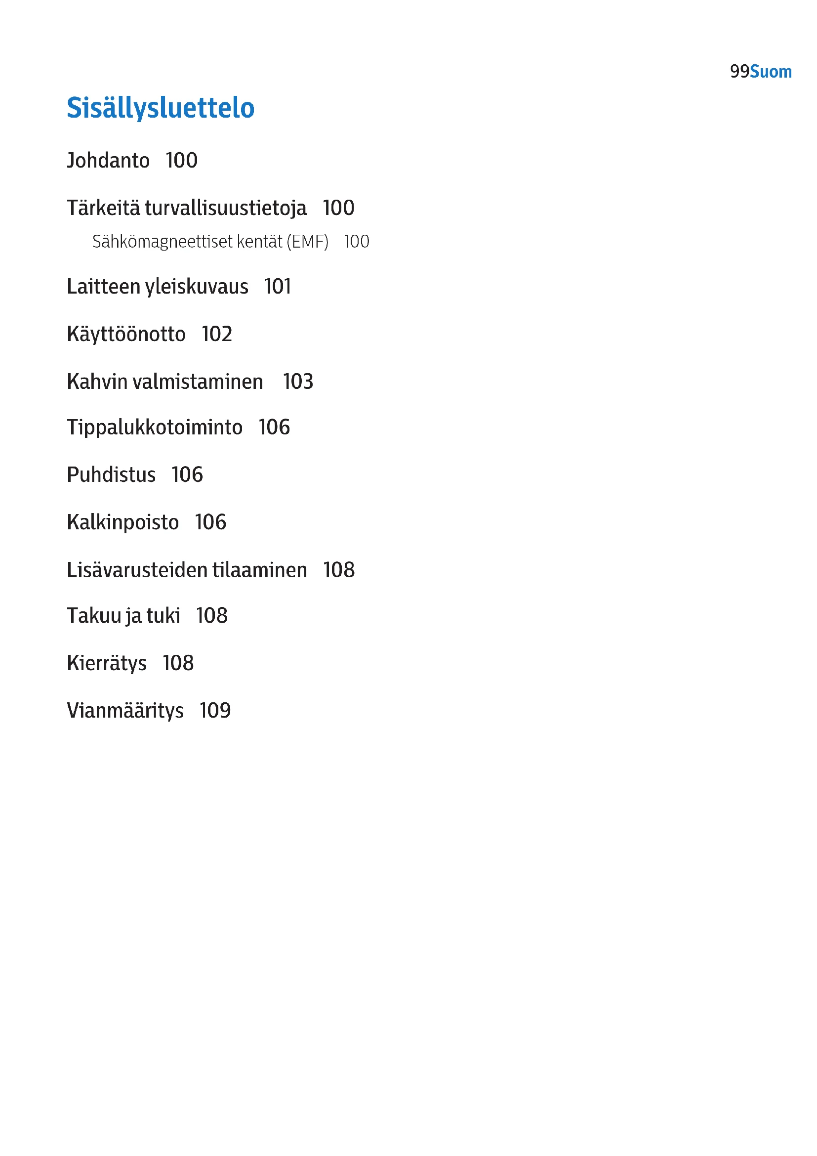 - Kui eemaldate kohvivalmistamise ajal seadmest kannu rohkem kui 20 sekundiks, hakkab ltrihoidik üle ajama. 98 EestiSisällysluettelo Johdanto 100 Tärkeitä turvallisuustietoja 100 Sähkömagneettiset kentät (EMF) 100 Laitteen yleiskuvaus 101 Käyttöönotto 102 Kahvin valmistaminen 103 Tippalukkotoiminto 106 Puhdistus 106 Kalkinpoisto 106 Lisävarusteiden tilaaminen 108 Takuu ja tuki 108 Kierrätys 108 Vianmääritys 109 99SuomiJohdanto Onnittelut ostoksestasi – ja tervetuloa Philips-käyttäjien joukkoon! Hyödynnä Philipsin tuki ja rekisteröi tuotteesi osoitteessa www.philips.com/welcome. Tärkeitä turvallisuustietoja Lue nämä tärkeät tiedot huolellisesti ennen laitteen ensimmäistä käyttökertaa ja säilytä ne vastaisen varalle. Vaara - Älä upota laitetta veteen tai muuhun nesteeseen. Varoitus - Tarkista, että laitteeseen merkitty käyttöjännite vastaa paikallista verkkojännitettä, ennen kuin liität laitteen pistorasiaan. - Liitä laite maadoitettuun pistorasiaan. - Älä käytä laitetta, jos pistoke, johto tai itse laite on vaurioitunut. - Jos virtajohto on vahingoittunut, vaihdata se oman turvallisuutesi vuoksi Philipsin valtuuttamassa huoltoliikkeessä tai muulla ammattitaitoisella korjaajalla. - Laitetta voivat käyttää myös yli 8-vuotiaat lapset ja henkilöt, joiden fyysinen tai henkinen toimintakyky on rajoittunut tai joilla ei ole kokemusta tai tietoa laitteen käytöstä, jos heitä on neuvottu laitteen turvallisesta käytöstä tai tarjolla on turvallisen käytön edellyttämä valvonta ja jos he ymmärtävät laitteeseen liittyvät vaarat. Yli 8-vuotiaat lapset voivat puhdistaa tai huoltaa laitetta valvonnan alaisena. Pidä laite ja sen johto alle 8-vuotiaiden lasten ulottumattomissa. - Lasten ei pidä leikkiä laitteella. - Älä jätä virtajohtoa roikkumaan sen pöydän tai työtason reunan yli, jonka päällä laite on. - Käytä tätä laitetta aina vain sille määritettyyn tarkoitukseen, jotta vältetään mahdolliset vaarat ja loukkaantumiset. Vaara - Huuhtele laite puhtaalla vedellä ennen käyttöönottoa. - Älä aseta laitetta kuumalle alustalle ja pidä huoli, ettei virtajohto kosketa mitään kuumaa pintaa. - Älä sijoita laitetta kaappiin, kun sitä ei käytetä. - Irrota pistoke pistorasiasta ennen laitteen puhdistamista tai jos suodattamisen aikana on ilmennyt ongelmia. - Suodatinteline, laitteen alaosa, lämpölevy ja täynnä kahvia oleva kannu kuumenevat kahvin valmistuksen aikana ja pysyvät kuumina siihen asti, kun laitteen virta katkaistaan. - Älä lämmitä kahvia kannussa uudelleen liedellä tai mikroaaltouunissa. - Laite on tarkoitettu käytettäväksi kotitalouksissa ja esimerkiksi henkilökuntaruokaloissa, toimistoissa ja muissa työ- ja asuinympäristöissä, kuten maatilamajoituksessa, aamiaismajoituksessa, hotelleissa ja motelleissa. - Toimita laite vianmääritystä ja korjaamista varten Philipsin valtuuttamaan huoltoliikkeeseen. Älä avaa laitetta tai yritä korjata sitä itse. Sähkömagneettiset kentät (EMF) Tämä Philips-laite vastaa kaikkia sähkömagneettisia kenttiä (EMF) koskevia standardeja ja säännöksiä. 100 SuomiLaitteen yleiskuvaus 1 Suodatin 2 Suodattimen runko 3 Kannun kansi 4 Lasikannu 5 Lämpölevy 6 Virtakytkin 7 Vesisäiliö 8 Suodattimen kansi 9 Vesisäiliön kansi