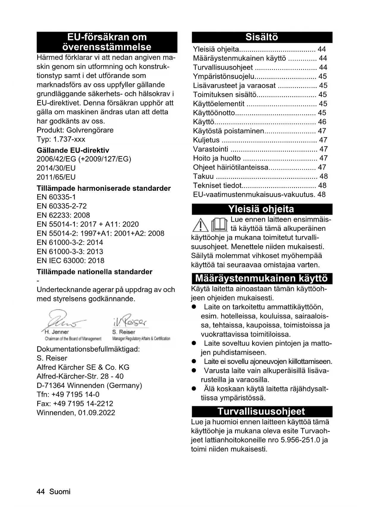 - Undertecknande agerar på uppdrag av och med styrelsens godkännande. Dokumentationsbefullmäktigad: S. Reiser Alfred Kärcher SE & Co. KG Alfred-Kärcher-Str. 28 - 40 D-71364 Winnenden (Germany) Tfn: +49 7195 14-0 Fax: +49 7195 14-2212 Winnenden, 01.09.2022 Sisältö Yleisiä ohjeita Lue ennen laitteen ensimmäis- tä käyttöä tämä alkuperäinen käyttöohje ja mukana toimitetut turvalli- suusohjeet. Menettele niiden mukaisesti. Säilytä molemmat vihkoset myöhempää käyttöä tai seuraavaa omistajaa varten. Määräystenmukainen käyttö Käytä laitetta ainoastaan tämän käyttöoh- jeen ohjeiden mukaisesti. Laite on tarkoitettu ammattikäyttöön, esim. hotelleissa, kouluissa, sairaalois- sa, tehtaissa, kaupoissa, toimistoissa ja vuokrattavissa toimitiloissa. Laite soveltuu kovien pintojen ja matto- jen puhdistamiseen. Laite ei sovellu ajoneuvojen kiillottamiseen. Varusta laite vain alkuperäisillä lisäva- rusteilla ja varaosilla. Älä koskaan käytä laitetta räjähdysalt- tiissa ympäristössä. Turvallisuusohjeet Lue ja huomioi ennen laitteen käyttöä tämä käyttöohje ja mukana oleva esite Turvaoh- jeet lattianhoitokoneille nro 5.956-251.0 ja toimi niiden mukaisesti. Yleisiä ohjeita p. 44