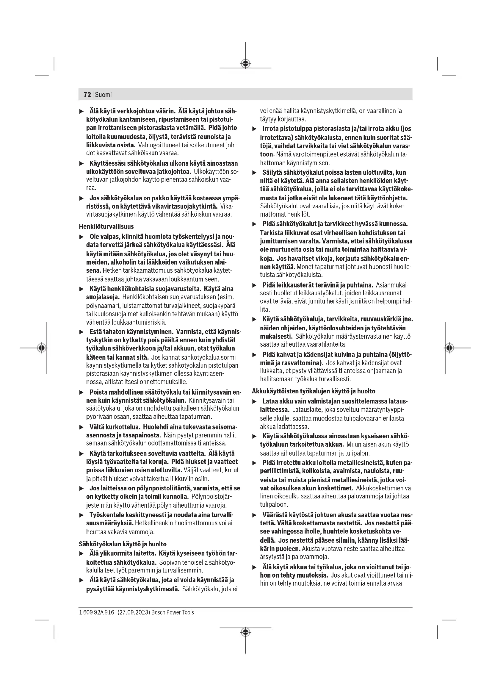 Sett innstillingsringen for dreiemoment(3) på ønsket dreiemoment. For maksimalt dreiemoment setter du innstillingsringen for driftsmodus(4) på symbolet "Boring/skruing MAKS.". Skruing og boring For å skru inn store skruer og for å bore setter du innstillingsringen for driftsmodus (4) på symbolet "Boring/skruing MAKS.". Slagboring For slagboring i murverk setter du innstillingsringen for driftsmodus(4) på symbolet "Slagboring". Helautomatisk spindellås (Auto-Lock) Når på-/av-bryteren (10) ikke trykkes inn, låses borespindelen og dermed også verktøyholderen (1). Det er da mulig å skru inn skruer også når batteriet (7) er utladet eller bruke elektroverktøyet som skrutrekker. Temperaturavhengig overbelastningsvern Ved forskriftsmessig bruk kan ikke elektroverktøyet overbelastes. Ved for stor belastning eller overskridelse av tillatt batteritemperatur slår elektronikken elektroverktøyet av helt til det igjen har optimal driftstemperatur. Informasjon om bruk u Sett elektroverktøyet bare mot mutteren/skruen når det er slått av. Innsatsverktøy som dreier seg kan skli. Etter langvarig arbeid med lavt turtall bør du avkjøle elektroverktøyet ved å la det gå på tomgang med maksimalt turtall i ca. 3 minutter. 1 609 92A 916 | (27.09.2023) Bosch Power ToolsSuomi | 71 Service og vedlikehold Vedlikehold og rengjøring u Ta alltid batteriet ut av elektroverktøyet før arbeider på elektroverktøyet utføres (f.eks. vedlikehold, verktøyskifte osv.) og før transport og oppbevaring. Det er fare for skader hvis du trykker på av/på-bryteren ved en feiltagelse. u Hold selve elektroverktøyet og ventilasjonsslissene alltid rene, for å kunne arbeide bra og sikkert. Kundeservice og kundeveiledning Kundeservice hjelper deg ved spørsmål om reparasjon og vedlikehold av produktet ditt og reservedelene. Du finner også sprengskisser og informasjon om reservedeler på www.bosch-pt.com Boschs kundeveilederteam hjelper deg gjerne hvis du har spørsmål om våre produkter og tilbehør. Ved alle forespørsler og reservedelsbestillinger må du oppgi det 10‑sifrede produktnummeret som er angitt på produktets typeskilt. Norsk Robert Bosch AS Postboks 350 1402 Ski Tel.: 64 87 89 50 Faks: 64 87 89 55 Du finner adresser til andre verksteder på: www.bosch-pt.com/serviceaddresses Transport De anbefalte li-ion-batteriene underligger kravene for farlig gods. Batteriene kan transporteres på veier av brukeren uten ytterligere krav. Ved forsendelse gjennom tredje personer (f.eks.: lufttransport eller spedisjon) må det oppfylles spesielle krav til emballasje og merking. Du må konsultere en ekspert for farlig gods ved forberedelse av forsendelsen. Send batterier kun hvis huset ikke er skadet. Lim igjen de åpne kontaktene og pakk batteriet slik at det ikke beveger seg i emballasjen. Ta også hensyn til videreførende nasjonale forskrifter. Deponering Elektroverktøy, batterier, tilbehør og emballasje må leveres inn til miljøvennlig gjenvinning. Elektroverktøy og batterier må ikke kastes i vanlig søppel! Bare for land i EU: Ifølge det europeiske direktivet 2012/19/EU om brukt elektrisk og elektronisk utstyr og gjennomføringen av dette i nasjonalt lovverk må elektroverktøy som ikke lenger kan brukes, og ifølge det europeiske direktivet 2006/66/EC må defekte eller brukte oppladbare batterier / engangsbatterier, sorteres og gjenvinnes på en miljøvennlig måte. Ikke-forskriftsmessig håndtering av elektrisk og elektronisk avfall kan føre til miljø- og helseskader på grunn av eventuelle farlige stoffer. (Oppladbare) batterier: Li-ion: Se informasjonen i avsnittet Transport (se „Transport“, Side71). Suomi Turvallisuusohjeet Yleiset sähkötyökalujen turvaohjeet VAROITUS Lue kaikki tämän sähkötyökalun mukana toimitetut varoitukset, oh- jeet, kuvat ja tekniset tiedot. Alla mainittujen ohjeiden noudattamisen laiminlyönti saattaa aiheuttaa sähköiskun, tu- lipalon ja/tai vakavan loukkaantumisen. Säilytä kaikki turvallisuusohjeet ja muut ohjeet tulevai- suutta varten. Turvallisuusohjeissa käytetty käsite "sähkötyökalu" käsittää verkkokäyttöisiä sähkötyökaluja (verkkojohdolla) ja akku- käyttöisiä sähkötyökaluja (ilman verkkojohtoa). Työpaikan turvallisuus u Pidä työskentelyalue puhtaana ja hyvin valaistuna. Työpaikan epäjärjestys tai valaisemattomat työalueet voi- vat johtaa tapaturmiin. u Älä työskentele sähkötyökalulla räjähdysalttiissa ym- päristössä, jossa on palavaa nestettä, kaasua tai pö- lyä. Sähkötyökalu muodostaa kipinöitä, jotka saattavat sytyttää pölyn tai höyryn. u Pidä lapset ja sivulliset loitolla sähkötyökalua käyt- täessäsi. Voit menettää laitteen hallinnan, jos suuntaat huomiosi muualle. Sähköturvallisuus u Sähkötyökalun pistotulpan tulee sopia pistorasiaan. Pistotulppaa ei saa muuttaa millään tavalla. Älä käytä minkäänlaisia pistorasia-adaptereita maadoitettujen sähkötyökalujen kanssa. Alkuperäisessä kunnossa ole- vat pistotulpat ja sopivat pistorasiat vähentävät sähköis- kun vaaraa. u Vältä maadoitettujen pintojen, kuten putkien, patte- reiden, liesien tai jääkaappien koskettamista. Säh- köiskun vaara kasvaa, jos kehosi on maadoitettu. u Älä altista sähkötyökalua sateelle tai kosteudelle. Ve- den pääsy sähkötyökalun sisään kasvattaa sähköiskun ris- kiä. Bosch Power Tools 1 609 92A 916 | (27.09.2023)72 | Suomi u Älä käytä verkkojohtoa väärin. Älä käytä johtoa säh- kötyökalun kantamiseen, ripustamiseen tai pistotul- pan irrottamiseen pistorasiasta vetämällä. Pidä johto loitolla kuumuudesta, öljystä, terävistä reunoista ja liikkuvista osista. Vahingoittuneet tai sotkeutuneet joh- dot kasvattavat sähköiskun vaaraa. u Käyttäessäsi sähkötyökalua ulkona käytä ainoastaan ulkokäyttöön soveltuvaa jatkojohtoa. Ulkokäyttöön so- veltuvan jatkojohdon käyttö pienentää sähköiskun vaa- raa. u Jos sähkötyökalua on pakko käyttä