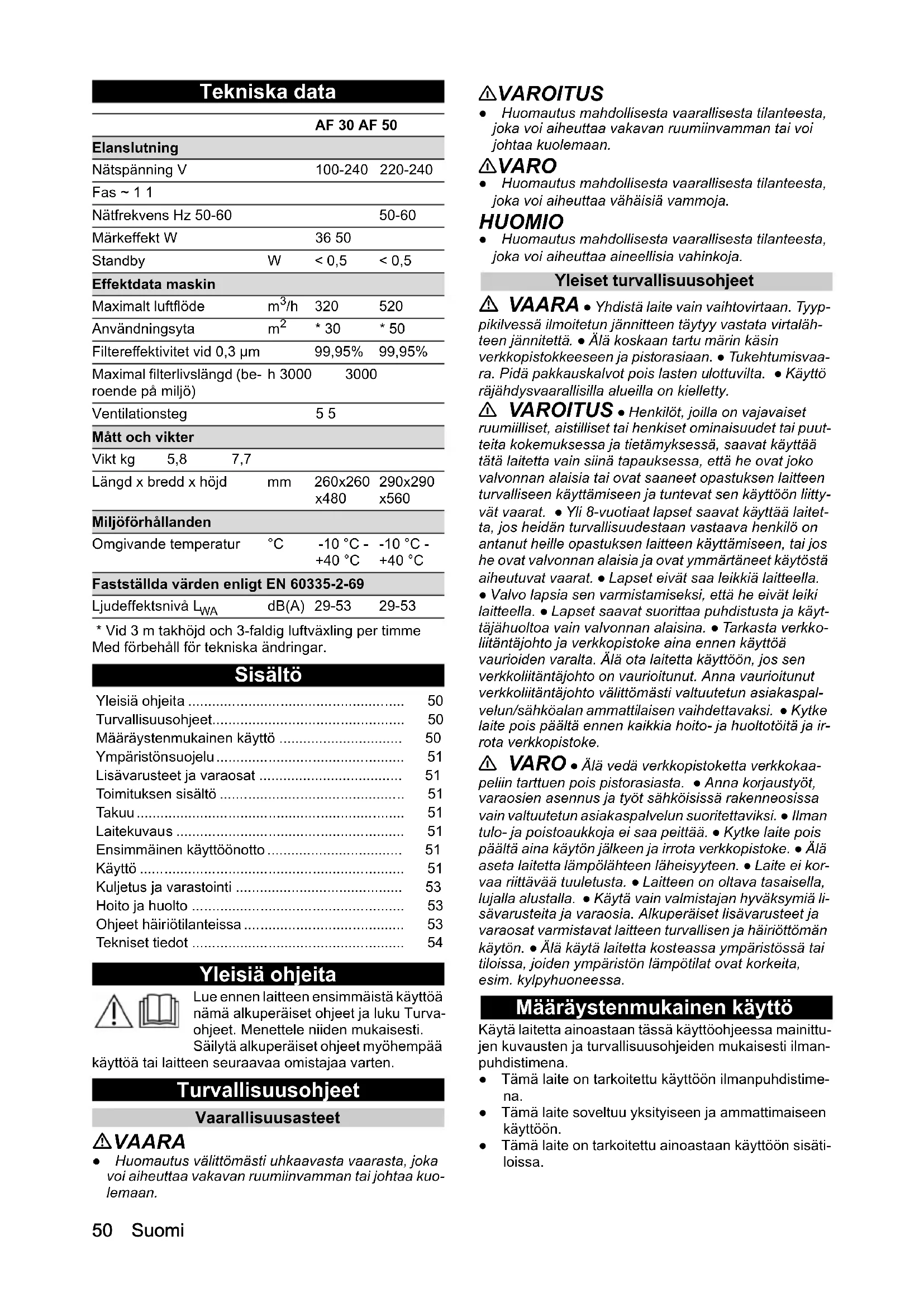 • Vid 3 m takhöjd och 3-faldig luftväxling per timme Med förbehåll för tekniska ändringar. Sisältö Yleisiä ohjeita Lue ennen laitteen ensimmäistä käyttöä nämä alkuperäiset ohjeet ja luku Turva- ohjeet. Menettele niiden mukaisesti. Säilytä alkuperäiset ohjeet myöhempää käyttöä tai laitteen seuraavaa omistajaa varten. Turvallisuusohjeet Vaarallisuusasteet VAARA ● Huomautus välittömästi uhkaavasta vaarasta, joka voi aiheuttaa vakavan ruumiinvamman tai johtaa kuo- lemaan. 몇 VAROITUS ● Huomautus mahdollisesta vaarallisesta tilanteesta, joka voi aiheuttaa vakavan ruumiinvamman tai voi johtaa kuolemaan. 몇 VARO ● Huomautus mahdollisesta vaarallisesta tilanteesta, joka voi aiheuttaa vähäisiä vammoja. HUOMIO ● Huomautus mahdollisesta vaarallisesta tilanteesta, joka voi aiheuttaa aineellisia vahinkoja. Yleiset turvallisuusohjeet VAARA ● Yhdistä laite vain vaihtovirtaan. Tyyp- pikilvessä ilmoitetun jännitteen täytyy vastata virtaläh- teen jännitettä. ● Älä koskaan tartu märin käsin verkkopistokkeeseen ja pistorasiaan. ● Tukehtumisvaa- ra. Pidä pakkauskalvot pois lasten ulottuvilta. ● Käyttö räjähdysvaarallisilla alueilla on kielletty. 몇 VAROITUS ● Henkilöt, joilla on vajavaiset ruumiilliset, aistilliset tai henkiset ominaisuudet tai puut- teita kokemuksessa ja tietämyksessä, saavat käyttää tätä laitetta vain siinä tapauksessa, että he ovat joko valvonnan alaisia tai ovat saaneet opastuksen laitteen turvalliseen käyttämiseen ja tuntevat sen käyttöön liitty- vät vaarat. ● Yli 8-vuotiaat lapset saavat käyttää laitet- ta, jos heidän turvallisuudestaan vastaava henkilö on antanut heille opastuksen laitteen käyttämiseen, tai jos he ovat valvonnan alaisia ja ovat ymmärtäneet käytöstä aiheutuvat vaarat. ● Lapset eivät saa leikkiä laitteella. ● Valvo lapsia sen varmistamiseksi, että he eivät leiki laitteella. ● Lapset saavat suorittaa puhdistusta ja käyt- täjähuoltoa vain valvonnan alaisina. ● Tarkasta verkko- liitäntäjohto ja verkkopistoke aina ennen käyttöä vaurioiden varalta. Älä ota laitetta käyttöön, jos sen verkkoliitäntäjohto on vaurioitunut. Anna vaurioitunut verkkoliitäntäjohto välittömästi valtuutetun asiakaspal- velun/sähköalan ammattilaisen vaihdettavaksi. ● Kytke laite pois päältä ennen kaikkia hoito- ja huoltotöitä ja ir- rota verkkopistoke. 몇 VARO ● Älä vedä verkkopistoketta verkkokaa- peliin tarttuen pois pistorasiasta. ● Anna korjaustyöt, varaosien asennus ja työt sähköisissä rakenneosissa vain valtuutetun asiakaspalvelun suoritettaviksi. ● Ilman tulo- ja poistoaukkoja ei saa peittää. ● Kytke laite pois päältä aina käytön jälkeen ja irrota verkkopistoke. ● Älä aseta laitetta lämpölähteen läheisyyteen. ● Laite ei kor- vaa riittävää tuuletusta. ● Laitteen on oltava tasaisella, lujalla alustalla. ● Käytä vain valmistajan hyväksymiä li- sävarusteita ja varaosia. Alkuperäiset lisävarusteet ja varaosat varmistavat laitteen turvallisen ja häiriöttömän käytön. ● Älä käytä laitetta kosteassa ympäristössä tai tiloissa, joiden ympäristön lämpötilat ovat korkeita, esim. kylpyhuoneessa. Määräystenmukainen käyttö Käytä laitetta ainoastaan tässä käyttöohjeessa mainittu- jen kuvausten ja turvallisuusohjeiden mukaisesti ilman- puhdistimena. ● Tämä laite on tarkoitettu käyttöön ilmanpuhdistime- na. ● Tämä laite soveltuu yksityiseen ja ammattimaiseen käyttöön. ● Tämä laite on tarkoitettu ainoastaan käyttöön sisäti- loissa. AF 30 AF 50 Elanslutning Nätspänning V 100-240 220-240 Fas ~ 1 1 Nätfrekvens Hz 50-60 50-60 Märkeffekt W