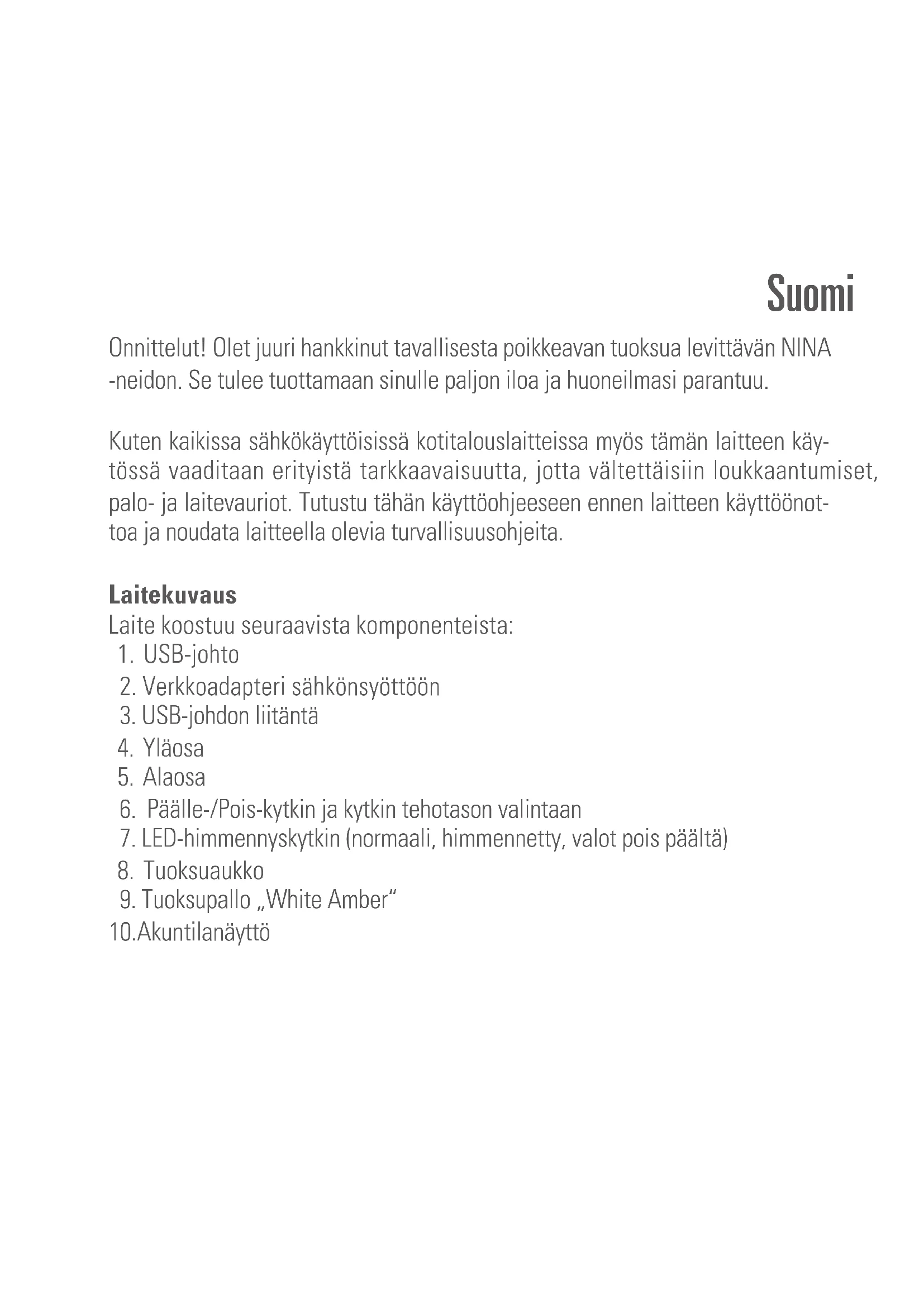 - Akku ladataan: LED palaa jatkuvasti Kun laite on ladattu täyteen, niin LED sammuu. Sitten voit vetää USB-johdon irti ja käyttää laitetta akun avulla (enintään 50 tunnin ajan) Viite: Tuoksupallovalikoimaan sisältyy 6 eri tuoksuvaihtoehtoa: White Amber, Orange Bergamot, Red Jasmine, Blue Rosewood, Black Orchid, Yellow Vanilla. Voit hankkia tuoksupallot kauppiaalta, jolta olet myös ostanut Nina -laitteesi. Puhdistus Sammuta laite ennen jokaista huoltoa ja jokaisen käytön jälkeen ja vedä verk- koadapteri pistorasiasta. Huomio: Älä milloinkaan upota laitetta veteen (oikosulkuvaara).• Säännöllisesti tarvittaessa: Puhdista laite ulkopuolelta kostealla liinalla ja kui- vaa se hyvin tämän jälkeen.