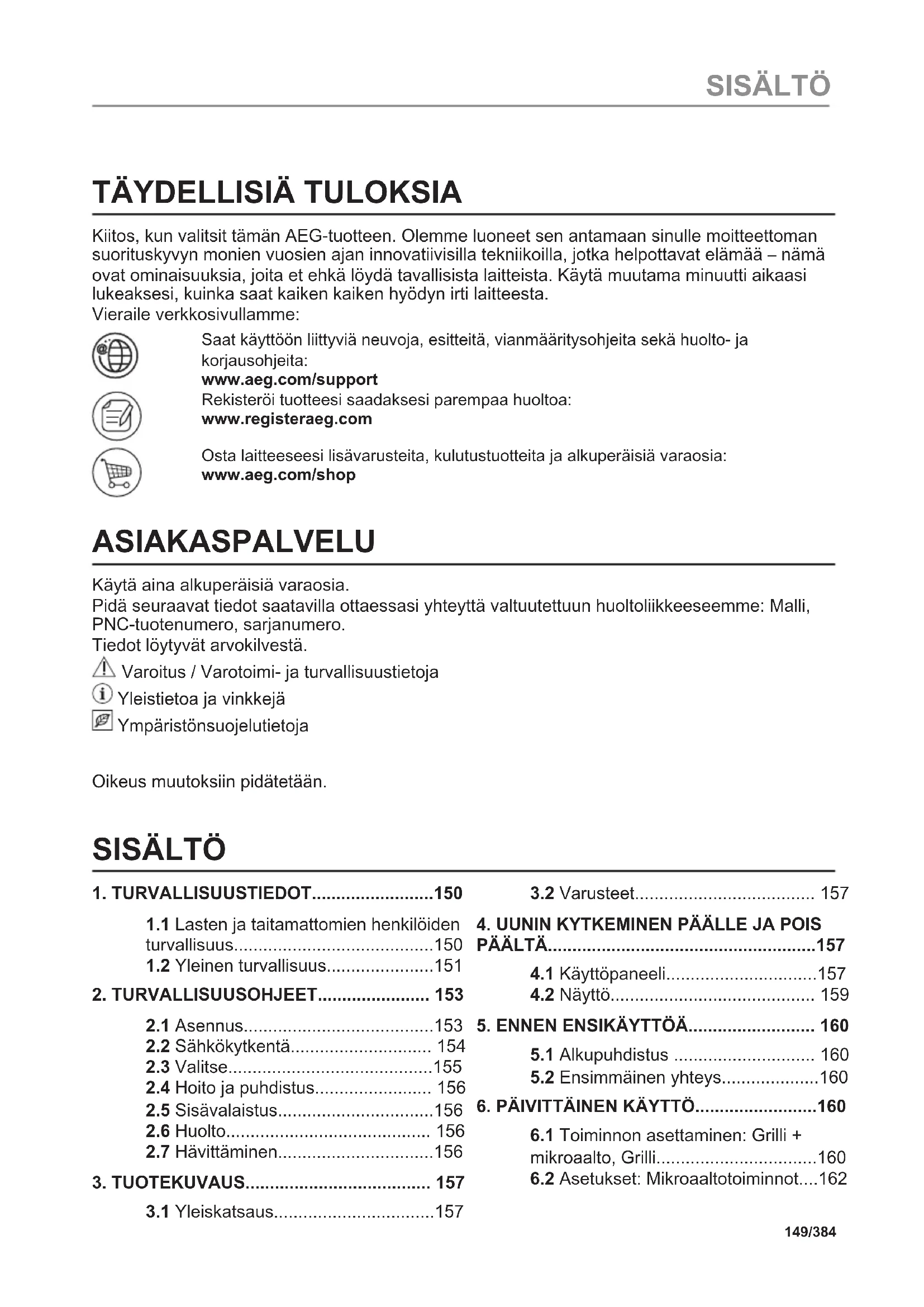 Kiitos, kun valitsit tämän AEG-tuotteen. Olemme luoneet sen antamaan sinulle moitteettoman suorituskyvyn monien vuosien ajan innovatiivisilla tekniikoilla, jotka helpottavat elämää – nämä ovat ominaisuuksia, joita et ehkä löydä tavallisista laitteista. Käytä muutama minuutti aikaasi lukeaksesi, kuinka saat kaiken kaiken hyödyn irti laitteesta. Vieraile verkkosivullamme: Saat käyttöön liittyviä neuvoja, esitteitä, vianmääritysohjeita sekä huolto- ja korjausohjeita: www.aeg.com/support Rekisteröi tuotteesi saadaksesi parempaa huoltoa: www.registeraeg.com Osta laitteeseesi lisävarusteita, kulutustuotteita ja alkuperäisiä varaosia: www.aeg.com/shop ASIAKASPALVELU Käytä aina alkuperäisiä varaosia. Pidä seuraavat tiedot saatavilla ottaessasi yhteyttä valtuutettuun huoltoliikkeeseemme: Malli, PNC-tuotenumero, sarjanumero. Tiedot löytyvät arvokilvestä. Varoitus / Varotoimi- ja turvallisuustietoja Yleistietoa ja vinkkejä Ympäristönsuojelutietoja Oikeus muutoksiin pidätetään. SISÄLTÖ