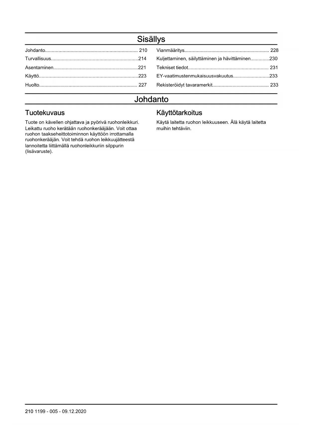 - Rekisteröidyt tavaramerkit Johdanto Tuotekuvaus Tuote on kävellen ohjattava ja pyörivä ruohonleikkuri. Leikattu ruoho kerätään ruohonkerääjään. Voit ottaa ruohon taakseheittotoiminnon käyttöön irrottamalla ruohonkerääjän. Voit tehdä ruohon leikkuujätteestä lannoitetta liittämällä ruohonleikkuriin silppurin (lisävaruste). Käyttötarkoitus Käytä laitetta ruohon leikkuuseen. Älä käytä laitetta muihin tehtäviin. 210 1199 - 005 - 09.12.2020Tuotteen kuvaus p. 233