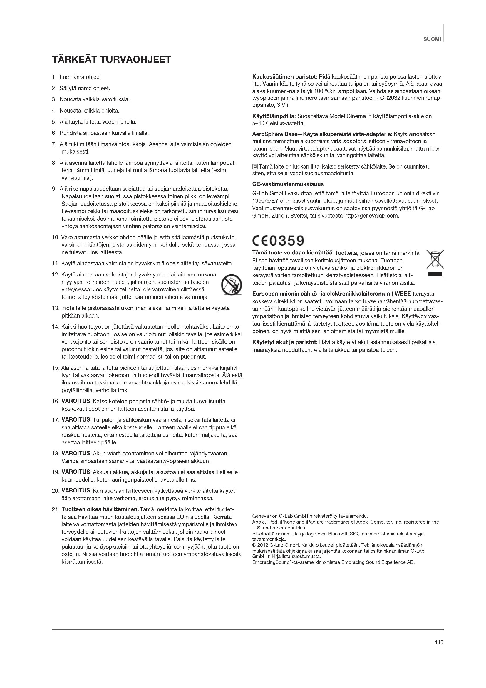 G-Lab GmbH vakuuttaa, etta täm laite tayttä Europan unionin direktivin 1999/5/EY olennaiset vaatimukset ja muut sihen sovellettavat saannokset. Vaatimustenu-m-kaisuusvakuutus on saatavissa pyynnosta yhtiöltä G-Lab GmbH, Zürich, Sveitsi, tai sivustosta http://genevalab.com.