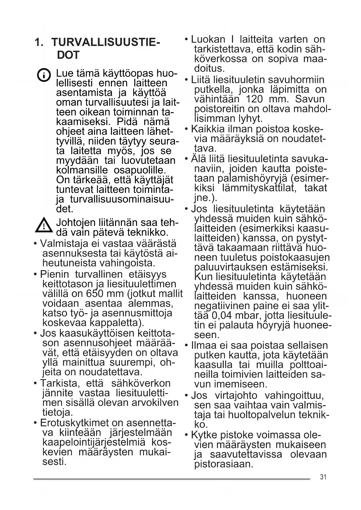 - Jos liesituuletinta käytetään yhdessä muiden kuin sähkö- laitteiden (esimerkiksi kaasu- laitteiden) kanssa, on pystyt- tävä takaamaan riittävä huo- neen tuuletus poistokaasujen paluuvirtauksen estämiseksi. Kun liesituuletinta käytetään yhdessä muiden kuin sähkö- laitteiden kanssa, huoneen negatiivinen paine ei saa ylit- tää 0,04 mbar, jotta liesituule- tin ei palauta höyryjä huonee- seen.