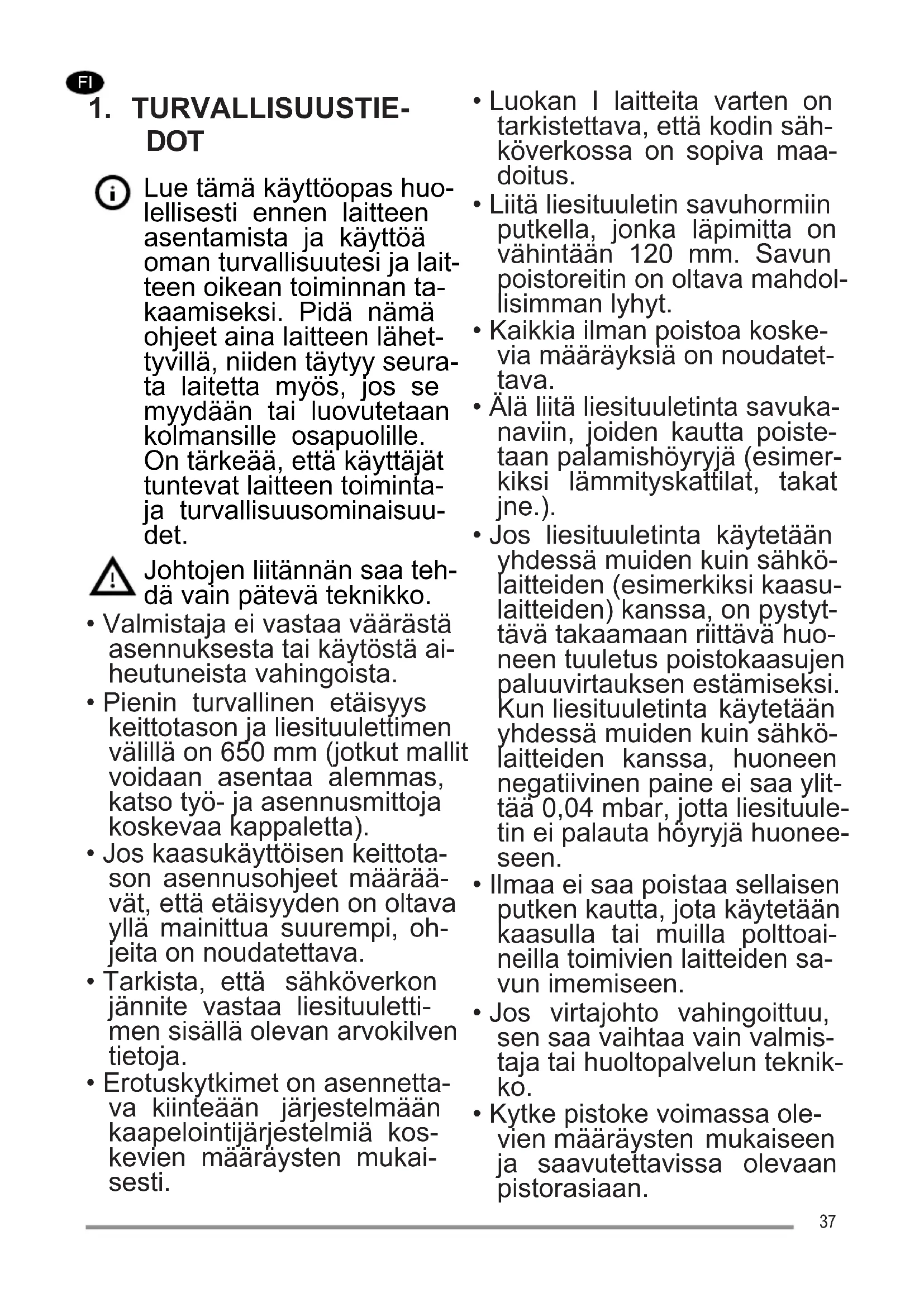 - Tilassa täytyy olla asianmu- kainen tuuletus kun liesituule- tinta käytetään samanaikai- sesti kaasulla tai muilla poltto- aineilla toimivien laitteiden kanssa (ei koske laitteita, jot- ka poistavat tilaan vain il- maa).