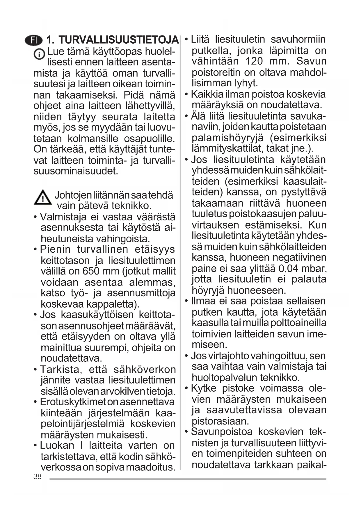 - Ilmaa ei saa poistaa sellaisen putken kautta, jota käytetään kaasulla tai muilla polttoaineilla toimivien laitteiden savun ime- miseen.