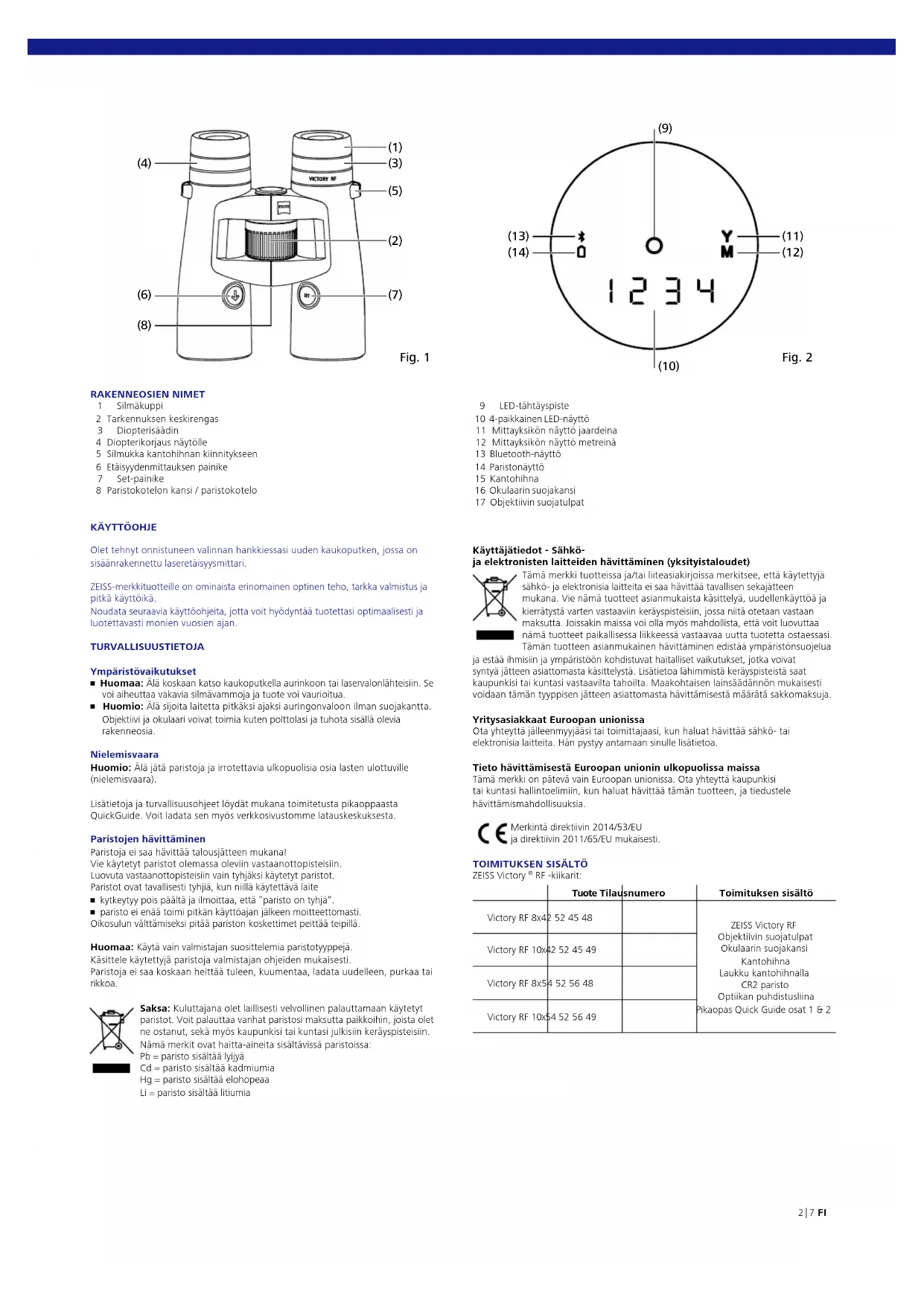 RF -kiikarit: Tuote Tilausnumero Toimituksen sisältö Victory RF 8x42 52 45 48 ZEISS Victory RF Objektiivin suojatulpat Okulaarin suojakansi Kantohihna Laukku kantohihnalla CR2 paristo Optiikan puhdistusliina Pikaopas Quick Guide osat 1 & 2 Victory RF 10x42 52 45 49 Victory RF 8x54 52 56 48 Victory RF 10x54 52 56 49 (5) (3) (1) Fig. 1 (7) (4) (6) (8) (2) Fig. 2 (12) (11) (14) (13) (9) (10) 9 LED-tähtäyspiste 10 4-paikkainen LED-näyttö 11 Mittayksikön näyttö jaardeina 12 Mittayksikön näyttö metreinä 13 Bluetooth-näyttö 14 Paristonäyttö 15 Kantohihna 16 Okulaarin suojakansi 17 Objektiivin suojatulpat