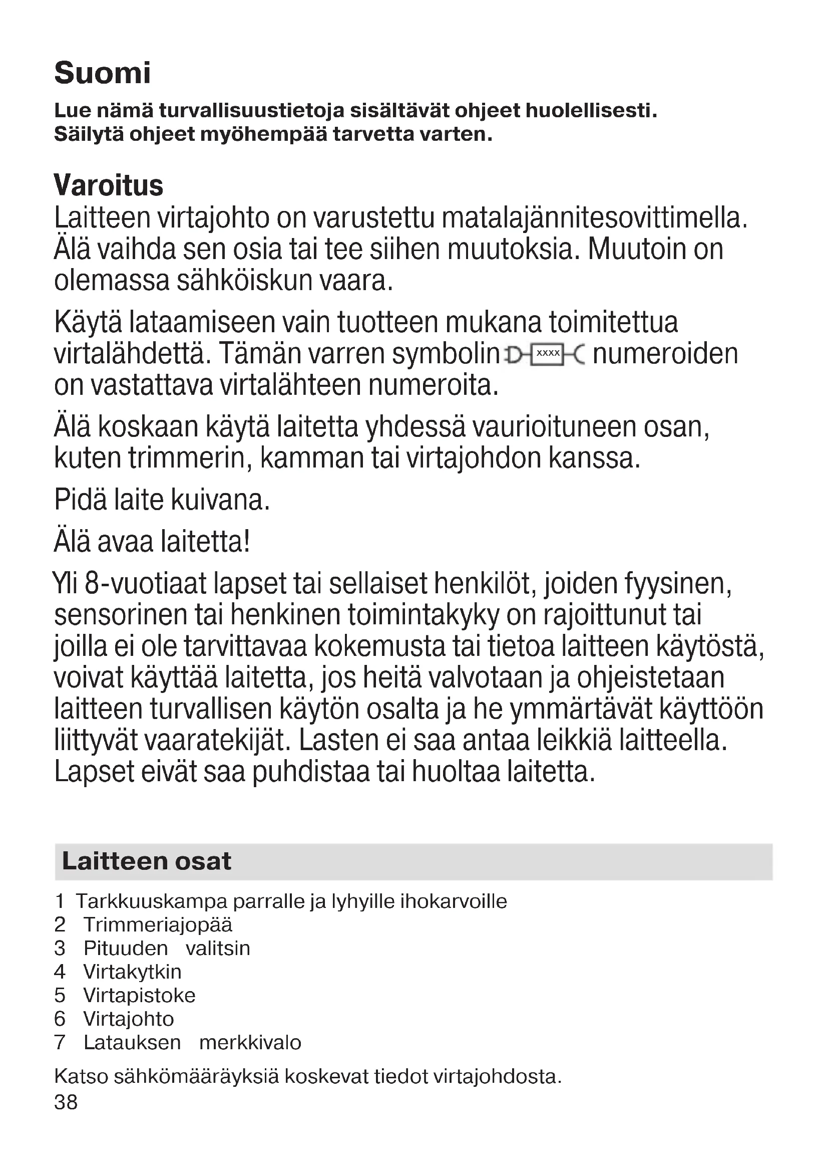 - Virtajohdon latauksen merkkivalo (7) palaa jatkuvasti, kun laitetta ladataan.