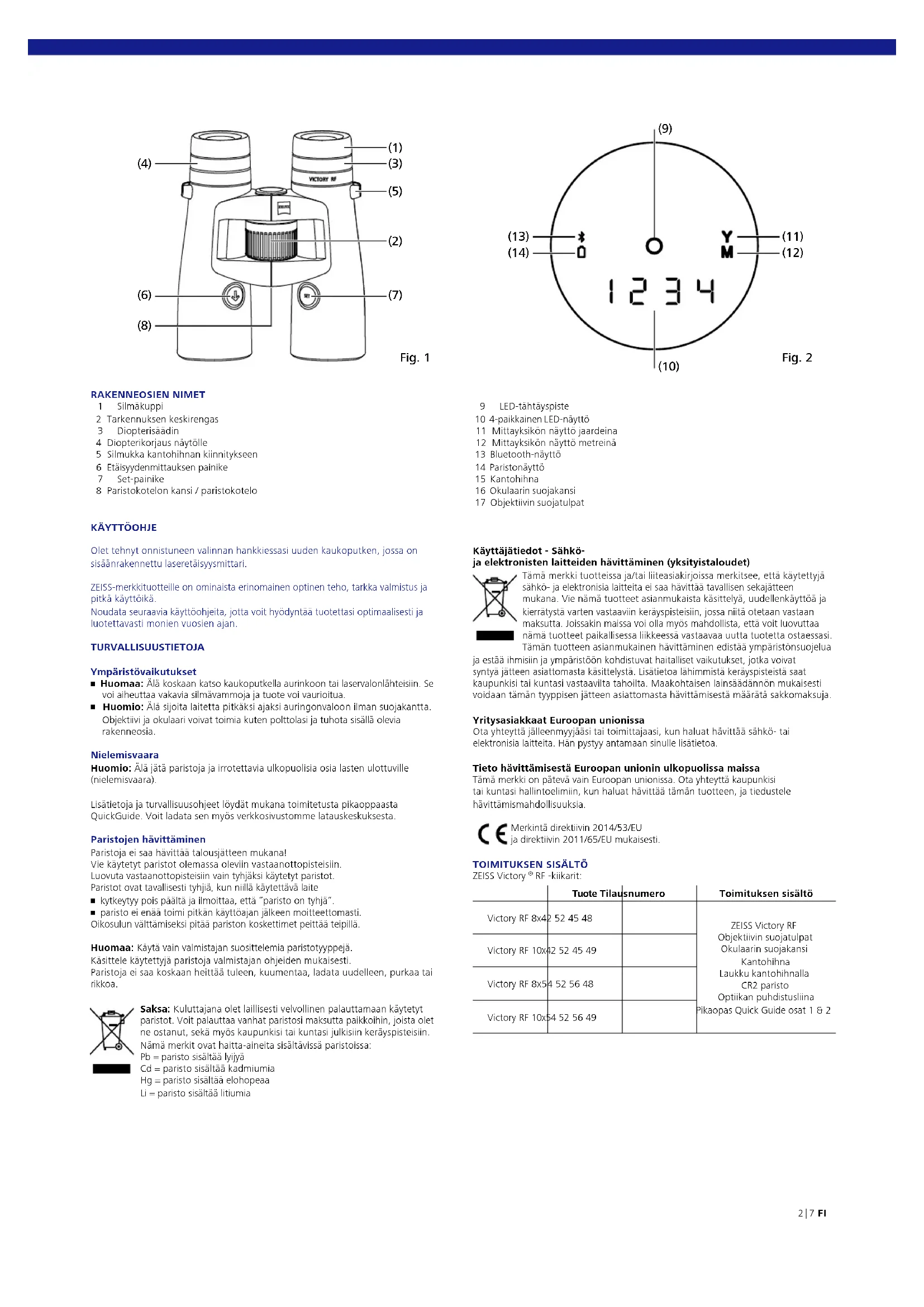 RF -kiikarit: Tuote Tilausnumero Toimituksen sisältö Victory RF 8x42 52 45 48 ZEISS Victory RF Objektiivin suojatulpat Okulaarin suojakansi Kantohihna Laukku kantohihnalla CR2 paristo Optiikan puhdistusliina Pikaopas Quick Guide osat 1 & 2 Victory RF 10x42 52 45 49 Victory RF 8x54 52 56 48 Victory RF 10x54 52 56 49 (5) (3) (1) Fig. 1 (7) (4) (6) (8) (2) Fig. 2 (12) (11) (14) (13) (9) (10) 9 LED-tähtäyspiste 10 4-paikkainen LED-näyttö 11 Mittayksikön näyttö jaardeina 12 Mittayksikön näyttö metreinä 13 Bluetooth-näyttö 14 Paristonäyttö 15 Kantohihna 16 Okulaarin suojakansi 17 Objektiivin suojatulpat