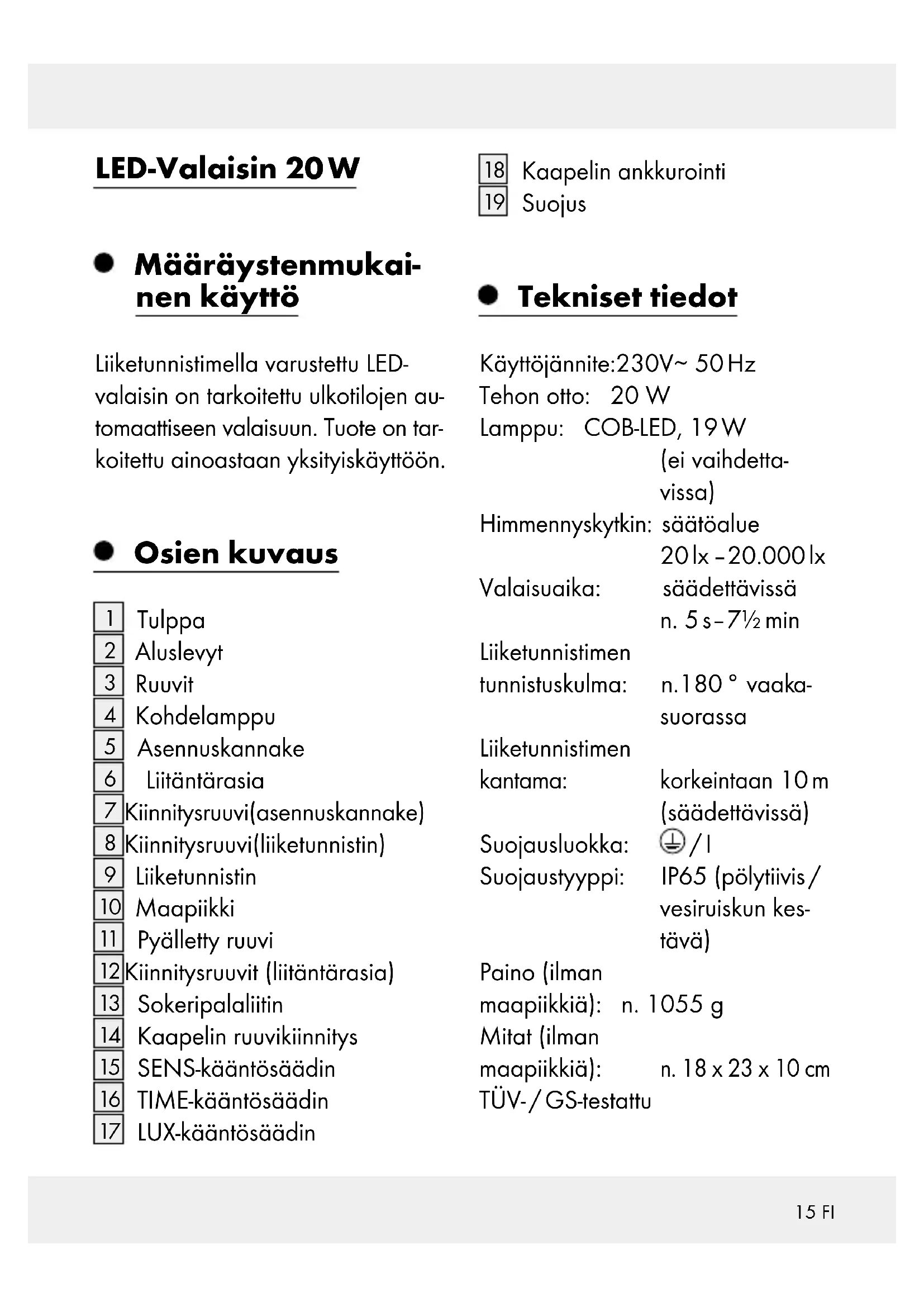 min Liiketunnistimen tunnistuskulma: n.180 ° vaaka- suorassa Liiketunnistimen kantama: korkeintaan 1 0 m (säädettävissä) Suojausluokka: / I Suojaustyyppi: IP65 (pölytiivis / vesiruiskun kes- tävä) Paino (ilman maapiikkiä): n. 1055 g Mitat (ilman maapiikkiä): n. 18 x 23 x 10 cm TÜV- / GS-testattu16 FI Toimituksen sisältö 1 LED-valaisin liiketunnistimella 2 tulppaa (Ø 8 mm) 2 aluslevyä (Ø 20 mm) 2 ruuvia (6 mm x 50 mm) 1 maapiikki 1 kaapelin ankkurointi 1 suojus 1 asennus- ja käyttöohje Yleiset turvalli- suusohjeet Tutustu ennen tuotteen käyttöä huolellisesti kaikkiin käyttö- ja tur- vallisuusohjeisiin! Anna kaikki ohjeet tuotteen mukana mahdolliselle uu- delle omistajalle! HENGEN-JA TAPATURMAN- VAARA LAPSILLE! Älä koskaan jätä lapsia yksin pakkausmateriaalin kanssa. Pakkausmateriaali voi aiheuttaa tukehtumisen. Lapset aliarvioi- vat useimmiten vaaratilanteet. Pidä tuote aina lasten ulottu- mattomissa. Laitetta voivat käyttää 8 vuotta täyttäneet lapset sekä henkilöt, jotka ovat fyysisiltä tai psyykki- siltä kyvyiltään tai aisteiltaan rajoittuneita tai joilla ei ole ko- kemusta tai tietoa laitteen käy- töstä, jos he käyttävät laitetta valvonnan alaisina tai heitä on opastettu laitteen turvallisessa käytössä ja he ovat tietoisia laitteeseen liittyvistä vaaroista. Lapset eivät saa leikkiä laitteella. Lapset eivät saa puhdistaa tai huoltaa laitetta ilman valvontaa. Hengenvaara säh- köiskun vuoksi Tarkista aina ennen sähköverk- koon liittämistä, ettei tuotteessa ole vaurioita. Älä koskaan käytä valaisinta, jos olet havainnut siinä jotain vikaa. Varmista ennen asennusta, että käytettävissä oleva verkkojän- nite on yhdenmukainen valaisi- men käyttöjännitteen kanssa (230 V∼ 50 Hz). Ellei näin ole, älä asenna valaisinta.17 FI VARO! PALOVAMMAN VAARA! Varmista, että valai- sin on sammutettu ja jäähtynyt vähintään 15 minuuttia ennen kuin kosketat sitä. Lamput voivat tulla erittäin kuumiksi käytön ai- kana. 1,0 m TULIPALON VAARA! Asenna valaisin vähintään 1,0 metrin etäisyydelle materi- aaleista, joihin säteily kohdistuu. Liiallinen lämmönkehitys voi sytyttää tulipalon.