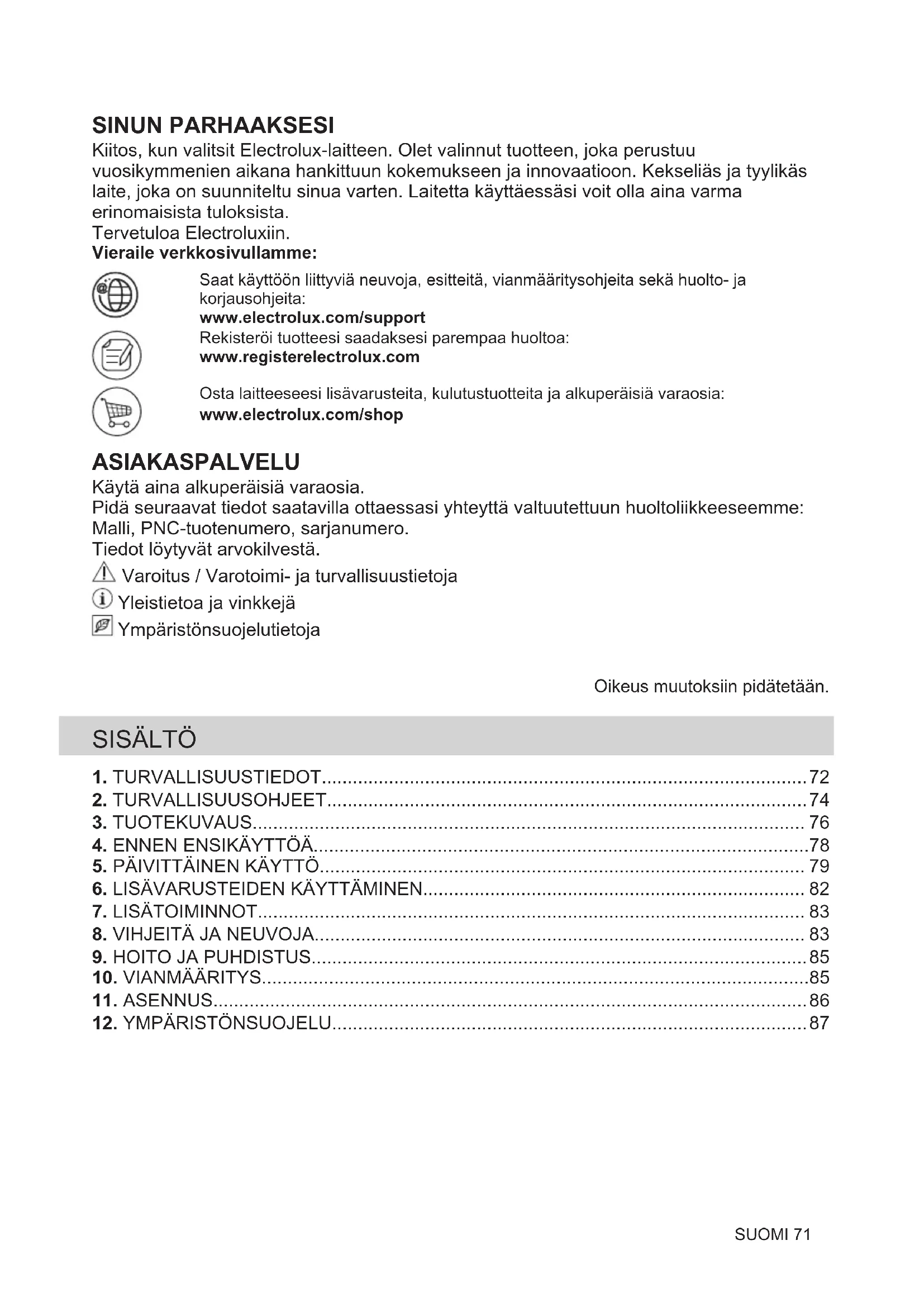 Genbrug materialer med symbolet . Anbring emballagematerialet i passende beholdere til genbrug. Hjælp med at beskytte miljøet og menneskelig sundhed samt at genbruge affald af elektriske og elektroniske apparater. Kasser ikke apparater, der er mærket med symbolet , sammen med husholdningsaffaldet. Lever produktet tilbage til din lokale genbrugsplads eller kontakt din kommune. 70 DANSKSINUN PARHAAKSESI Kiitos, kun valitsit Electrolux-laitteen. Olet valinnut tuotteen, joka perustuu vuosikymmenien aikana hankittuun kokemukseen ja innovaatioon. Kekseliäs ja tyylikäs laite, joka on suunniteltu sinua varten. Laitetta käyttäessäsi voit olla aina varma erinomaisista tuloksista. Tervetuloa Electroluxiin. Vieraile verkkosivullamme: Saat käyttöön liittyviä neuvoja, esitteitä, vianmääritysohjeita sekä huolto- ja korjausohjeita: www.electrolux.com/support Rekisteröi tuotteesi saadaksesi parempaa huoltoa: www.registerelectrolux.com Osta laitteeseesi lisävarusteita, kulutustuotteita ja alkuperäisiä varaosia: www.electrolux.com/shop ASIAKASPALVELU Käytä aina alkuperäisiä varaosia. Pidä seuraavat tiedot saatavilla ottaessasi yhteyttä valtuutettuun huoltoliikkeeseemme: Malli, PNC-tuotenumero, sarjanumero. Tiedot löytyvät arvokilvestä. Varoitus / Varotoimi- ja turvallisuustietoja Yleistietoa ja vinkkejä Ympäristönsuojelutietoja Oikeus muutoksiin pidätetään. SISÄLTÖ
