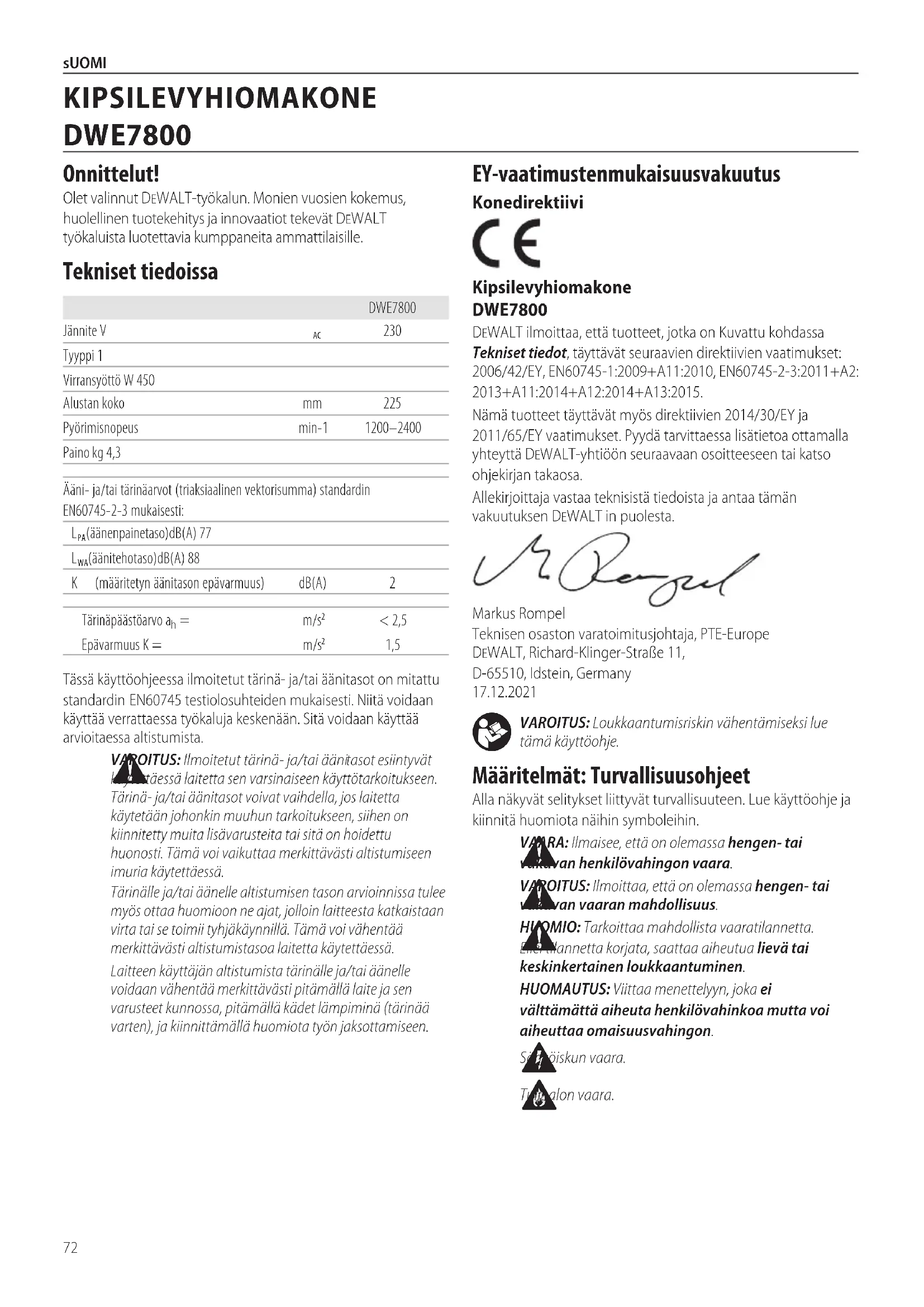 VAARA: Ilmaisee, että on olemassa hengen‑ tai vakavan henkilövahingonvaara. VAROITUS: Ilmoittaa, että on olemassa hengen‑ tai vakavan vaaranmahdollisuus. HUOMIO: Tarkoittaa mahdollista vaaratilannetta. Ellei tilannetta korjata, saattaa aiheutua lievä tai keskinkertainenloukkaantuminen.HUOMAUTUS: Viittaa menettelyyn, joka ei välttämättä aiheuta henkilövahinkoa mutta voi aiheuttaaomaisuusvahingon. Sähköiskunvaara. Tulipalonvaara. EY‑vaatimustenmukaisuusvakuutus Konedirektiivi Kipsilevyhiomakone DWE7800 DeWALT ilmoittaa, että tuotteet, jotka on Kuvattu kohdassa Tekniset tiedot, täyttävät seuraavien direktiivien vaatimukset: 2006/42/EY, EN60745‑1:2009+A11:2010, EN60745‑2‑3:2011+A2:2013+A11:2014+A12:2014+A13:2015.Nämä tuotteet täyttävät myös direktiivien 2014/30/EY ja 2011/65/EY vaatimukset. Pyydä tarvittaessa lisätietoa ottamalla yhteyttä DeWALT‑yhtiöön seuraavaan osoitteeseen tai katso ohjekirjantakaosa.Allekirjoittaja vastaa teknisistä tiedoista ja antaa tämän vakuutuksen DeWALT inpuolesta.Markus Rompel Teknisen osaston varatoimitusjohtaja, PTE‑Europe DeWALT, Richard‑Klinger‑Straße 11, D‑65510, Idstein, Germany 17.12.2021Tässä käyttöohjeessa ilmoitetut tärinä‑ ja/tai äänitasot on mitattu standardin 60745 testiolosuhteiden mukaisesti. Niitä voidaan käyttää verrattaessa työkaluja keskenään. Sitä voidaan käyttää arvioitaessaaltistumista. VAROITUS: Ilmoitetut tärinä- ja/tai äänitasot esiintyvät käytettäessä laitetta sen varsinaiseen käyttötarkoitukseen. Tärinä- ja/tai äänitasot voivat vaihdella, jos laitetta käytetään johonkin muuhun tarkoitukseen, siihen on kiinnitetty muita lisävarusteita tai sitä on hoidettu huonosti. Tämä voi vaikuttaa merkittävästi altistumiseen imuriakäytettäessä.Tärinälle ja/tai äänelle altistumisen tason arvioinnissa tulee myös ottaa huomioon ne ajat, jolloin laitteesta katkaistaan virta tai se toimii tyhjäkäynnillä. Tämä voi vähentää merkittävästi altistumistasoa laitettakäytettäessä.Laitteen käyttäjän altistumista tärinälle ja/tai äänelle voidaan vähentää merkittävästi pitämällä laite ja sen varusteet kunnossa, pitämällä kädet lämpiminä (tärinää varten), ja kiinnittämällä huomiotatyönjaksottamiseen.DWE7800Jännite V