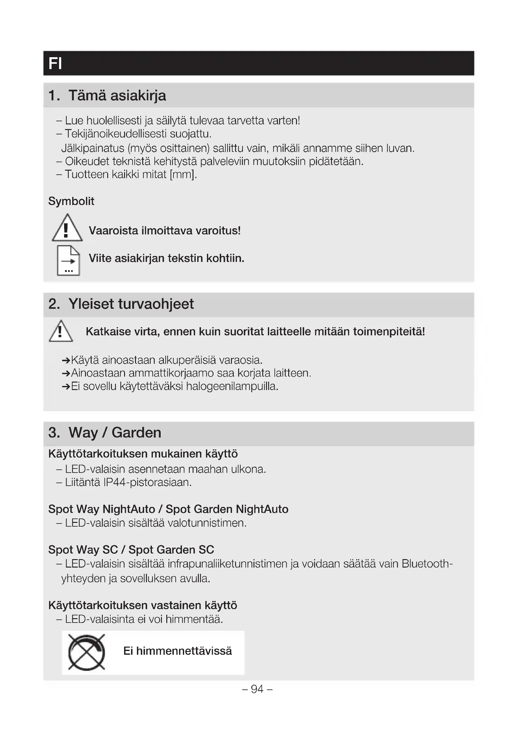 Käyttötarkoituksen mukainen käyttö – LED-valaisin asennetaan maahan ulkona. – Liitäntä IP44-pistorasiaan. Spot Way NightAuto/Spot Garden NightAuto – LED-valaisin sisältää valotunnistimen. Spot Way SC/Spot Garden SC – LED-valaisin sisältää infrapunaliiketunnistimen ja voidaan säätää vain Bluetooth- yhteyden ja sovelluksen avulla. Käyttötarkoituksen vastainen käyttö – LED-valaisinta ei voi himmentää. Ei himmennettävissä– 95 – Toimituslaajuus Spot Way (Kuva 3.1) – Valaisin sekä pylväs, pohjalevy ja pistotulpalla varustettu liitäntäkaapeli – Kolme ruuvia – Kolme tulppaa Toimituslaajuus, Spot Garden (Kuva 3.2) – Valaisin ja pistotulpalla varustettu liitäntäkaapeli – Maapiikki – Kaksi ruuvia Tuotteen mitat, Spot Way (Kuva 3.3) Tuotteen mitat, Spot Garden (Kuva 3.4) Tuotteen yleiskuva (Kuva 3.5 – 3.10) A Valaisinrunko B Liiketunnistin (vain Spot Way / Spot Garden SC) C Valotunnistin (vain Spot Way/Garden NightAuto) D Hämäryystason asetus (vain Spot Way/Garden NightAuto) E Pylväs ja pohjalevy (vain Spot Way) F Maapiikki (vain Spot Garden) G Verkkokaapeli ja pistoke Toiminta-alue Spot Way / Spot Garden SC (Kuva 3.11–3.16) Valovoimakkuuden jakautuminen (Kuva 3.17)