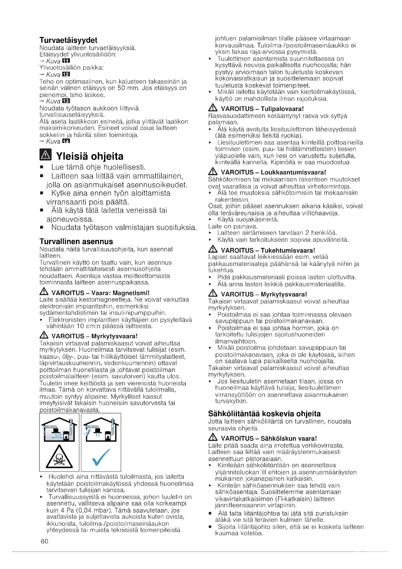 Yleisiä ohjeita ¡ Lue tämä ohje huolellisesti. ¡ Laitteen saa liittää vain ammattilainen, jolla on asianmukaiset asennusoikeudet. ¡ Kytke aina ennen työn aloittamista virransaanti pois päältä. ¡ Älä käytä tätä laitetta veneissä tai ajoneuvoissa. ¡ Noudata työtason valmistajan suosituksia. Turvallinen asennus Noudata näitä turvallisuusohjeita, kun asennat laitteen. Turvallinen käyttö on taattu vain, kun asennus tehdään ammattitaitoisesti asennusohjeita noudattaen. Asentaja vastaa moitteettomasta toiminnasta laitteen asennuspaikassa. VAROITUS‒Vaara: Magnetismi! Laite sisältää kestomagneetteja. Ne voivat vaikuttaa elektronisiin implantteihin, esimerkiksi sydämentahdistimiin tai insuliinipumppuihin. ▶ Elektronisten implanttien käyttäjien on pysyteltävä vähintään 10cm:n päässä laitteesta. VAROITUS‒Myrkytysvaara! Takaisin virtaavat palamiskaasut voivat aiheuttaa myrkytyksen. Huoneilmaa tarvitsevat tulisijat (esim. kaasu-, öljy-, puu- tai hiilikäyttöiset lämmityslaitteet, läpivirtauskuumennin, vedenkuumennin) ottavat polttoilman huonetilasta ja johtavat poistoilman poistoilmalaitteen (esim. savutorven) kautta ulos. Tuuletin imee keittiöstä ja sen viereisistä huoneista ilmaa. Tämä on korvattava riittävällä tuloilmalla, muutoin syntyy alipaine. Myrkylliset kaasut imeytyisivät takaisin huoneisiin savutorvesta tai poistoilmakanavasta. ▶ Huolehdi aina riittävästä tuloilmasta, jos laitetta käytetään poistoilmakäytössä yhdessä huoneilmaa tarvitsevan tulisijan kanssa. ▶ Turvallisuussyistä ei huoneessa, johon tuuletin on asennettu, vallitseva alipaine saa olla korkeampi kuin 4Pa(0,04mbar). Tämä saavutetaan, jos avattavista ja suljettavista aukoista kuten ovista, ikkunoista, tuloilma-/poistoilmaseinäaukon yhteydessä tai muista teknisistä toimenpiteistä johtuen palamisilman tilalle pääsee virtaamaan korvausilmaa. Tuloilma-/poistoilmaseinäaukko ei yksin takaa raja-arvossa pysymistä. ▶ Tuulettimen asentamista suunniteltaessa on kysyttävä neuvoa paikalliselta nuohoojalta; hän pystyy arvioimaan talon tuuletusta koskevan kokonaisratkaisun ja suosittelemaan sopivat tuuletusta koskevat toimenpiteet. ▶ Mikäli laitetta käytetään vain kiertoilmakäytössä, käyttö on mahdollista ilman rajoituksia. VAROITUS‒Tulipalovaara! Rasvasuodattimeen kerääntynyt rasva voi syttyä palamaan. ▶ Älä käytä avotulta liesituulettimen läheisyydessä (älä esimerkiksi liekitä ruokia). ▶ Liesituulettimen saa asentaa kiinteillä polttoaineilla toimivien (esim. puu- tai hiililämmitteisten) liesien yläpuolelle vain, kun liesi on varustettu suljetulla, kiinteällä kannella. Kipinöitä ei saa muodostua. VAROITUS‒Loukkaantumisvaara! Sähkötoimisen tai mekaanisen rakenteen muutokset ovat vaarallisia ja voivat aiheuttaa virhetoimintoja. ▶ Älä tee muutoksia sähkötoimisiin tai mekaanisiin rakenteisiin. Osat, joihin pääset asennuksen aikana käsiksi, voivat olla teräväreunaisia ja aiheuttaa viiltohaavoja. ▶ Käytä suojakäsineitä. Laite on painava. ▶ Laitteen siirtämiseen tarvitaan 2 henkilöä. ▶ Käytä vain tarkoitukseen sopivia apuvälineitä. VAROITUS‒Tukehtumisvaara! Lapset saattavat leikkiessään esim. vetää pakkausmateriaaleja päähänsä tai kääriytyä niihin ja tukehtua. ▶ Pidä pakkausmateriaali poissa lasten ulottuvilta. ▶ Älä anna lasten leikkiä pakkausmateriaalilla. VAROITUS‒Myrkytysvaara! Takaisin virtaavat palamiskaasut voivat aiheuttaa myrkytyksen. ▶ Poistoilmaa ei saa johtaa toiminnassa olevaan savupiippuun tai poistoilmakanavaan. ▶ Poistoilmaa ei saa johtaa hormiin, joka on tarkoitettu tulisijojen sijoitushuoneiden ilmanvaihtoon. ▶ Mikäli poistoilma johdetaan savupiippuun tai poistoilmakanavaan, joka ei ole käytössä, siihen on saatava lupa paikalliselta nuohoojalta. Takaisin virtaavat palamiskaasut voivat aiheuttaa myrkytyksen. ▶ Jos liesituuletin asennetaan tilaan, jossa on huoneilmaa käyttävä tulisija, liesituulettimen virransyöttöön on asennettava asianmukainen turvakytkin. Sähköliitäntää koskevia ohjeita Jotta laitteen sähköliitäntä on turvallinen, noudata seuraavia ohjeita. VAROITUS‒Sähköiskun vaara! Laite pitää saada aina irrotettua verkkovirrasta. Laitteen saa liittää vain määräystenmukaisesti asennettuun pistorasiaan. ▶ Kiinteään sähköliitäntään on asennettava ylijänniteluokan III ehtojen ja asennusmääräysten mukainen jokanapainen katkaisin. ▶ Kiinteän sähköasennuksen saa tehdä vain sähköasentaja. Suosittelemme asentamaan vikavirtakatkaisimen (FI-katkaisin) laitteen jännitteensaannin virtapiiriin. ¡ Älä taita liitäntäjohtoa tai jätä sitä puristuksiin äläkä vie sitä terävien kulmien lähelle. ¡ Sijoita liitäntäjohto siten, että se ei kosketa laitteen kuumaa koteloa.61 ¡ Käytä vain laitteen mukana toimitettua tai teknisen huoltopalvelun toimittamaa liitäntäjohtoa. ¡ Laite on radiohäiriösuojattu EY-määräysten mukaisesti. ¡ Laitteen suojaluokka on 1. Laitteen käyttö on siten sallittu vain maadoitusliitännän kanssa. ¡ Valmistaja ei vastaa käyttöhäiriöistä tai mahdollisista vaurioista, jotka johtuvat virheellisestä sähköasennuksesta. Sähköliitännän valmistelu Vaatimus:Laitteen sisäpuolelle kohdistuvat työt ja verkkojohdon vaihdon saa tehdä vain asianmukaisen koulutuksen saanut huoltopalvelun henkilöstö.