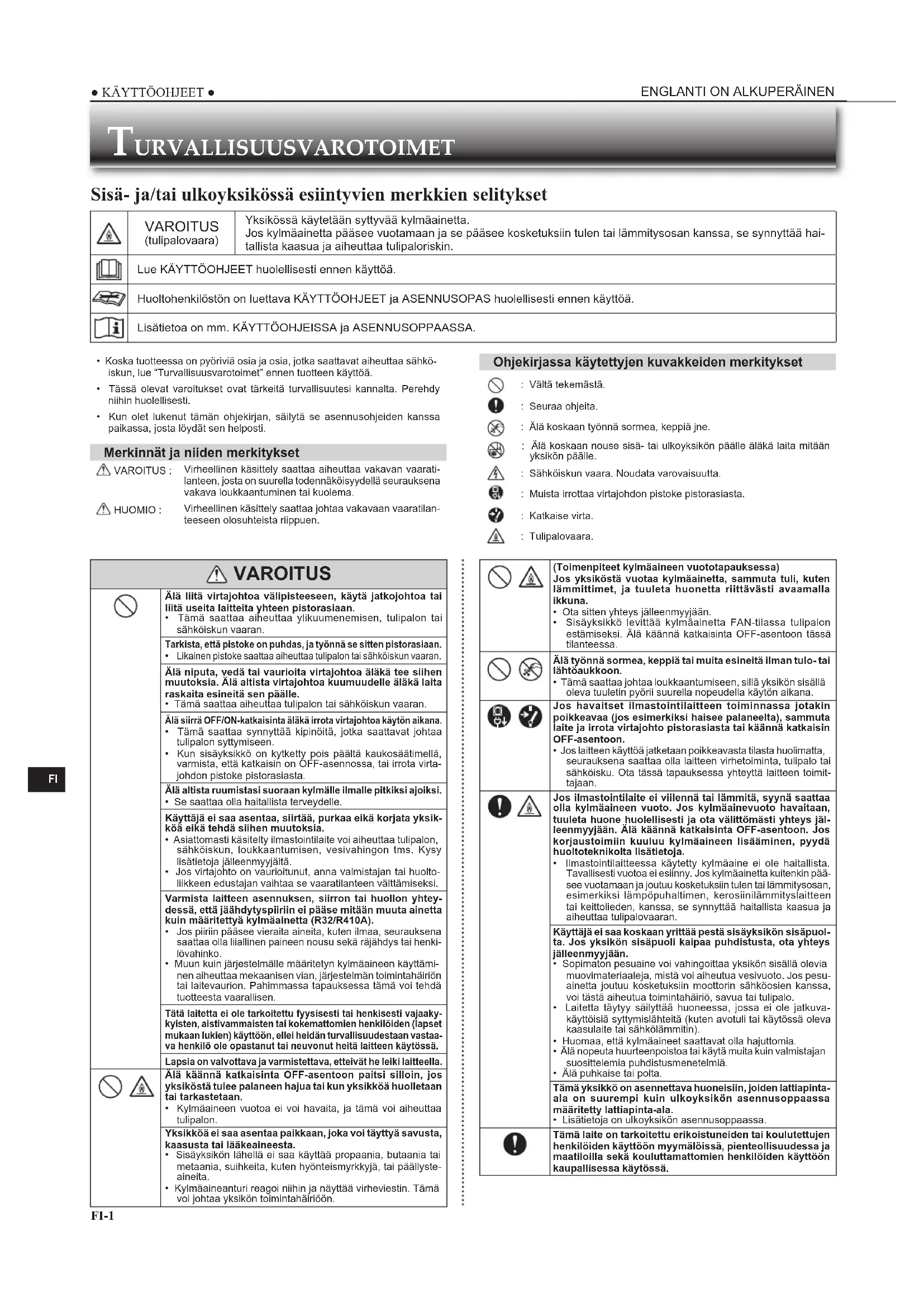 - Koska tuotteessa on pyöriviä osia ja osia, jotka saattavat aiheuttaa sähkö-iskun, lue “Turvallisuusvarotoimet” ennen tuotteen käyttöä.• Tässä olevat varoitukset ovat tärkeitä turvallisuutesi kannalta. Perehdy niihin huolellisesti.• Kun olet lukenut tämän ohjekirjan, säilytä se asennusohjeiden kanssa paikassa, josta löydät sen helposti. Merkinnät ja niiden merkitykset VAROITUS :Virheellinen käsittely saattaa aiheuttaa vakavan vaarati-lanteen, josta on suurella todennäköisyydellä seurauksena vakava loukkaantuminen tai kuolema. HUOMIO :Virheellinen käsittely saattaa johtaa vakavaan vaaratilan-teeseen olosuhteista riippuen. Ohjekirjassa käytettyjen kuvakkeiden merkitykset : Vältä tekemästä. : Seuraa ohjeita. : Älä koskaan työnnä sormea, keppiä jne. : Älä koskaan nouse sisä- tai ulkoyksikön päälle äläkä laita mitään yksikön päälle. : Sähköiskun vaara. Noudata varovaisuutta. : Muista irrottaa virtajohdon pistoke pistorasiasta. : Katkaise virta. : Tulipalovaara. VAROITUS Älä liitä virtajohtoa välipisteeseen, käytä jatkojohtoa tai liitä useita laitteita yhteen pistorasiaan.• Tämä saattaa aiheuttaa ylikuumenemisen, tulipalon tai sähköiskun vaaran.Tarkista, että pistoke on puhdas, ja työnnä se sitten pistorasiaan. Likainen pistoke saattaa aiheuttaa tulipalon tai sähköiskun vaaran.Älä niputa, vedä tai vaurioita virtajohtoa äläkä tee siihen muutoksia. Älä altista virtajohtoa kuumuudelle äläkä laita raskaita esineitä sen päälle.• Tämä saattaa aiheuttaa tulipalon tai sähköiskun vaaran.Älä siirrä OFF/ON-katkaisinta äläkä irrota virtajohtoa käytön aikana.• Tämä saattaa synnyttää kipinöitä, jotka saattavat johtaa tulipalon syttymiseen.• Kun sisäyksikkö on kytketty pois päältä kaukosäätimellä, varmista, että katkaisin on OFF-asennossa, tai irrota virta-johdon pistoke pistorasiasta. Älä altista ruumistasi suoraan kylmälle ilmalle pitkiksi ajoiksi.• Se saattaa olla haitallista terveydelle.Käyttäjä ei saa asentaa, siirtää, purkaa eikä korjata yksik-köä eikä tehdä siihen muutoksia.• Asiattomasti käsitelty ilmastointilaite voi aiheuttaa tulipalon, sähköiskun, loukkaantumisen, vesivahingon tms. Kysy lisätietoja jälleenmyyjältä.• Jos virtajohto on vaurioitunut, anna valmistajan tai huolto-liikkeen edustajan vaihtaa se vaaratilanteen välttämiseksi.Varmista laitteen asennuksen, siirron tai huollon yhtey-dessä, että jäähdytyspiiriin ei pääse mitään muuta ainetta kuin määritettyä kylmäainetta (R32/R410A). Jos piiriin pääsee vieraita aineita, kuten ilmaa, seurauksena saattaa olla liiallinen paineen nousu sekä räjähdys tai henki-lövahinko. • Muun kuin järjestelmälle määritetyn kylmäaineen käyttämi-nen aiheuttaa mekaanisen vian, järjestelmän toimintahäiriön tai laitevaurion. Pahimmassa tapauksessa tämä voi tehdä tuotteesta vaarallisen.Tätä laitetta ei ole tarkoitettu fyysisesti tai henkisesti vajaaky-kyisten, aistivammaisten tai kokemattomien henkilöiden (lapset mukaan lukien) käyttöön, ellei heidän turvallisuudestaan vastaa-va henkilö ole opastanut tai neuvonut heitä laitteen käytössä.Lapsia on valvottava ja varmistettava, etteivät he leiki laitteella. Älä käännä katkaisinta OFF-asentoon paitsi silloin, jos yksiköstä tulee palaneen hajua tai kun yksikköä huolletaan tai tarkastetaan.• Kylmäaineen vuotoa ei voi havaita, ja tämä voi aiheuttaa tulipalon.Yksikköä ei saa asentaa paikkaan, joka voi täyttyä savusta, kaasusta tai lääkeaineesta.• Sisäyksikön lähellä ei saa käyttää propaania, butaania tai metaania, suihkeita, kuten hyönteismyrkkyjä, tai päällyste-aineita.• Kylmäaineanturi reagoi niihin ja näyttää virheviestin. Tämä voi johtaa yksikön toimintahäiriöön. (Toimenpiteet kylmäaineen vuototapauksessa)Jos yksiköstä vuotaa kylmäainetta, sammuta tuli, kuten lämmittimet, ja tuuleta huonetta riittävästi avaamalla ikkuna.• Ota sitten yhteys jälleenmyyjään.• Sisäyksikkö levittää kylmäainetta FAN-tilassa tulipalon estämiseksi. Älä käännä katkaisinta OFF-asentoon tässä tilanteessa. Älä työnnä sormea, keppiä tai muita esineitä ilman tulo- tai lähtöaukkoon.• Tämä saattaa johtaa loukkaantumiseen, sillä yksikön sisällä oleva tuuletin pyörii suurella nopeudella käytön aikana. Jos havaitset ilmastointilaitteen toiminnassa jotakin poikkeavaa (jos esimerkiksi haisee palaneelta), sammuta laite ja irrota virtajohto pistorasiasta tai käännä katkaisin OFF-asentoon.• Jos laitteen käyttöä jatketaan poikkeavasta tilasta huolimatta, seurauksena saattaa olla laitteen virhetoiminta, tulipalo tai sähköisku. Ota tässä tapauksessa yhteyttä laitteen toimit-tajaan. Jos ilmastointilaite ei viilennä tai lämmitä, syynä saattaa olla kylmäaineen vuoto. Jos kylmäainevuoto havaitaan, tuuleta huone huolellisesti ja ota välittömästi yhteys jäl-leenmyyjään. Älä käännä katkaisinta OFF-asentoon. Jos korjaustoimiin kuuluu kylmäaineen lisääminen, pyydä huoltoteknikolta lisätietoja.• Ilmastointilaitteessa käytetty kylmäaine ei ole haitallista. Tavallisesti vuotoa ei esiinny. Jos kylmäainetta kuitenkin pää-see vuotamaan ja joutuu kosketuksiin tulen tai lämmitysosan, esimerkiksi lämpöpuhaltimen, kerosiinilämmityslaitteen tai keittolieden, kanssa, se synnyttää haitallista kaasua ja aiheuttaa tulipalovaaran.Käyttäjä ei saa koskaan yrittää pestä sisäyksikön sisäpuol-ta. Jos yksikön sisäpuoli kaipaa puhdistusta, ota yhteys jälleenmyyjään.• Sopimaton pesuaine voi vahingoittaa yksikön sisällä olevia muovimateriaaleja, mistä voi aiheutua vesivuoto. Jos pesu-ainetta joutuu kosketuksiin moottorin sähköosien kanssa, voi tästä aiheutua toimintahäiriö, savua tai tulipalo.• Laitetta täytyy säilyttää huoneessa, jossa ei ole jatkuva-käyttöisiä syttymislähteitä (kuten avotuli tai käytössä oleva kaasulaite tai s